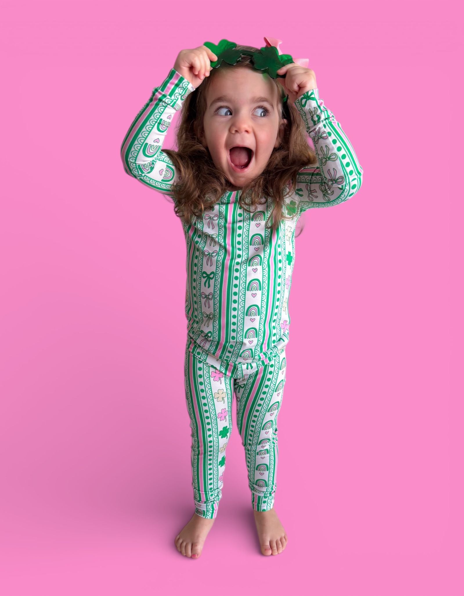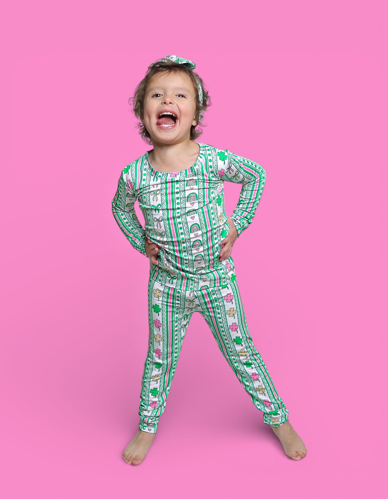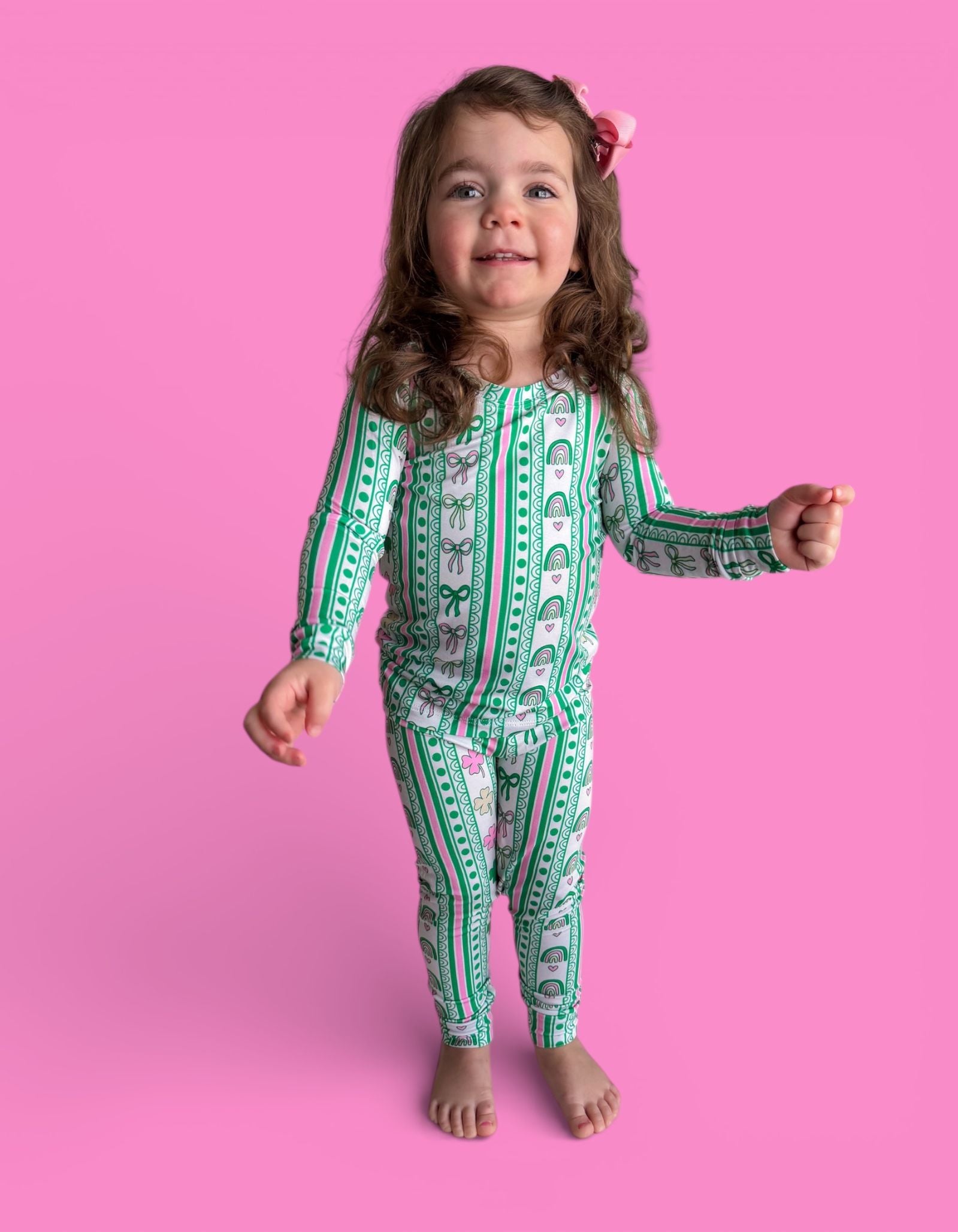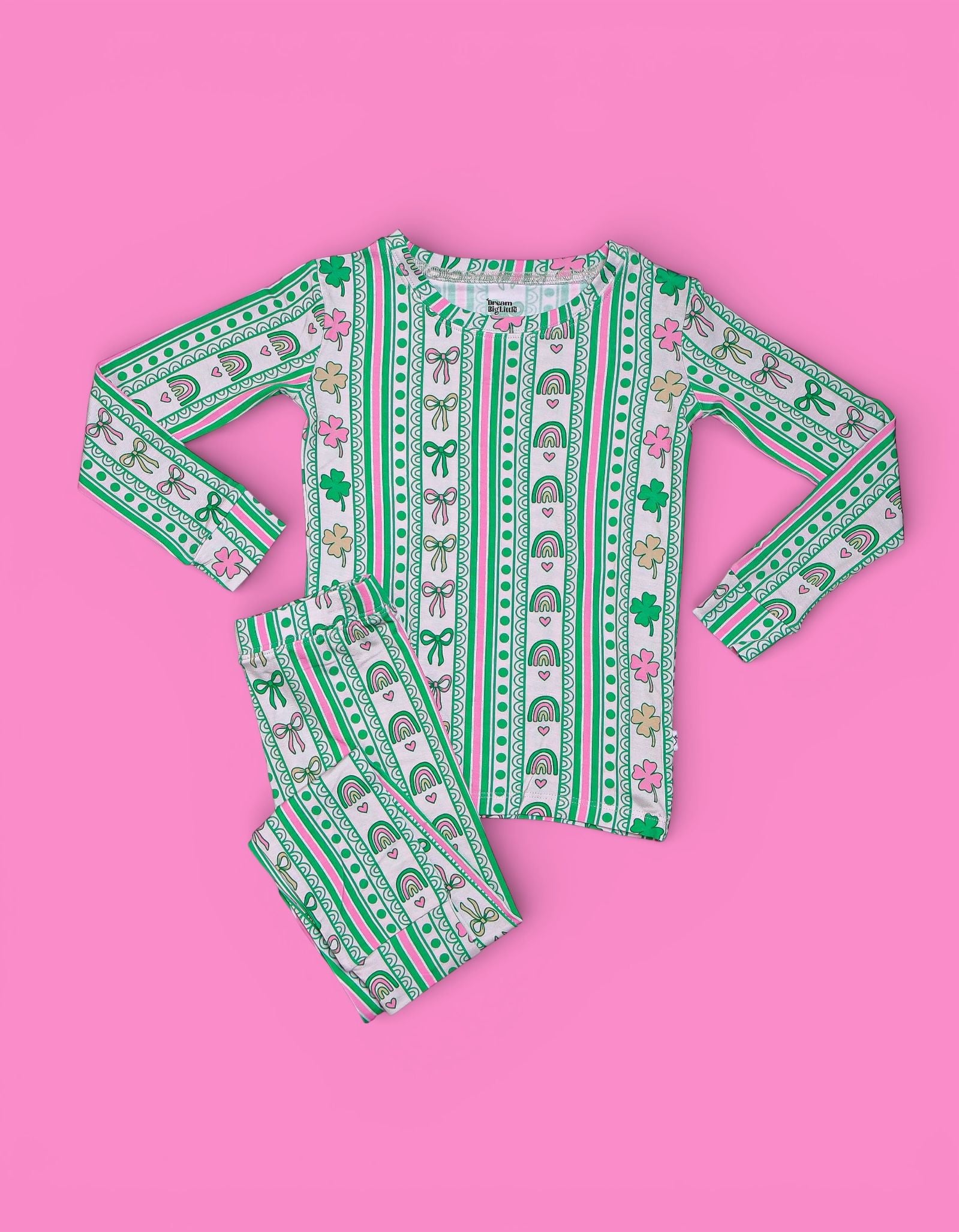Bright, sweet, and full of festive charm, the Lucky Rainbow Ribbons Dream Set features matching top-and-bottom pieces decorated with rows of rainbows, shamrocks, bows, and hearts in cheerful greens and soft pinks. Soft, stretchy, and perfect for play, sleep, and celebrating St. Patrick’s Day in adorable style, this set brings a fun and girly twist to lucky-season matching. 💚✨