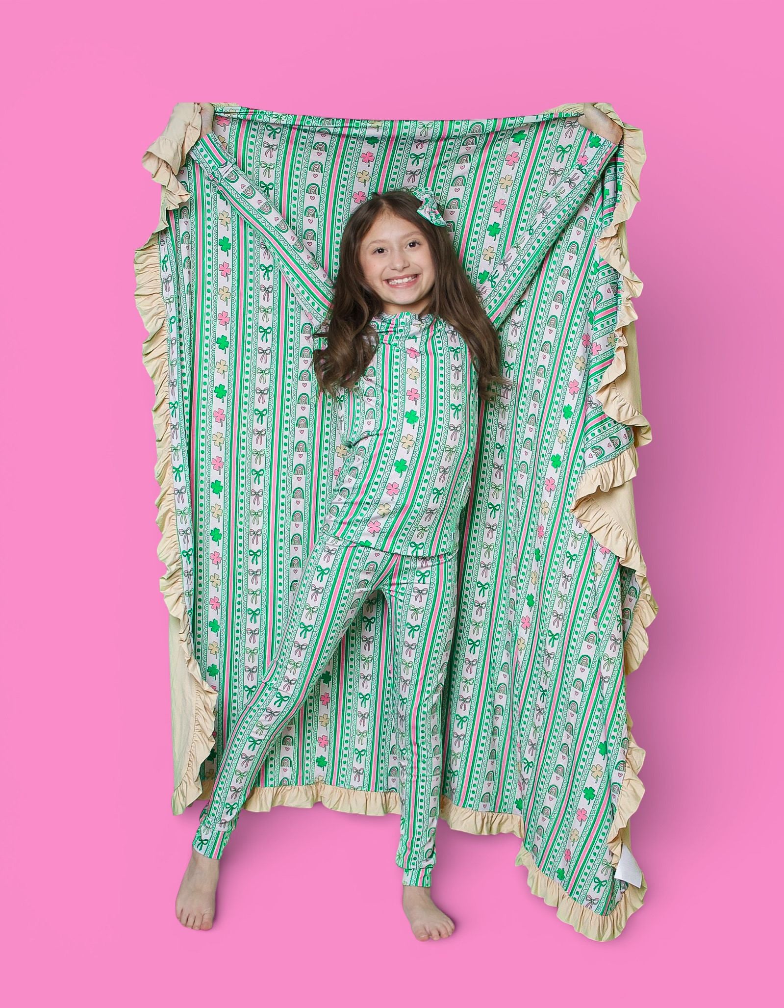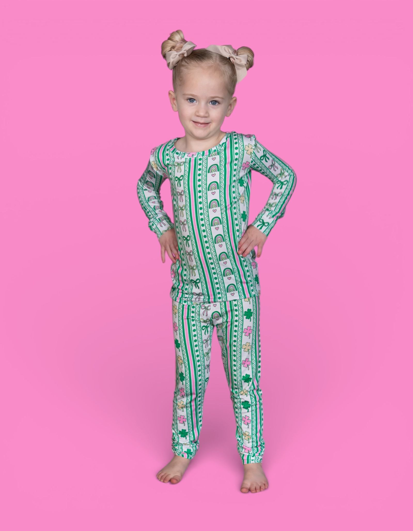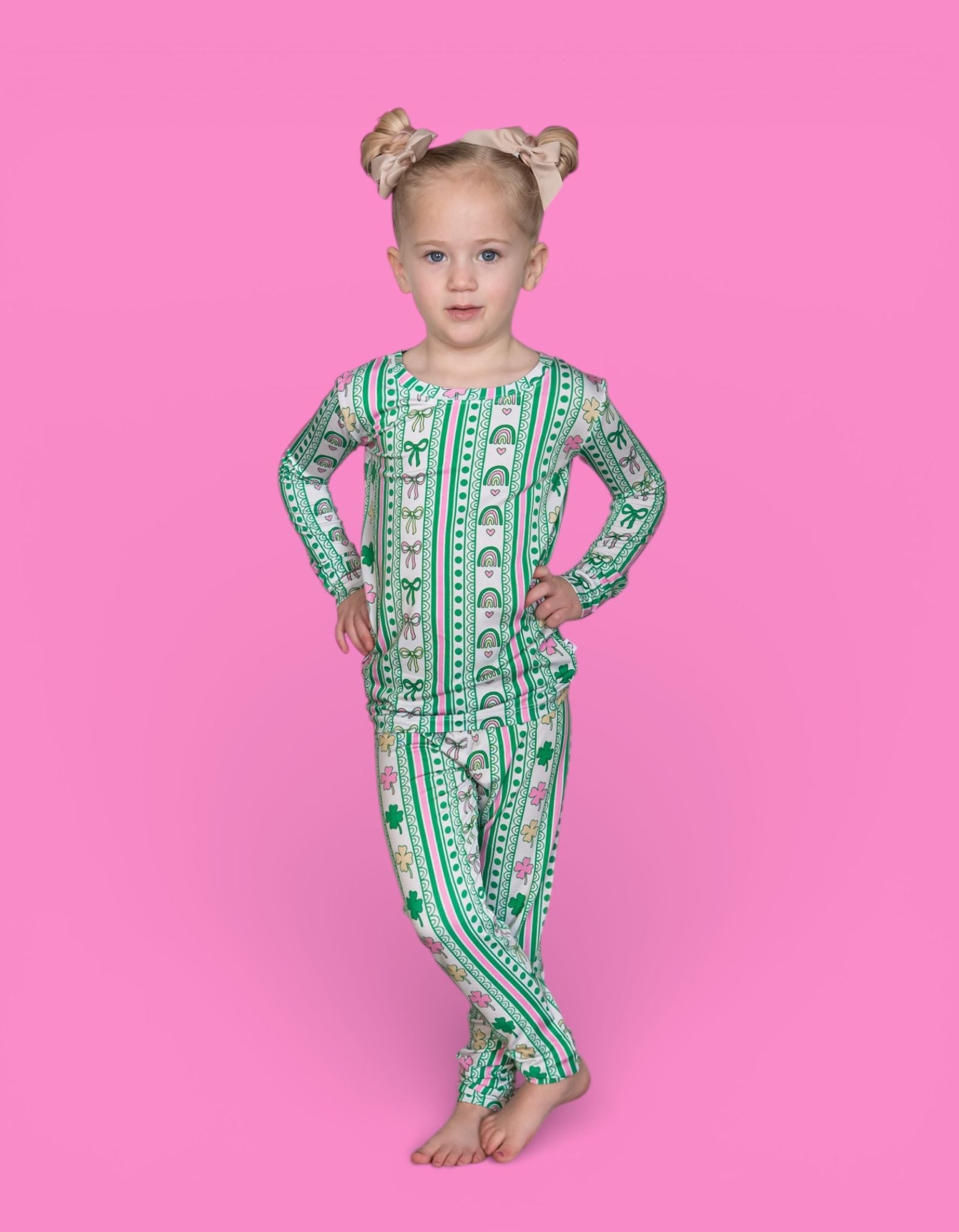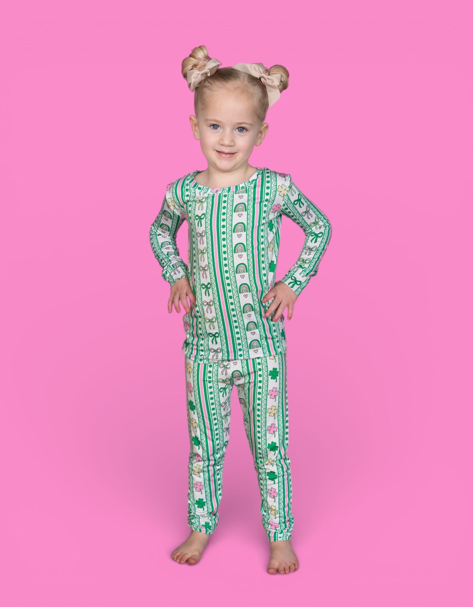 Bright, sweet, and full of festive charm, the Lucky Rainbow Ribbons Dream Set features matching top-and-bottom pieces decorated with rows of rainbows, shamrocks, bows, and hearts in cheerful greens and soft pinks. Soft, stretchy, and perfect for play, sleep, and celebrating St. Patrick’s Day in adorable style, this set brings a fun and girly twist to lucky-season matching. 💚✨