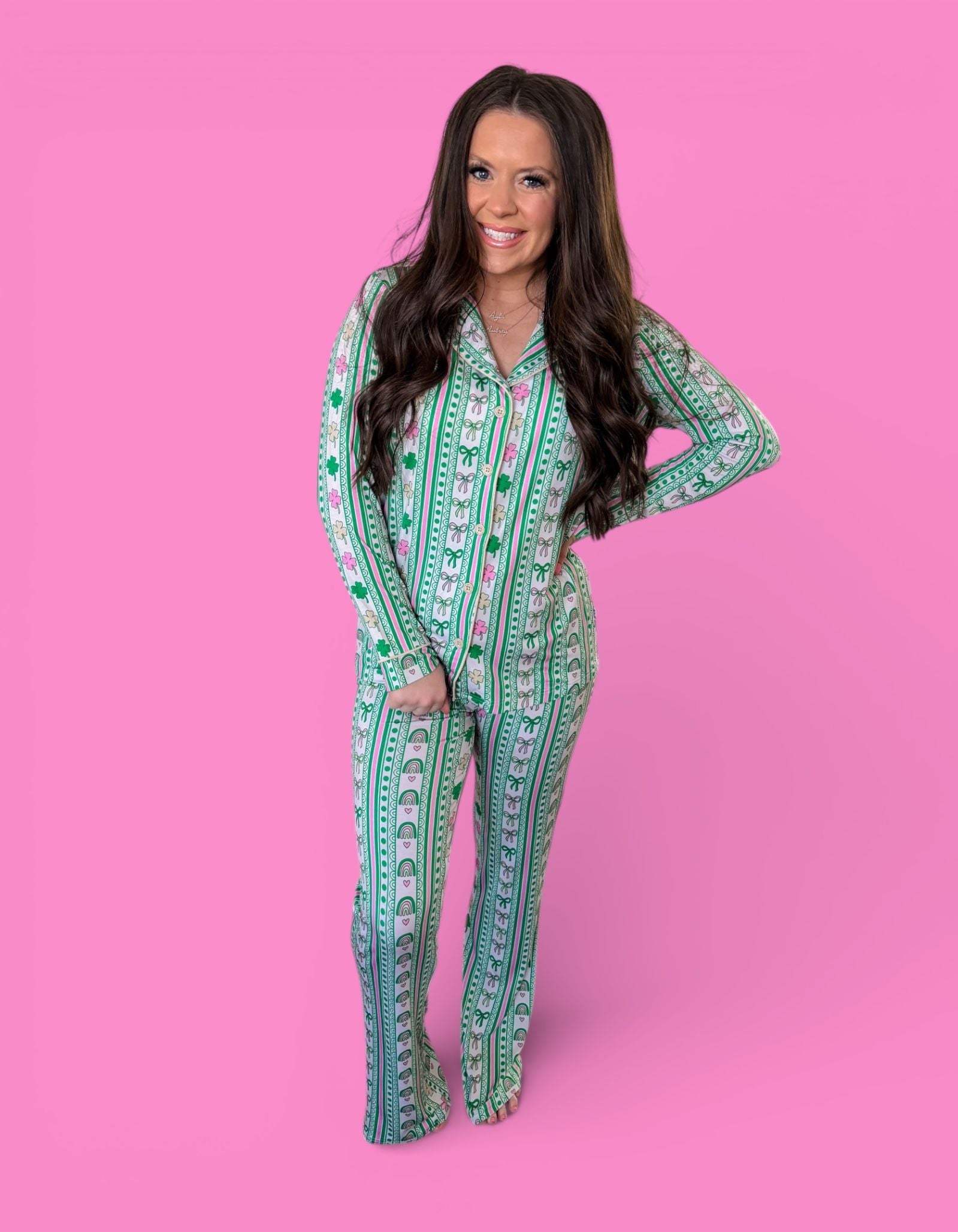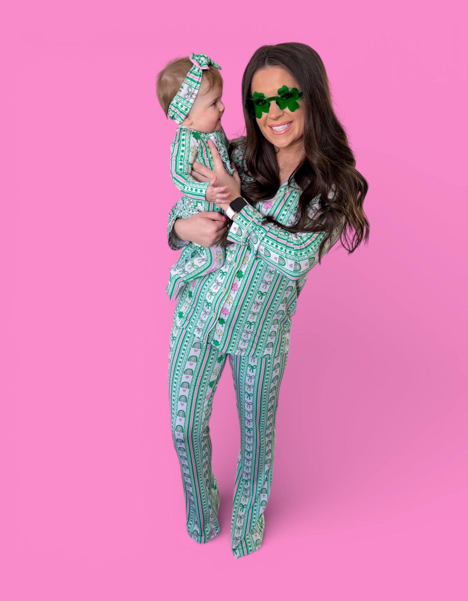 Cute, comfy, and full of festive charm, the Lucky Rainbow Ribbons Women’s Dream Flare Set features cheerful stripes of rainbows, shamrocks, bows, and hearts in bright greens and soft pinks, paired with flattering, stretchy flare pants for an effortless matching look. Perfect for St. Patrick’s Day photos, cozy lounging, and sweet mom-and-mini moments, this set brings a fun, girly twist to lucky-season comfort. 💚✨