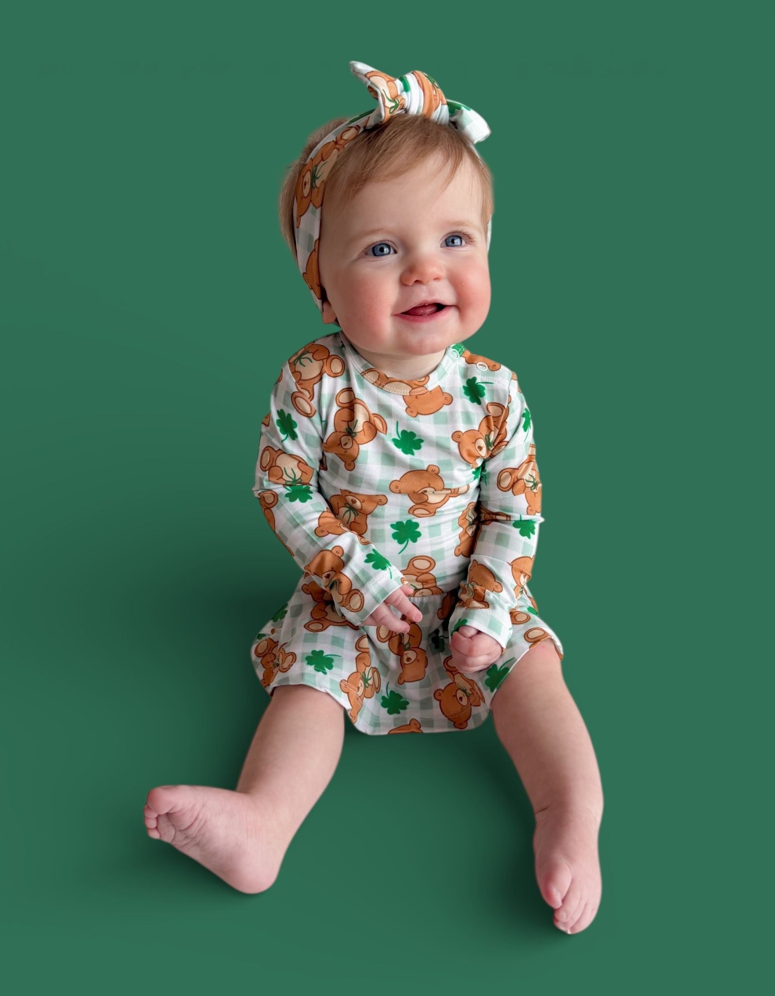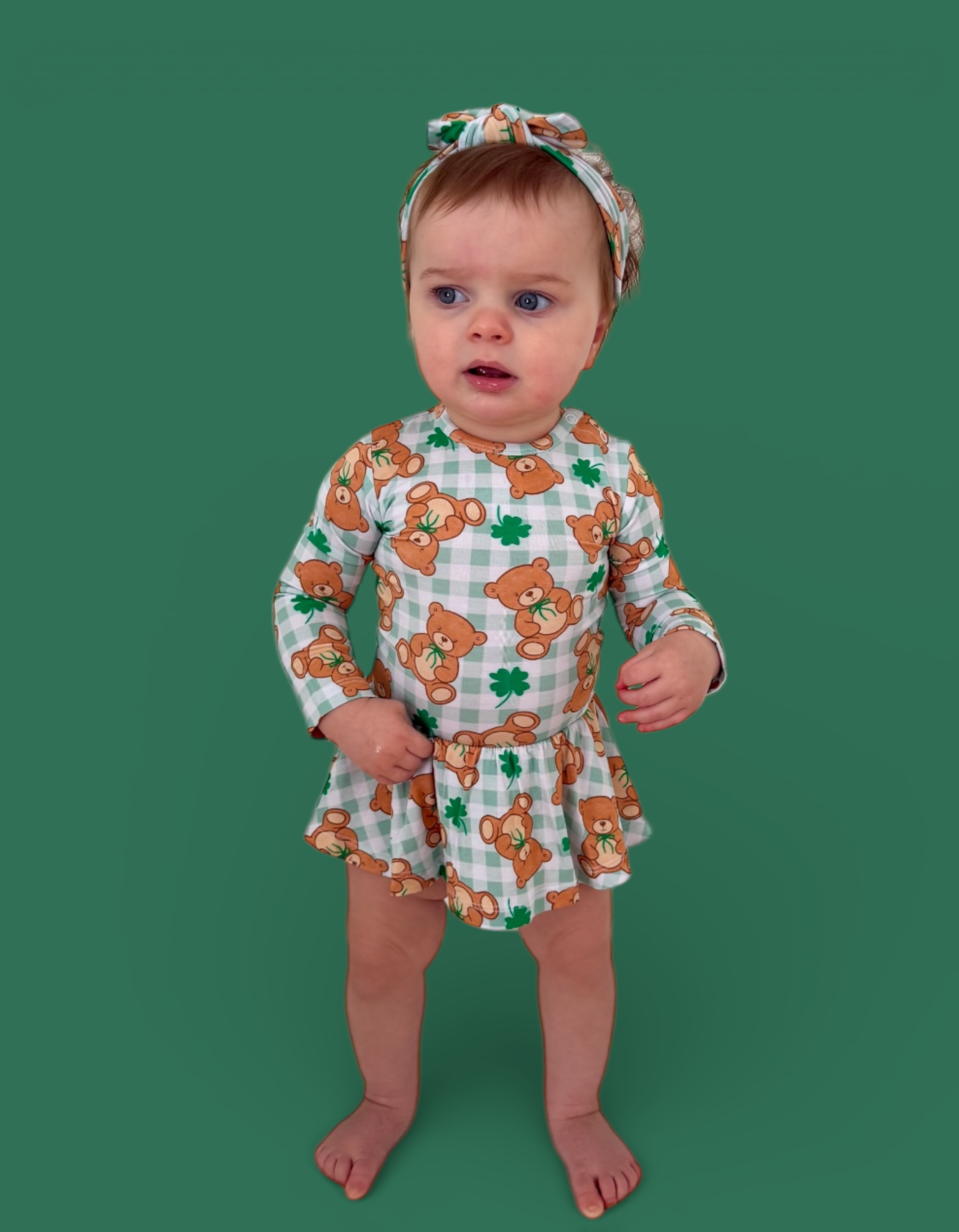 The sweetest little swirl of luck and charm! This bodysuit dress features a green gingham backdrop with playful teddy bears and lucky clovers, paired with an attached bodysuit for easy changes and all-day comfort. Perfect for St. Patrick’s Day outfits, adorable twirls, and picture-perfect moments. 💚☘️