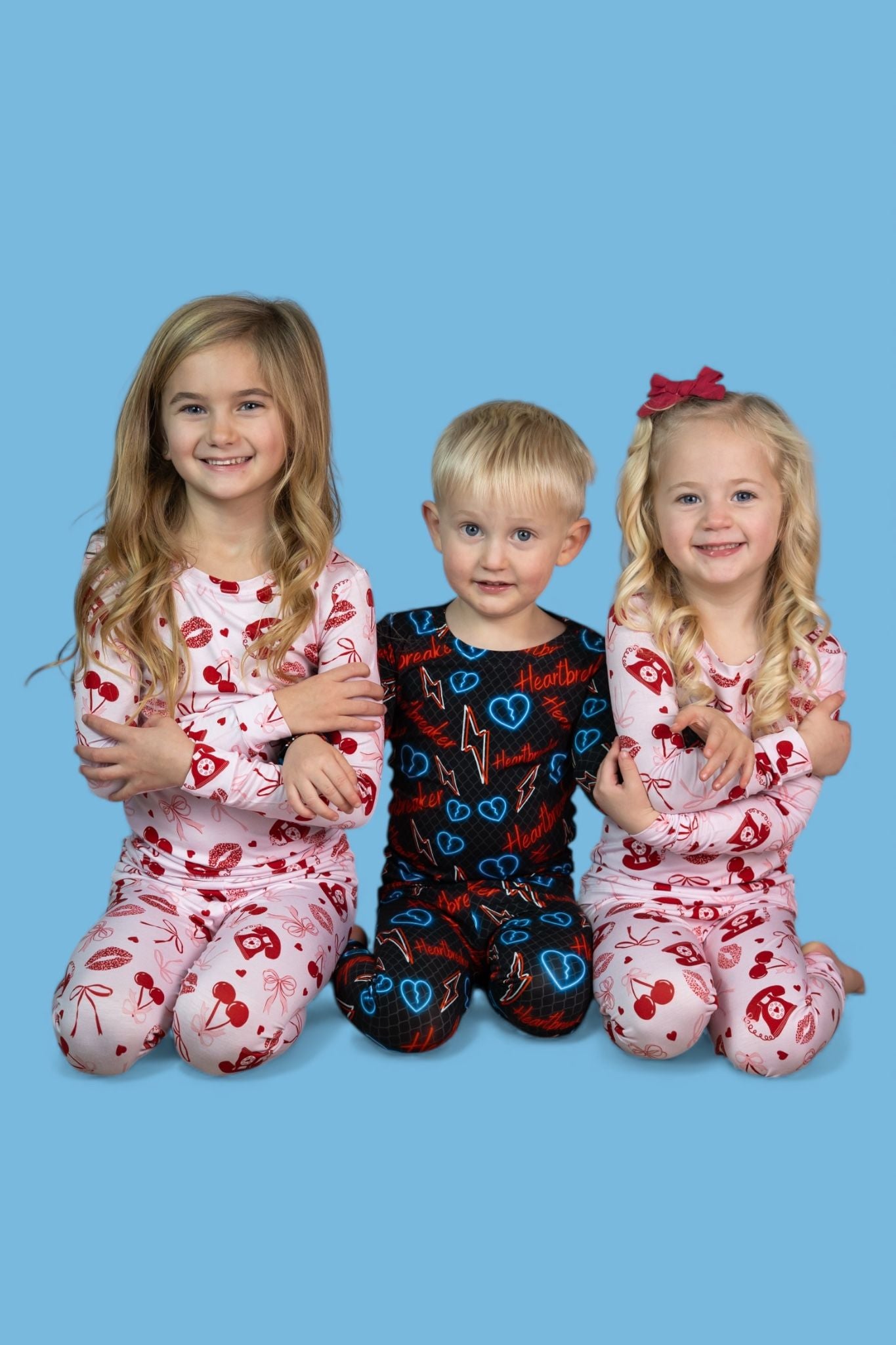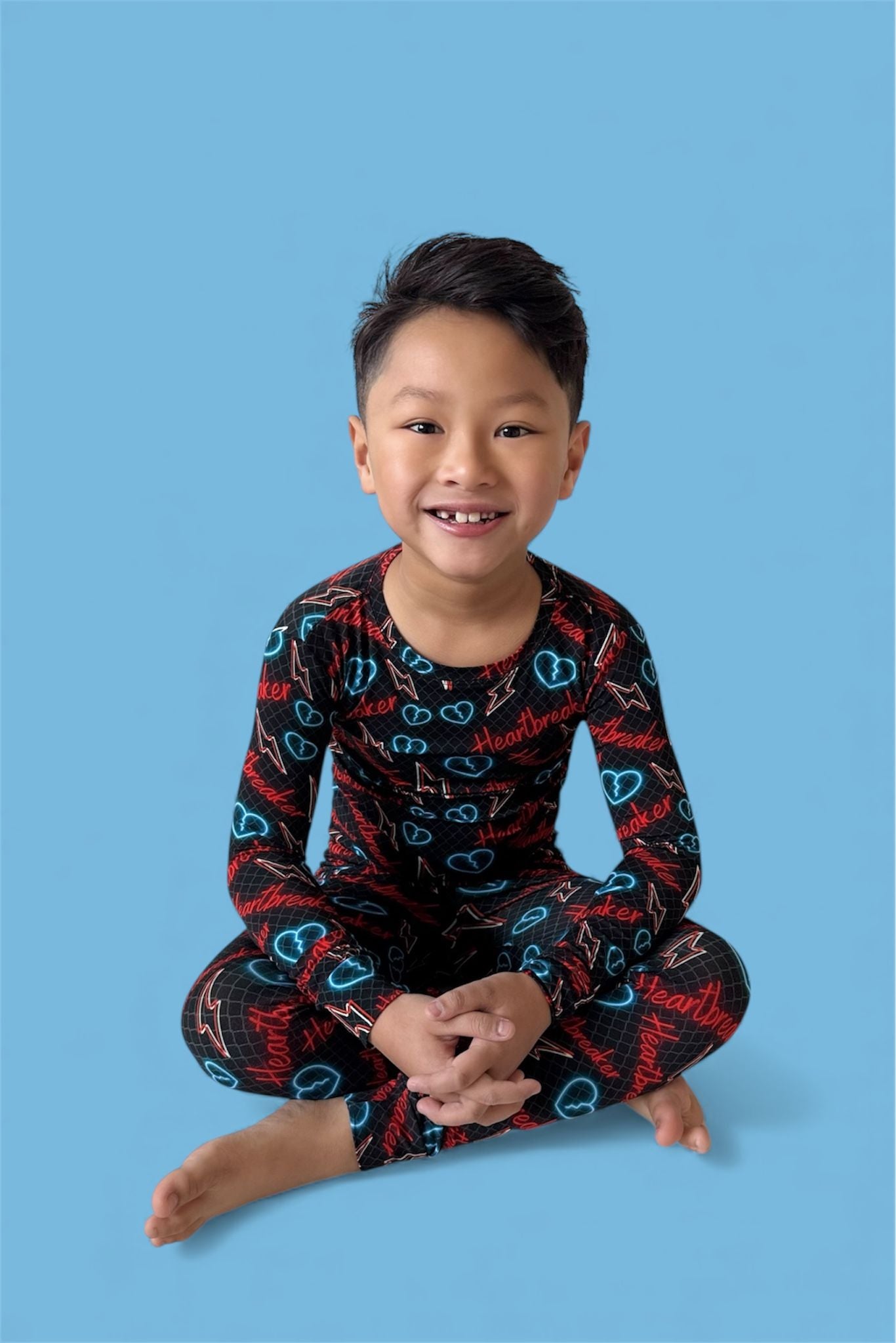 Cozy meets cool! The Heartbreaker Dream Set features a long sleeve top and matching pants with a striking neon-style print of glowing hearts, lightning bolts, and “Heartbreaker” script. Crafted from our signature buttery-soft bamboo fabric, this set is breathable, stretchy, and perfect for sleep, play, or lounging in style.