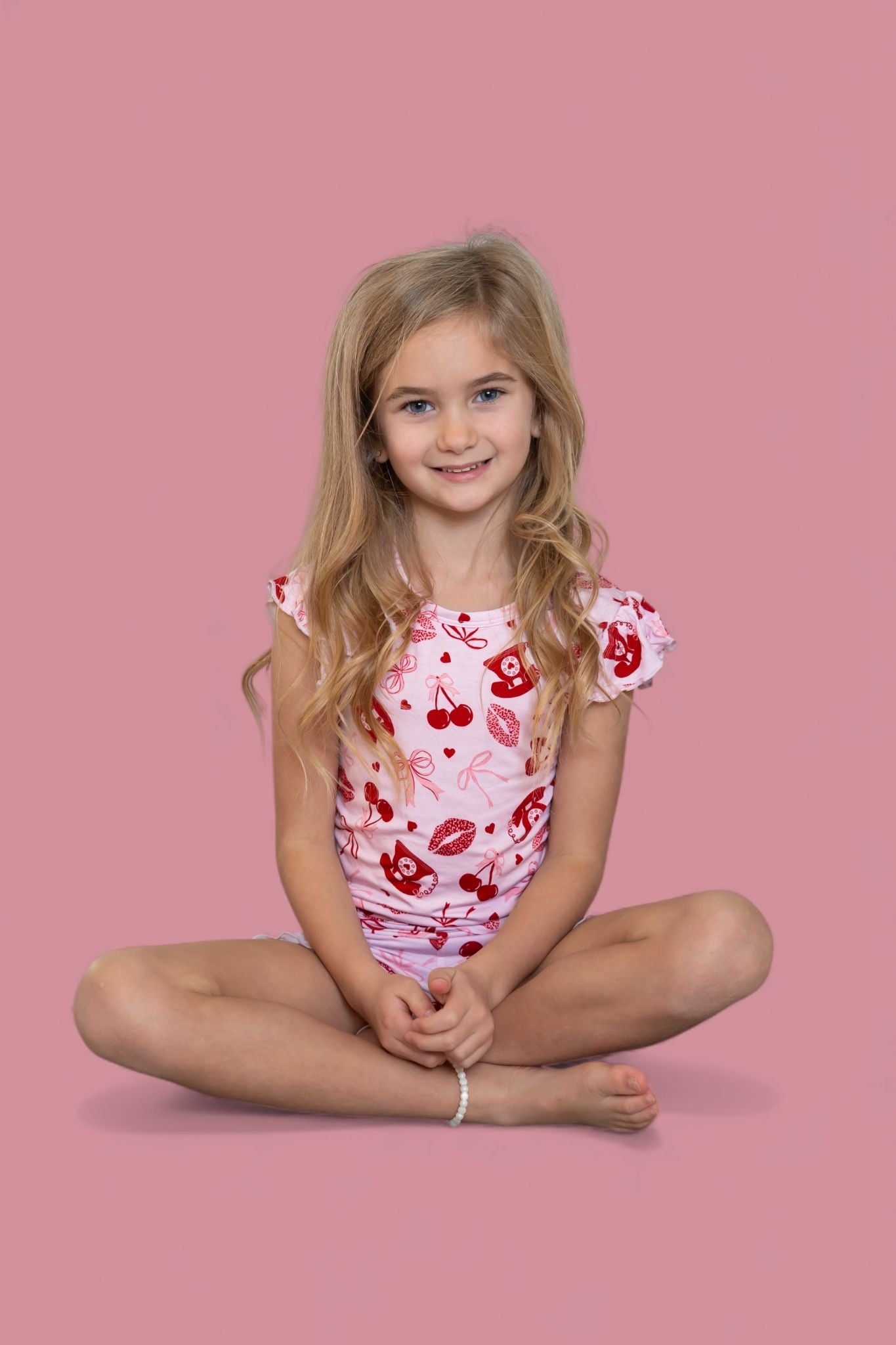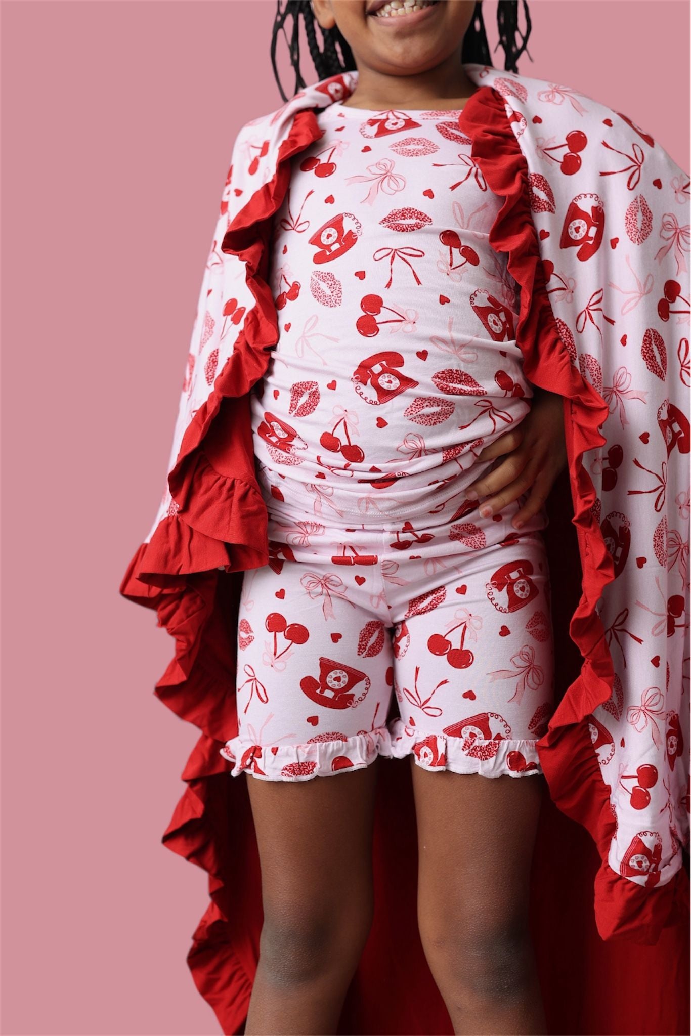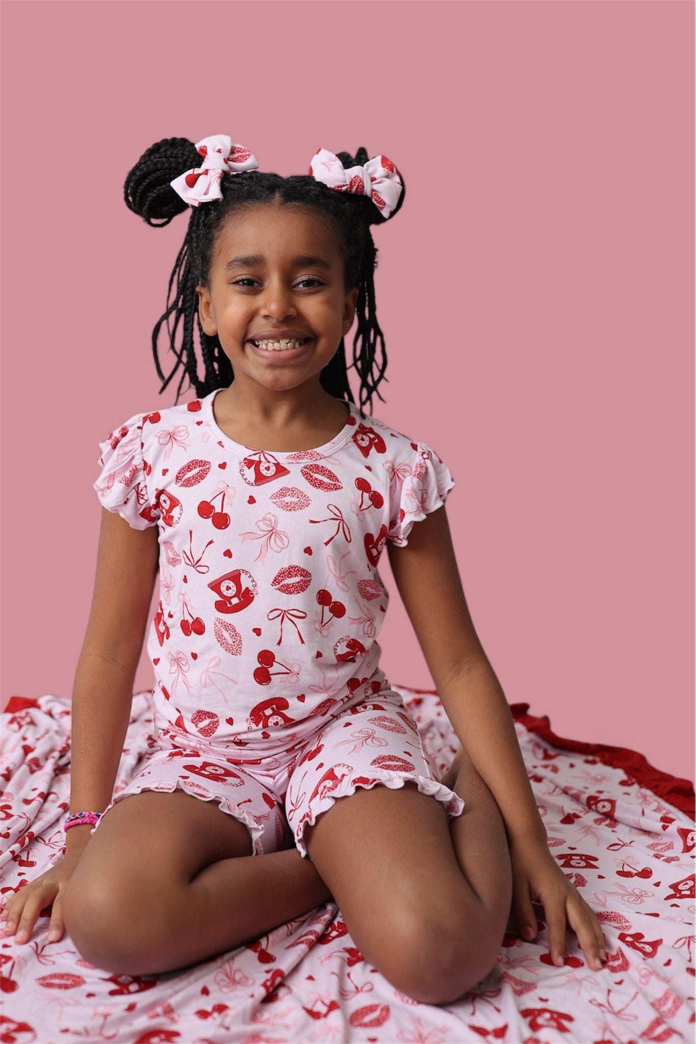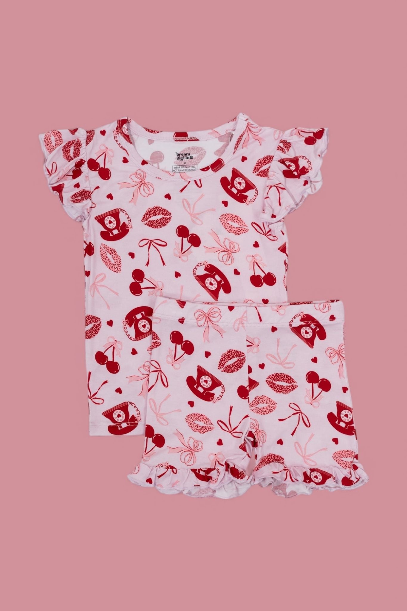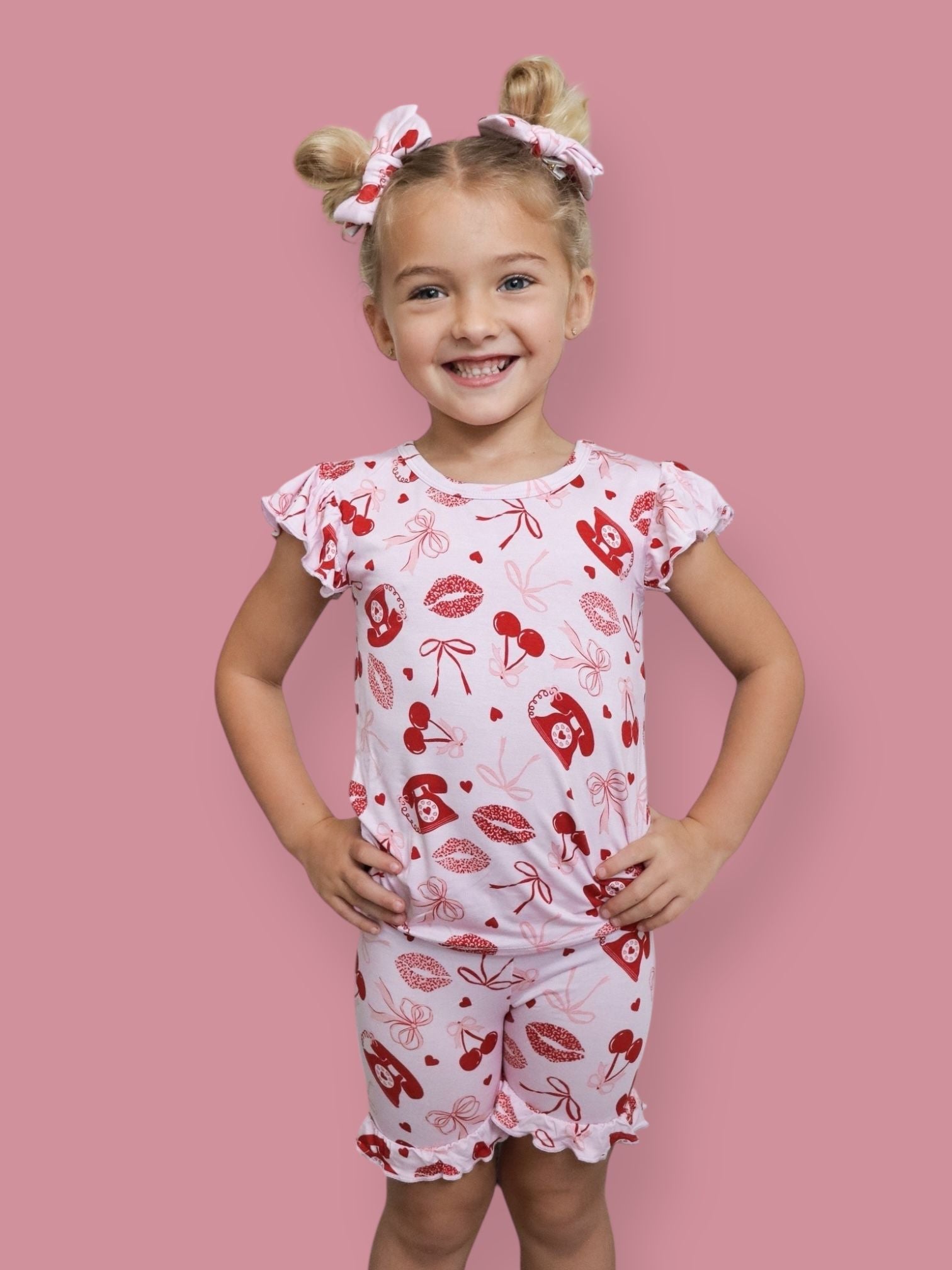 Play all day in heart-filled style! Our Sealed With Love Dream Ruffle Short Set pairs a buttery-soft bamboo top with matching ruffle-trimmed shorts, featuring our whimsical print of retro telephones, kissy lips, bows, and cherries. Lightweight and breathable, this set is perfect for warm days, bedtime, or lounging in vintage-Valentine vibes.