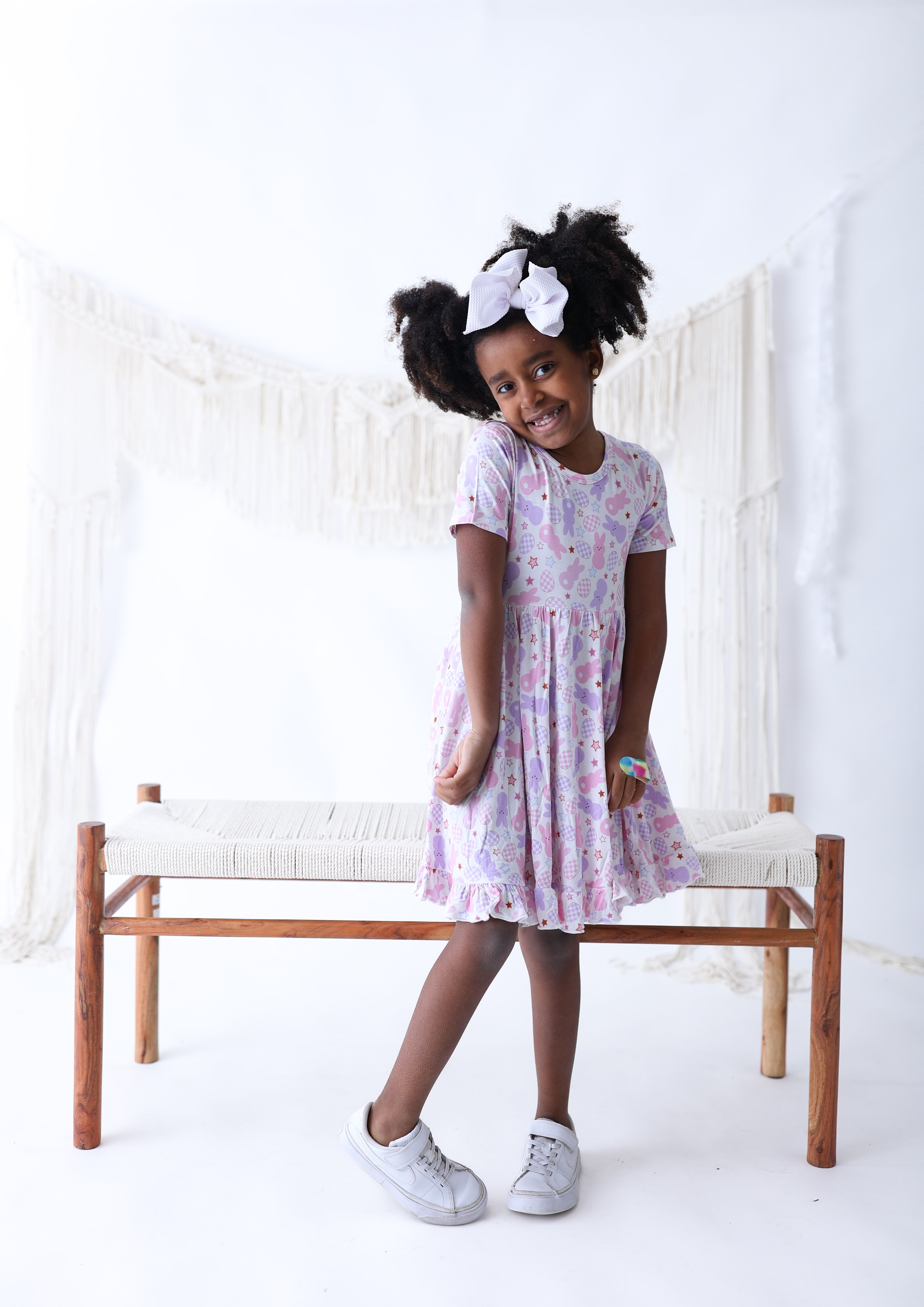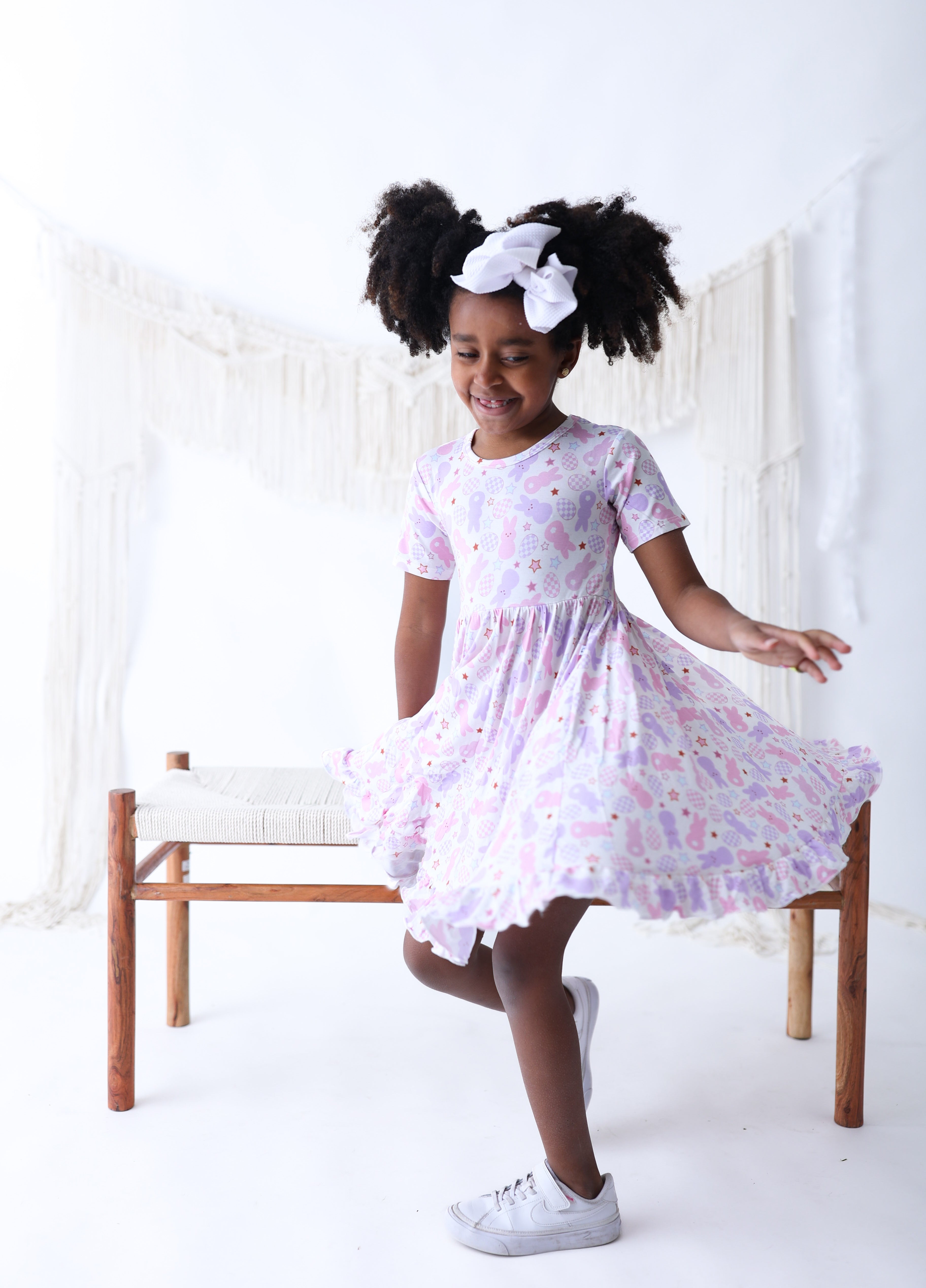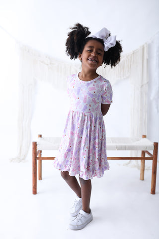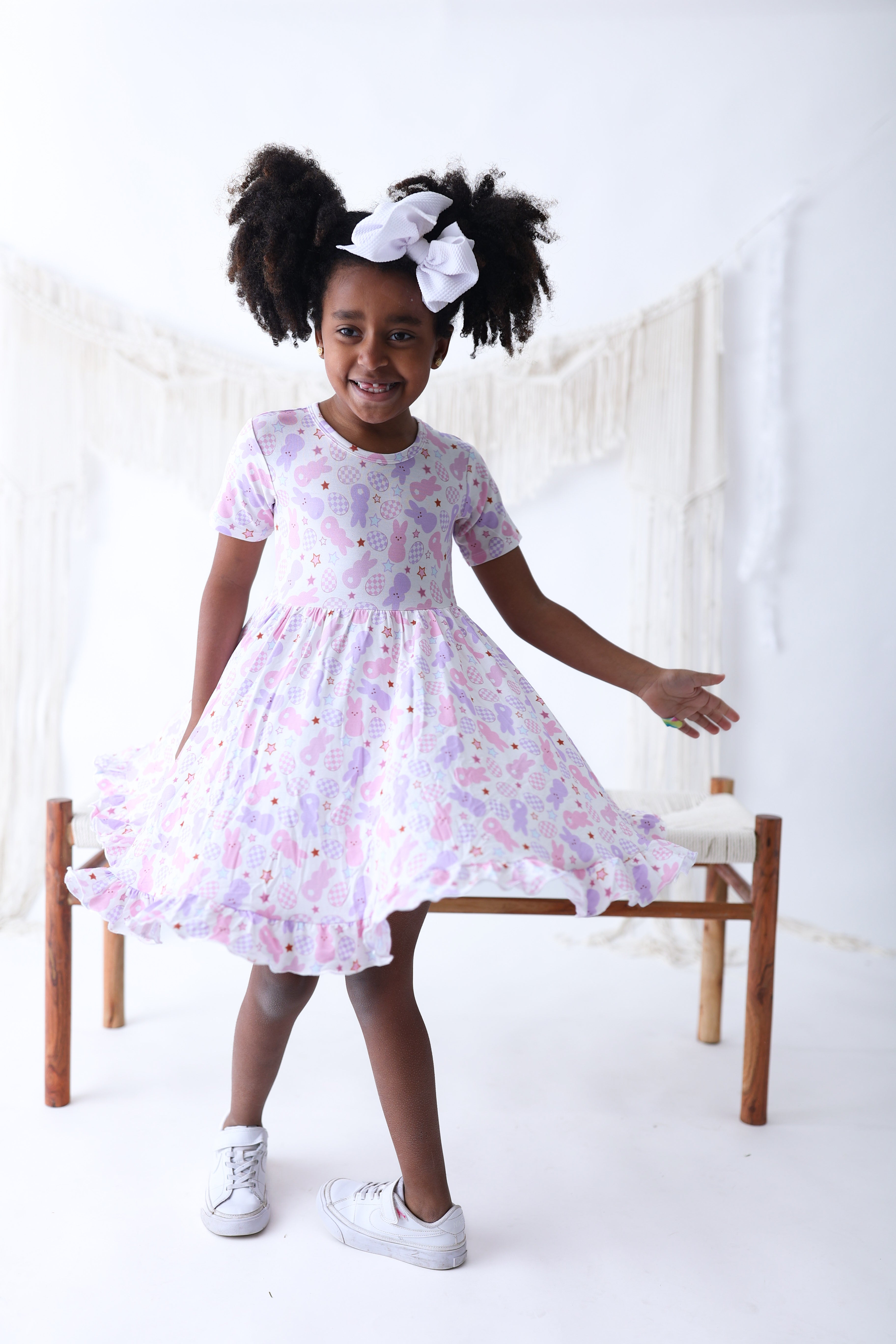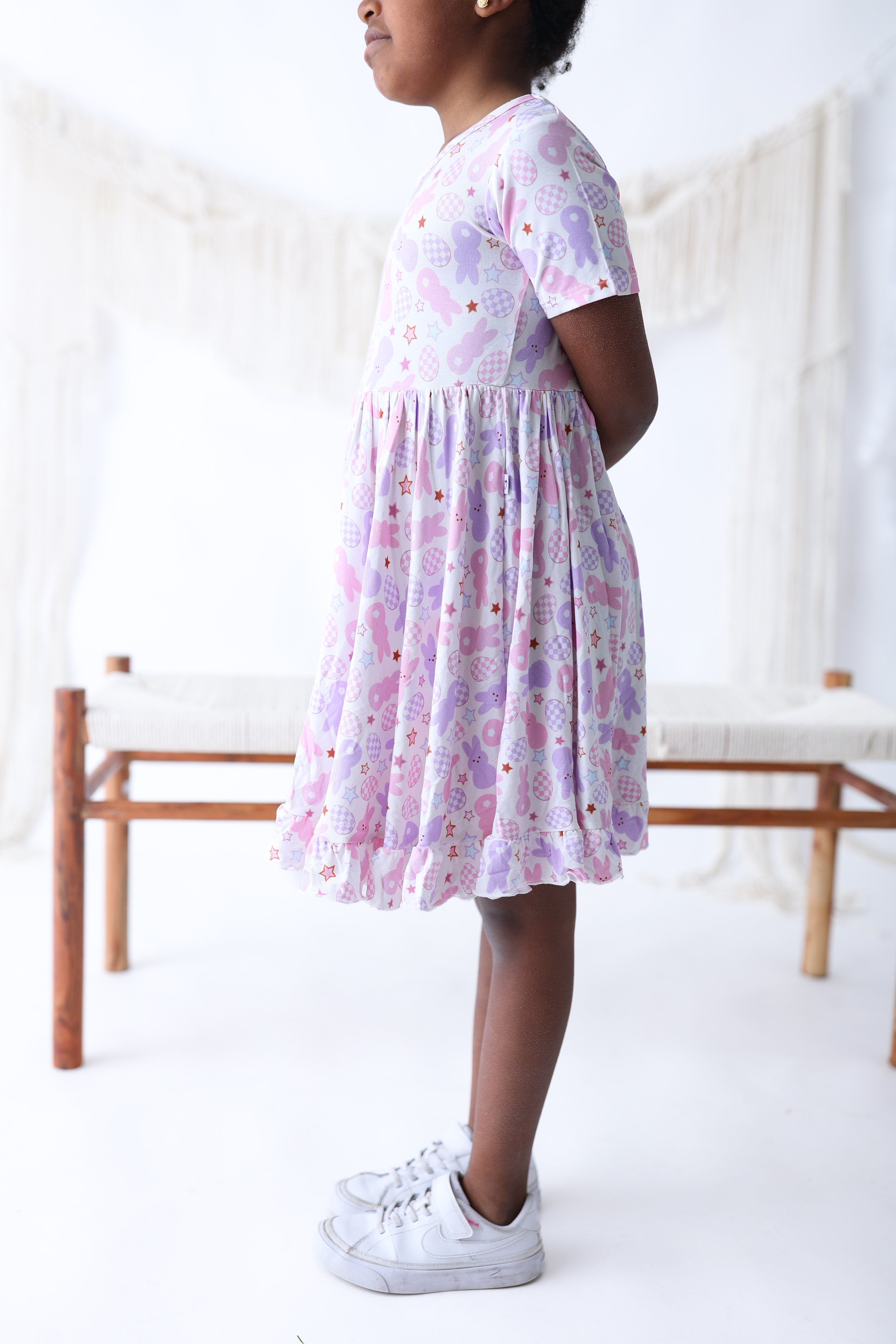 Be the cutest bunny in this Cotton Tail Cutie Dream Ruffle Dress! Featuring playful ruffles and a charming Easter print, this short-sleeved dress is made of soft and comfortable bamboo material. Hop into style with this pastel purple dress perfect for Easter egg hunting. Hop to it!