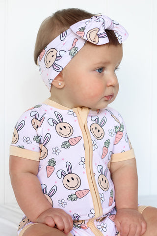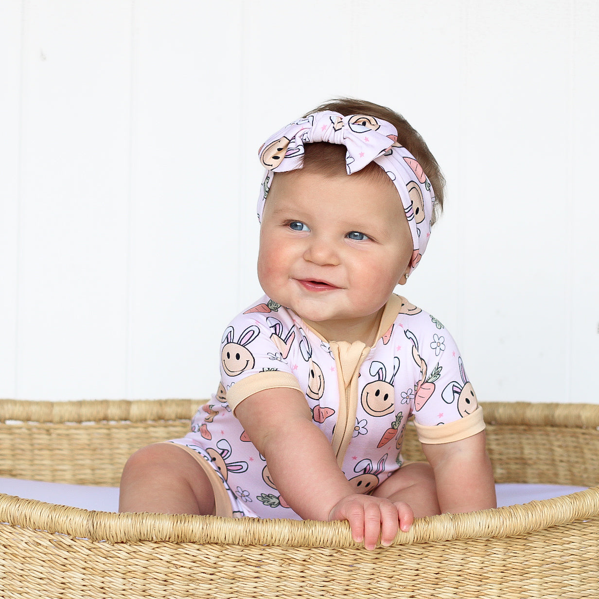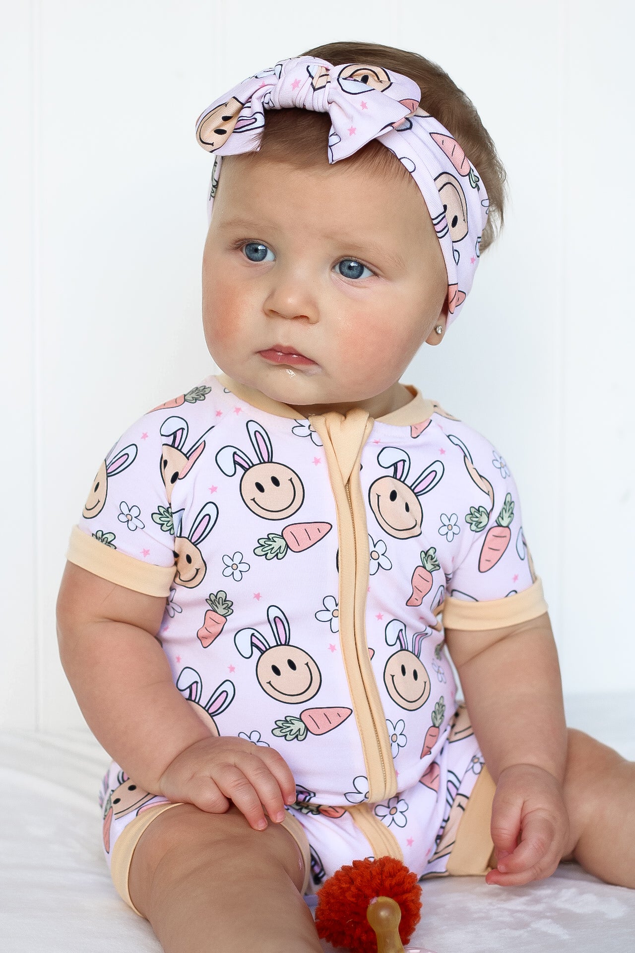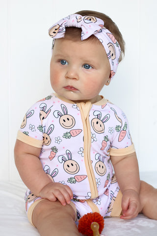 Get ready to HOP into style with our shortie romper! Made from soft bamboo material, this romper is both fun and comfortable. Featuring a festive Easter print with eggs and carrots, you'll be the talk of the holiday (and the most comfortable too)! So don't wait, hop to it and add this dreamy shortie to your wardrobe.
