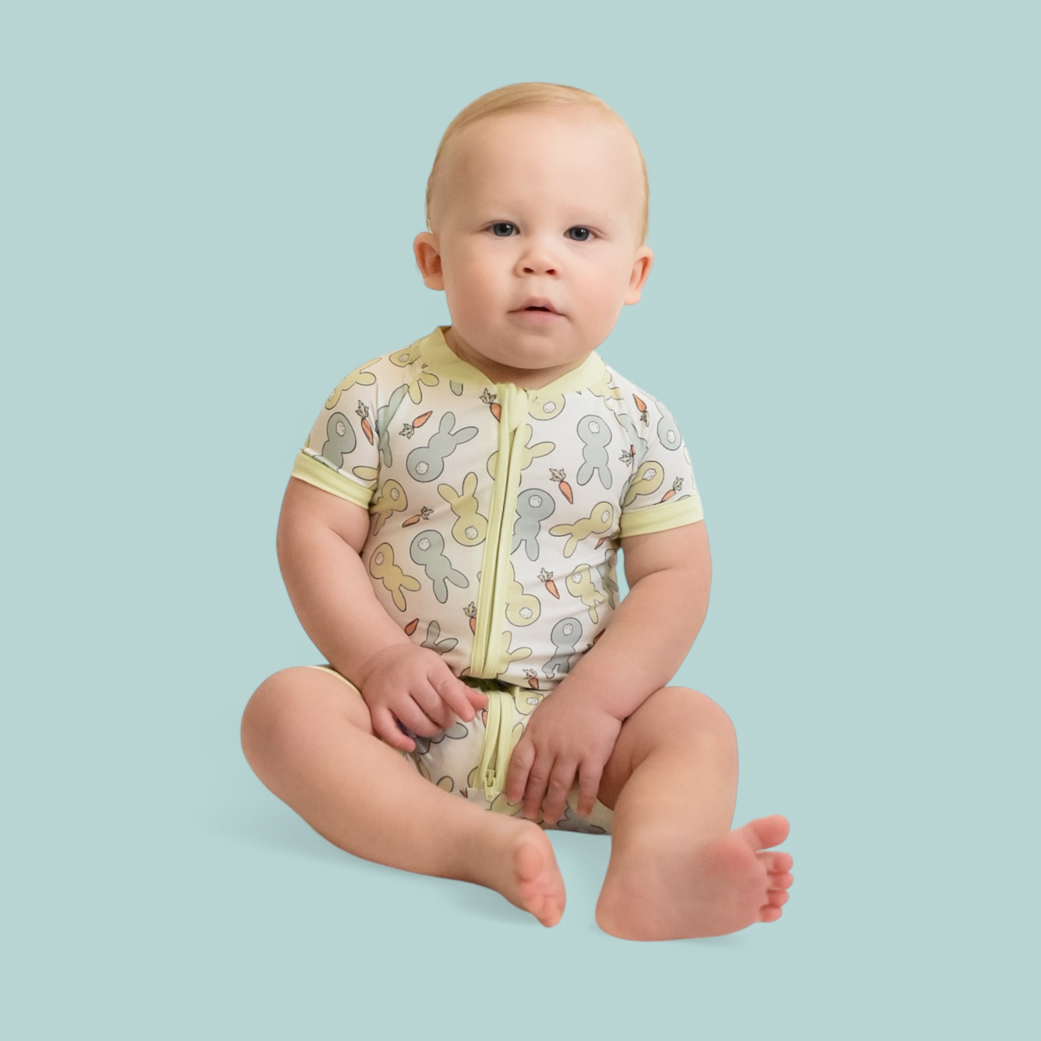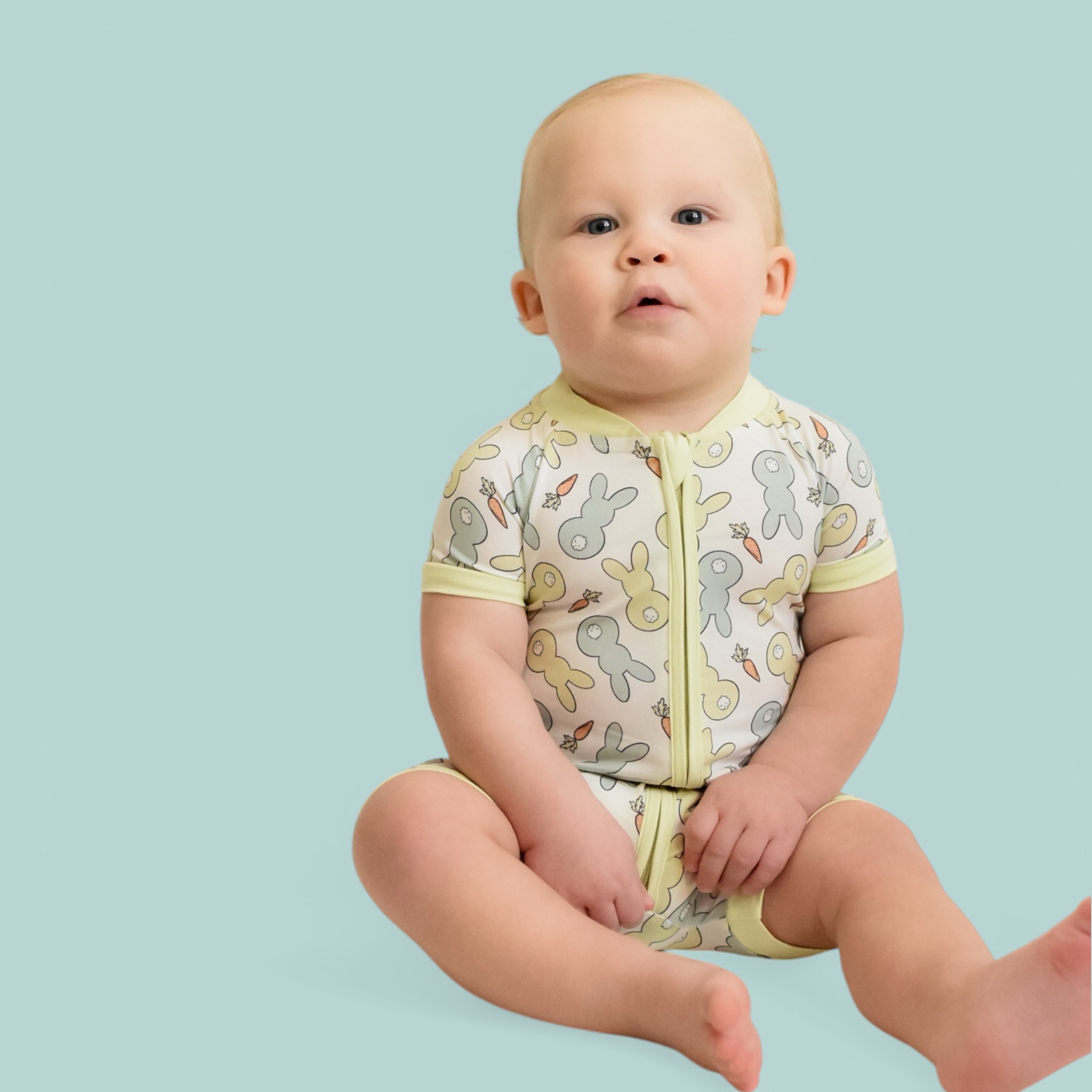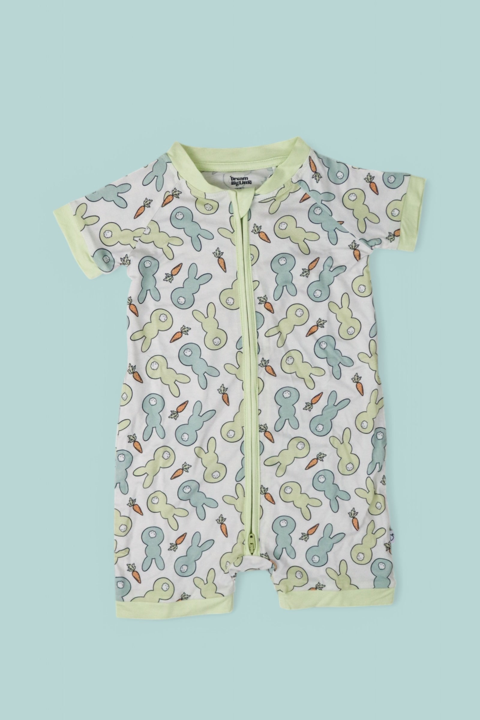 The Hoppity Tails Dream Shortie brings a playful and cozy touch to your little one's spring wardrobe! Featuring a cute pattern of pastel bunnies with fluffy white tails and vibrant orange carrots, this shortie is as charming as it is comfy. The whimsical design is set against a lightly speckled cream background for a fun, fresh feel.