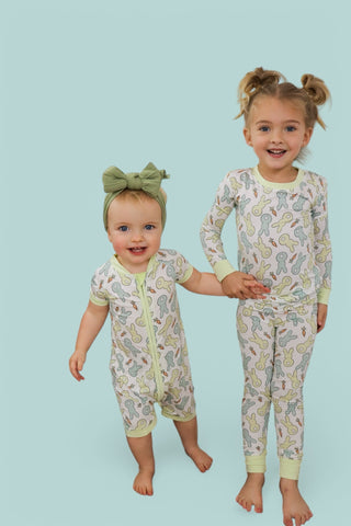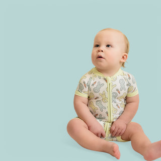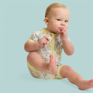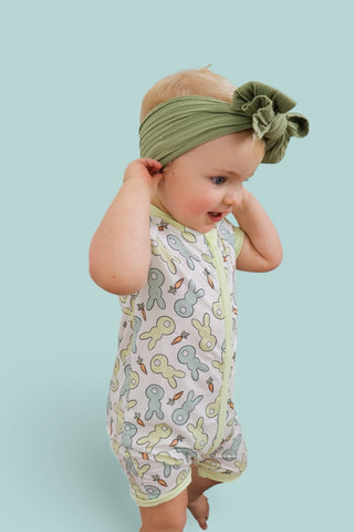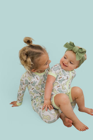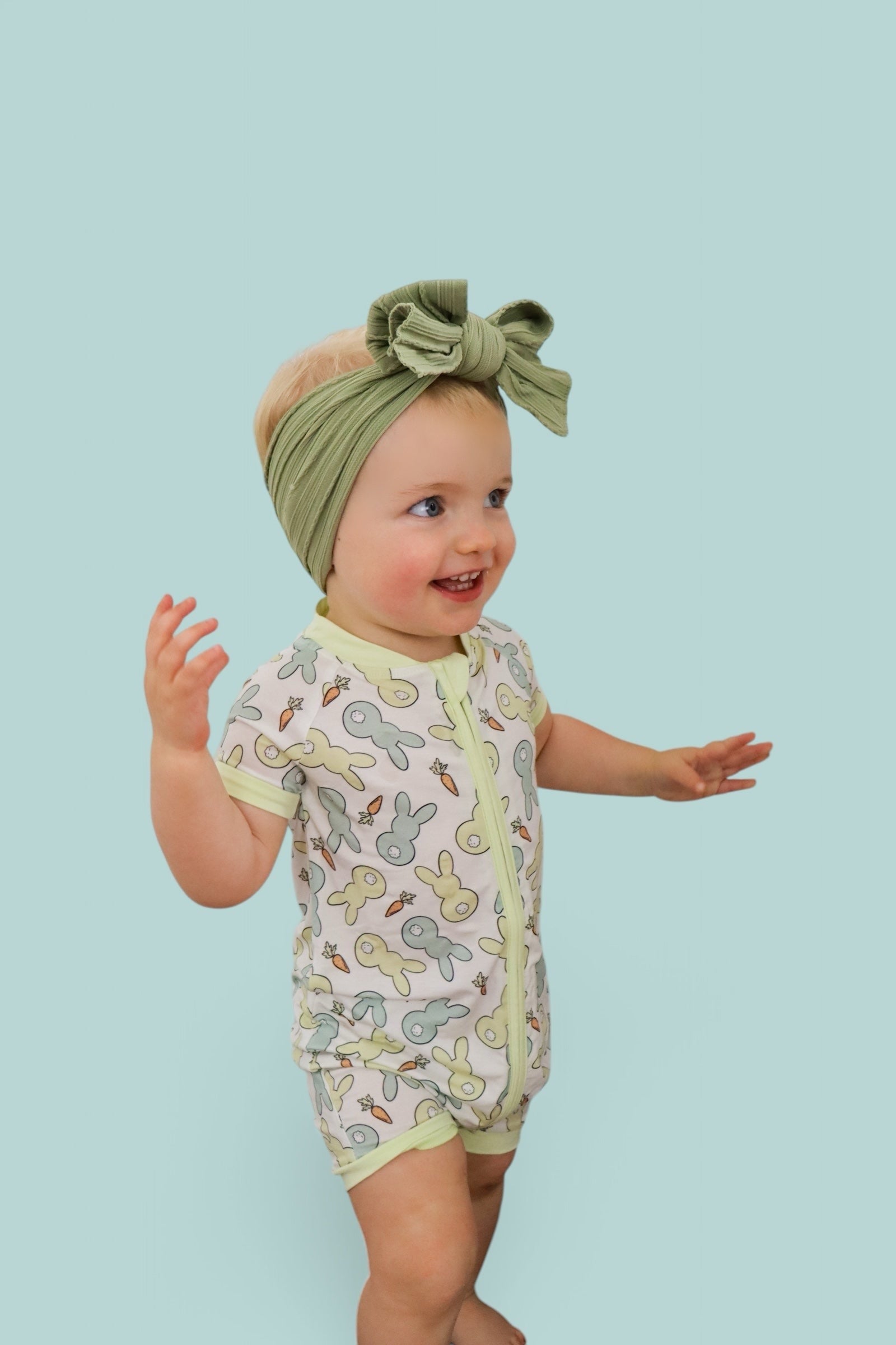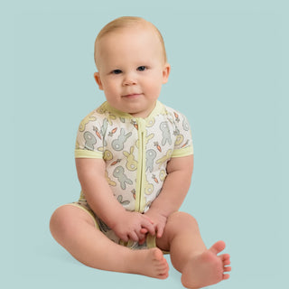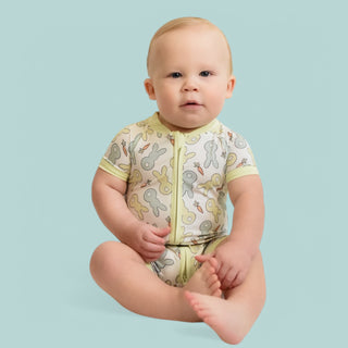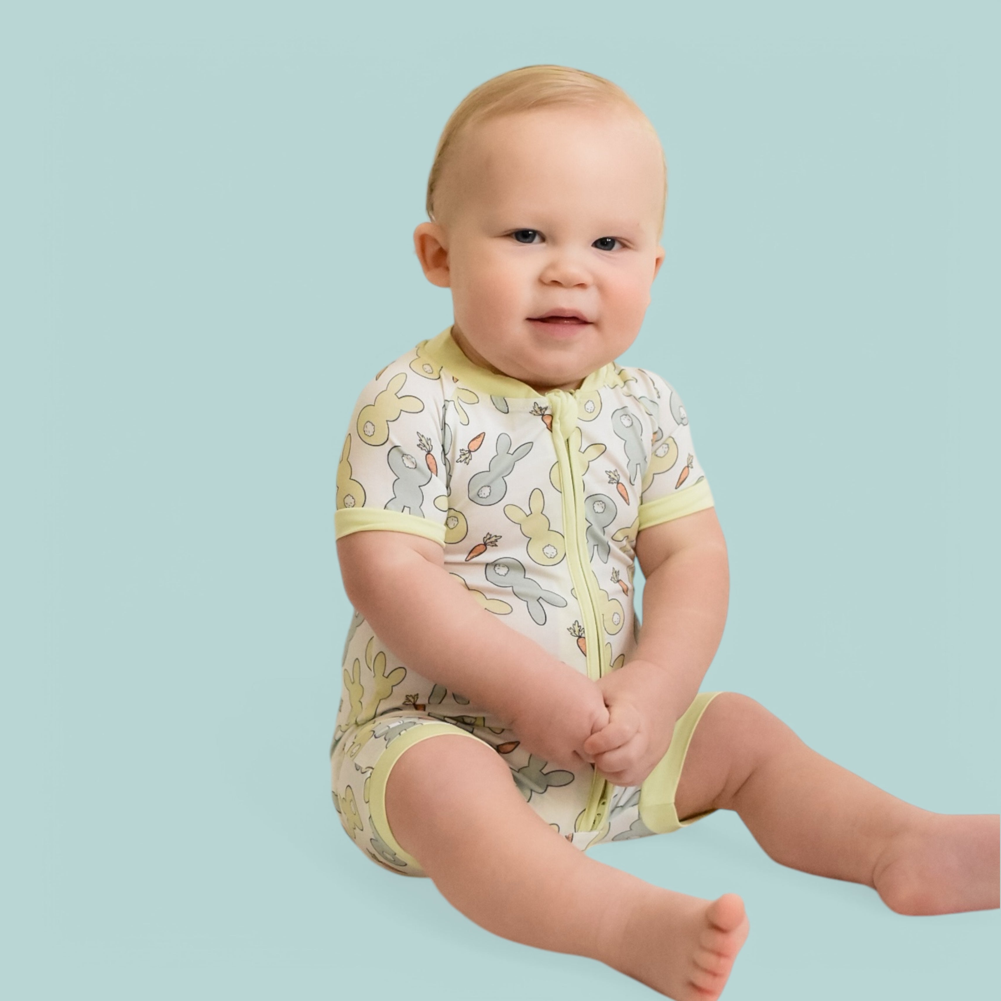 The Hoppity Tails Dream Shortie brings a playful and cozy touch to your little one's spring wardrobe! Featuring a cute pattern of pastel bunnies with fluffy white tails and vibrant orange carrots, this shortie is as charming as it is comfy. The whimsical design is set against a lightly speckled cream background for a fun, fresh feel.