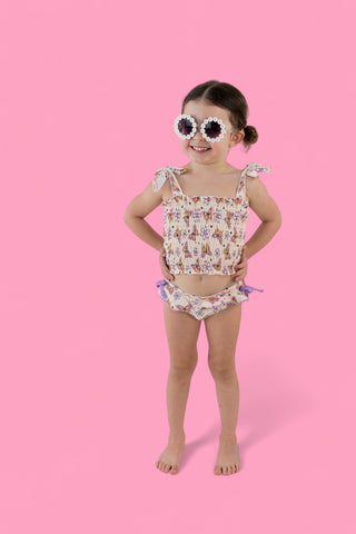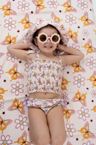 Say hello to sunshine and fun with the Blossom Butterfly Dream Smocked Tankini Two-Piece Swimsuit! This sweet and cheerful swim set is perfect for little beach lovers who want to flutter into fun with colorful butterflies, cheerful flowers, and twinkling stars. The pastel pink, lavender, and yellow hues, along with the charming daisy-like flowers, create an enchanting vibe, while soft peachy-pink tones add a warm, inviting touch.