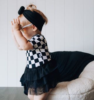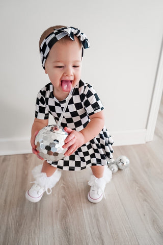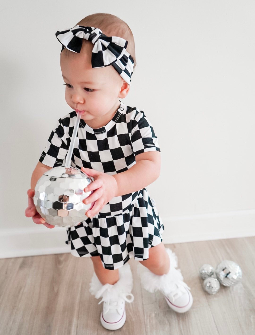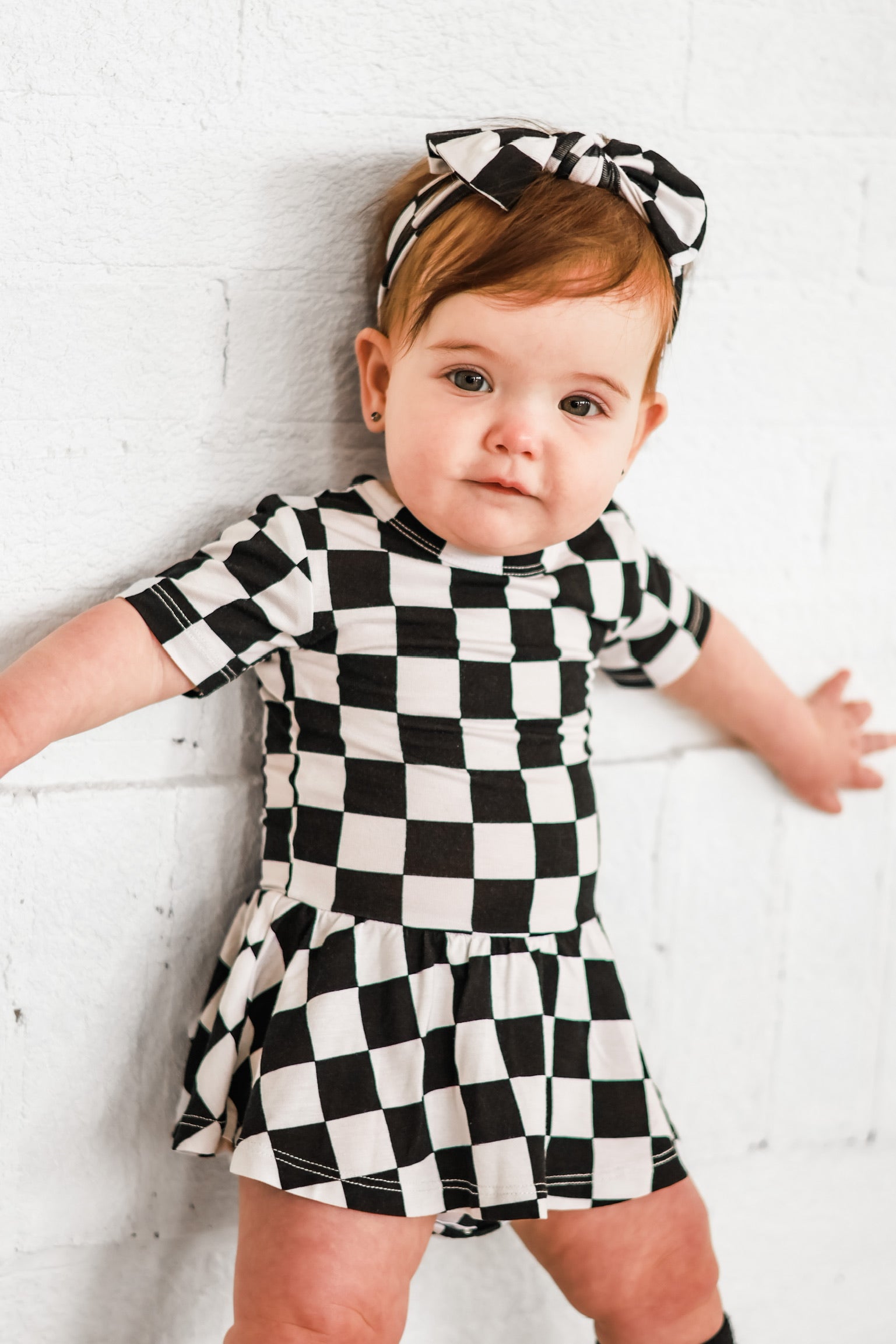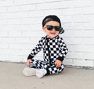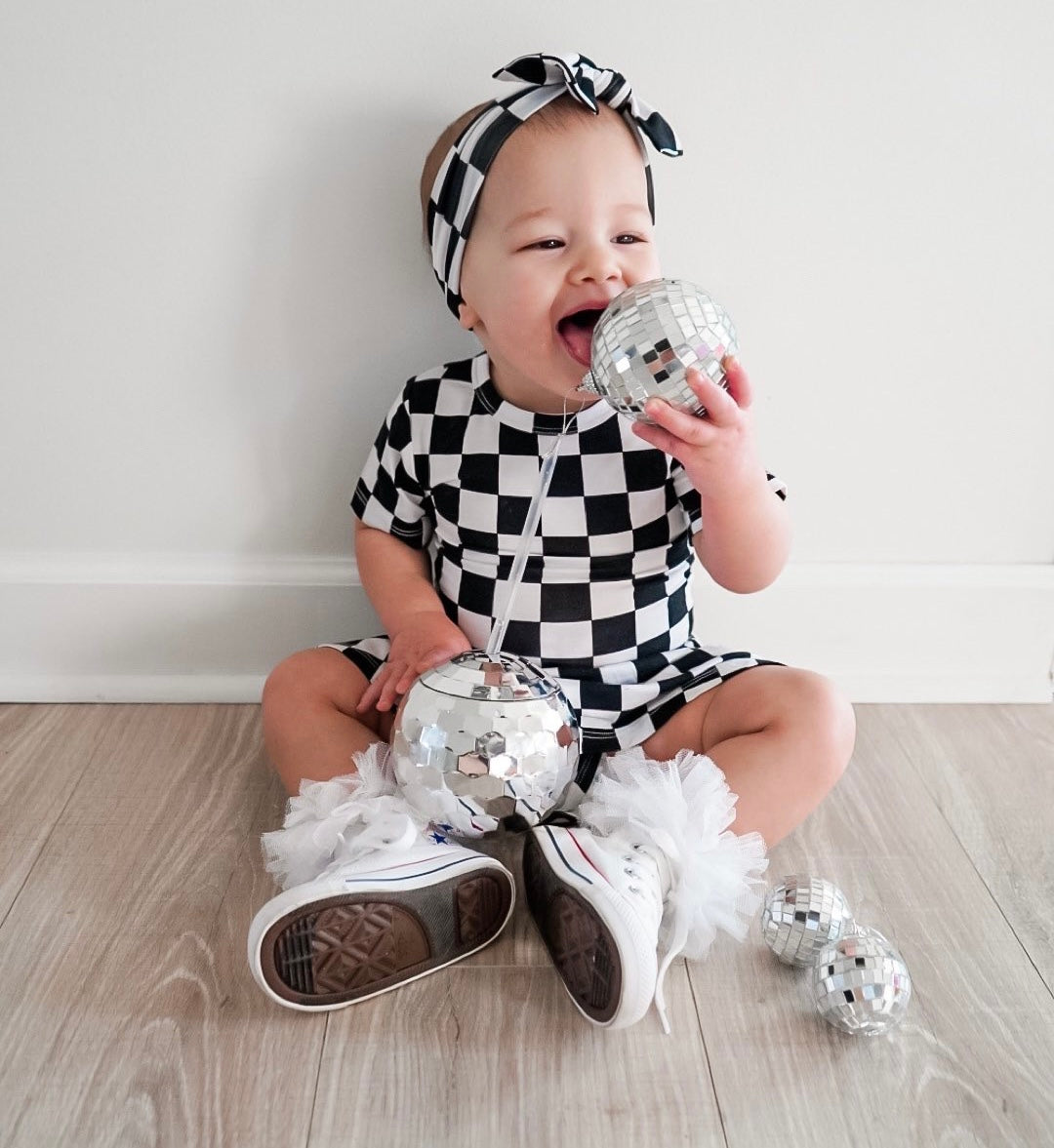 "Oreo Checkers" on trend print! NEW STYLE ALERT! Made from the softest and most breathable bamboo viscose material, your babe won't want to take this off! Designed for all the love and extra snuggles! Sleep and play with zero irritation with our tag-less garment tags!  Easy diaper changes, you got it-made with 3 easy to remove snaps. We promise you'll love it!