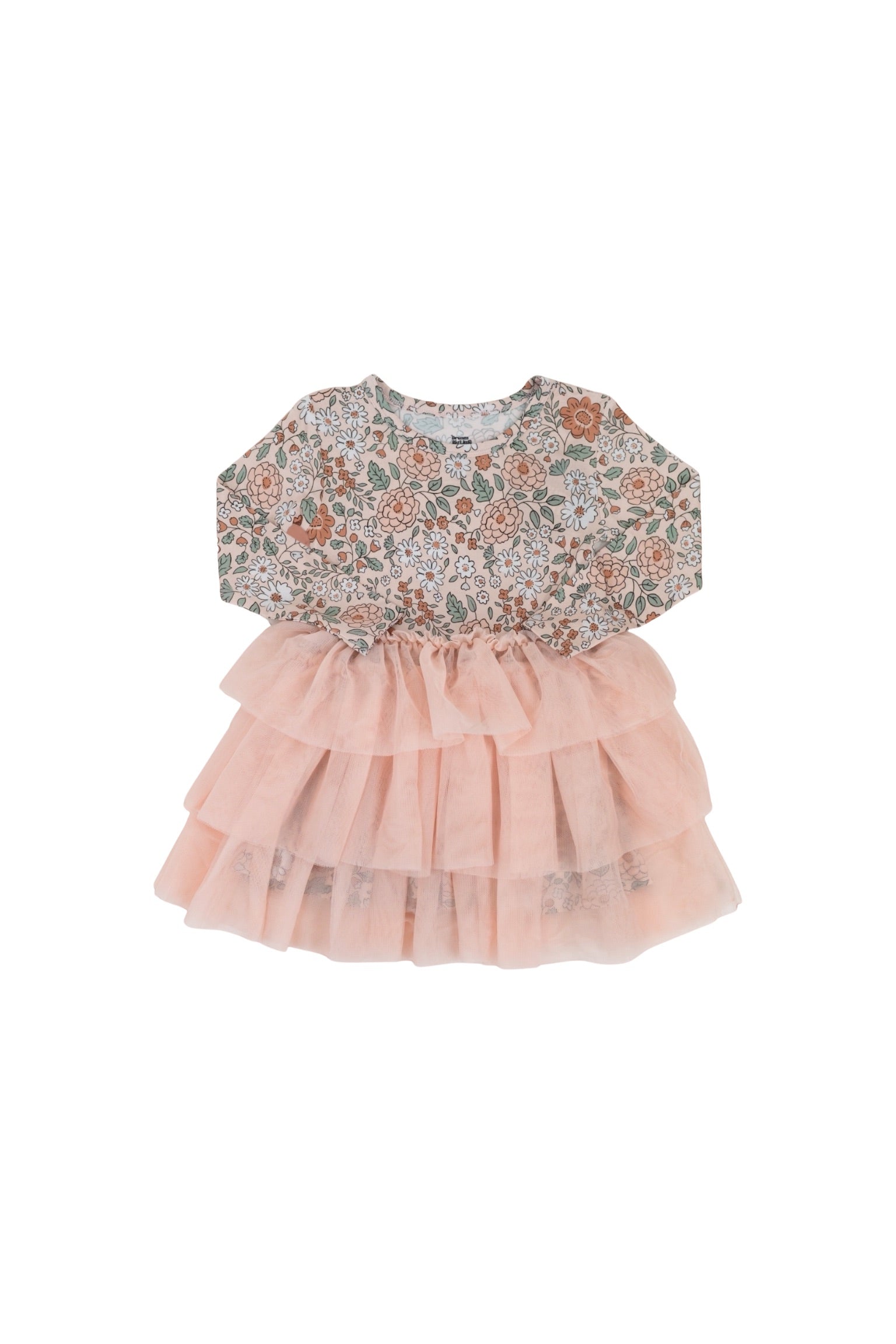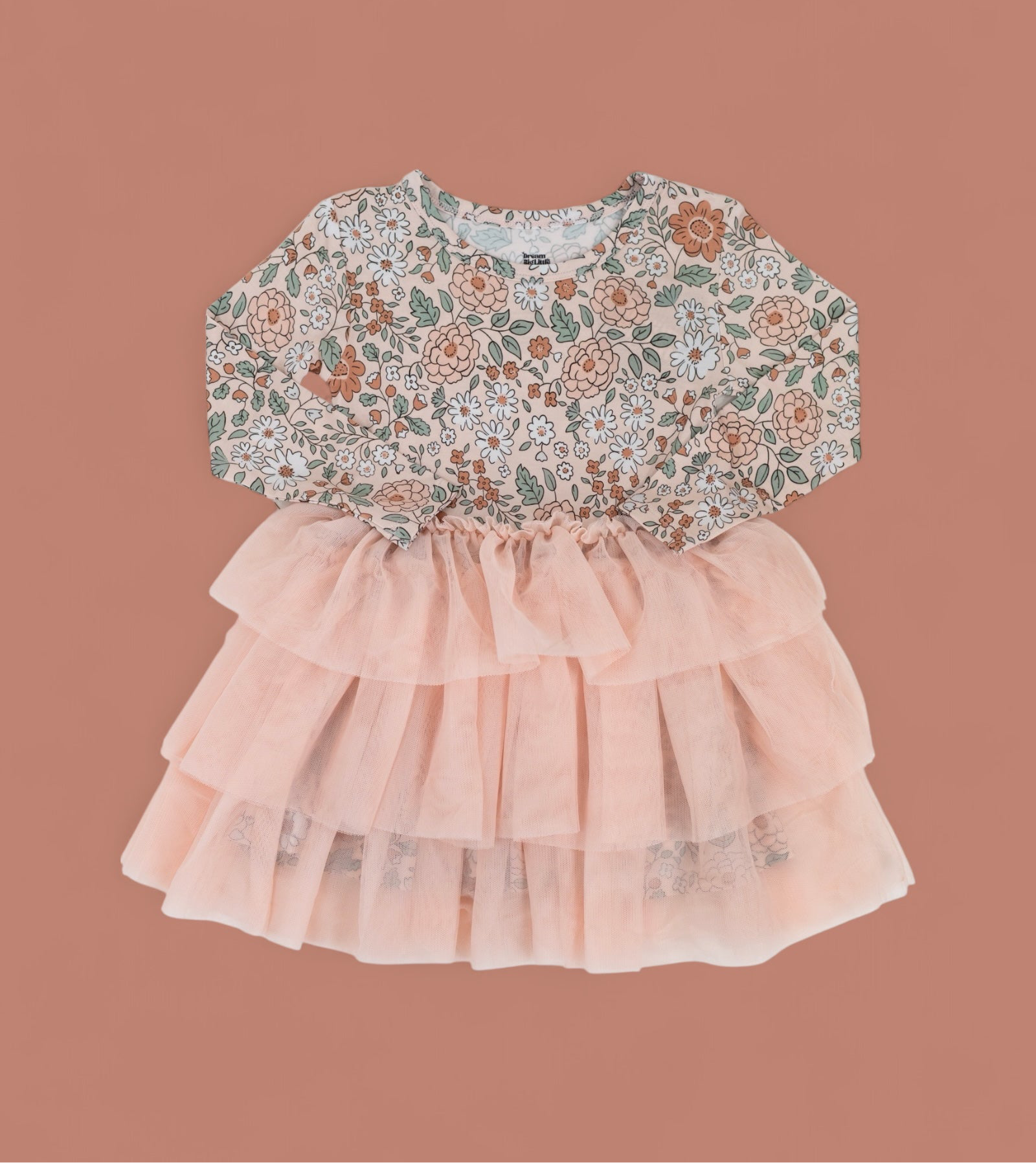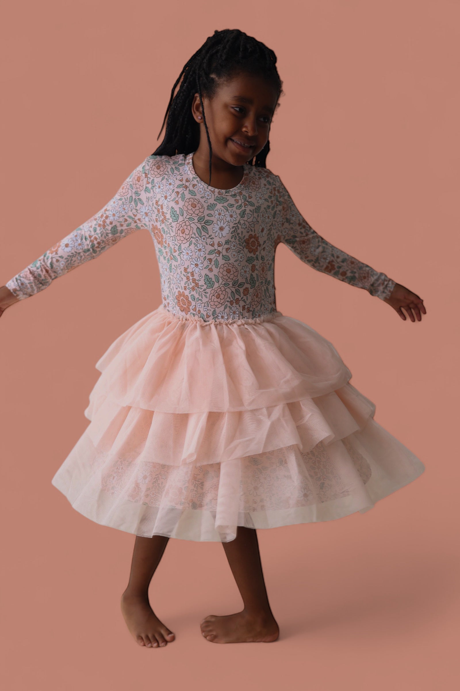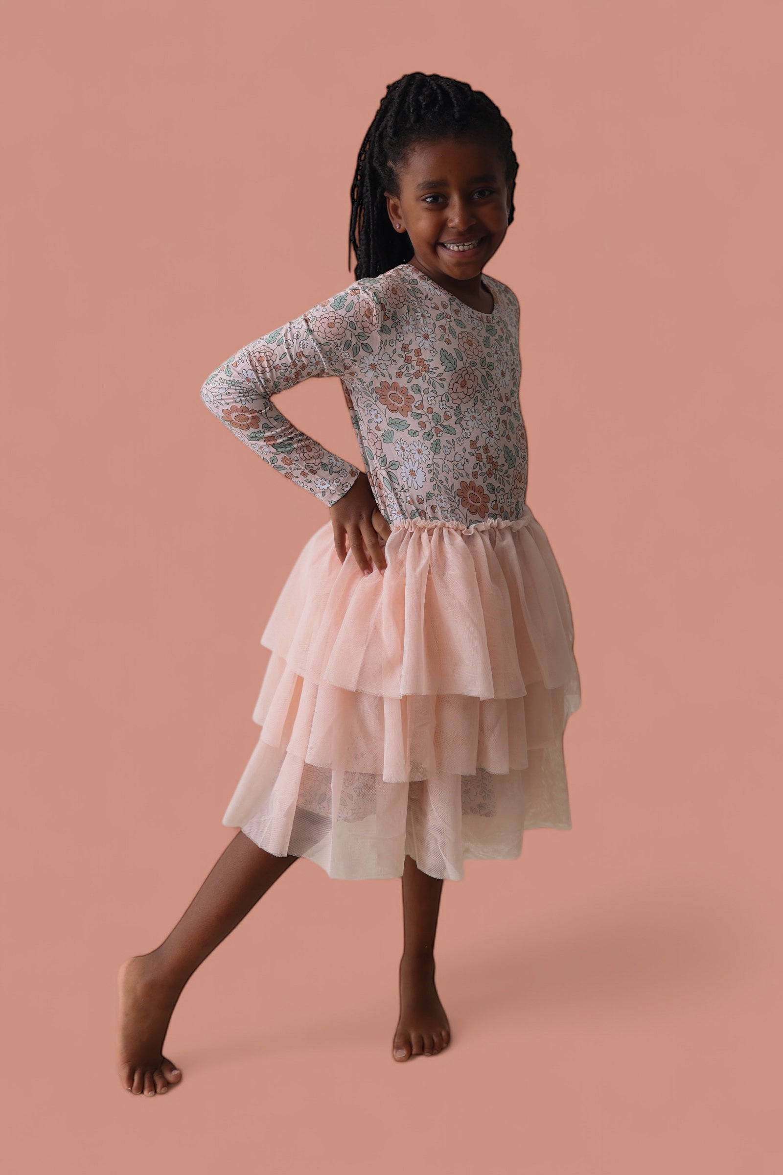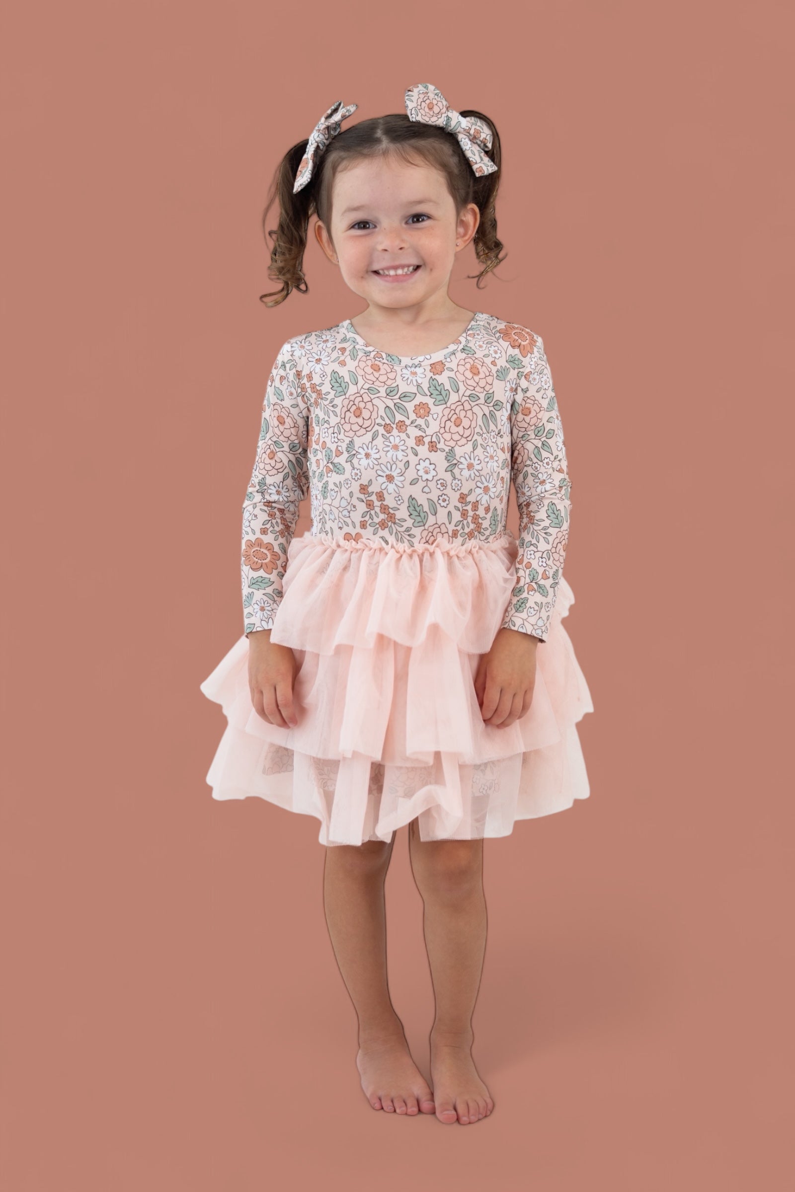 Let her dance through fall in the Autumn Blossom Long Sleeve Dream Tutu Dress! With a vintage-inspired floral print on top and layers of soft, fluttery tulle on the bottom, this dress is made for magical moments—from golden leaf piles to cozy family photos. Soft, stretchy, and oh-so-sweet, it’s perfect for twirling all season long.