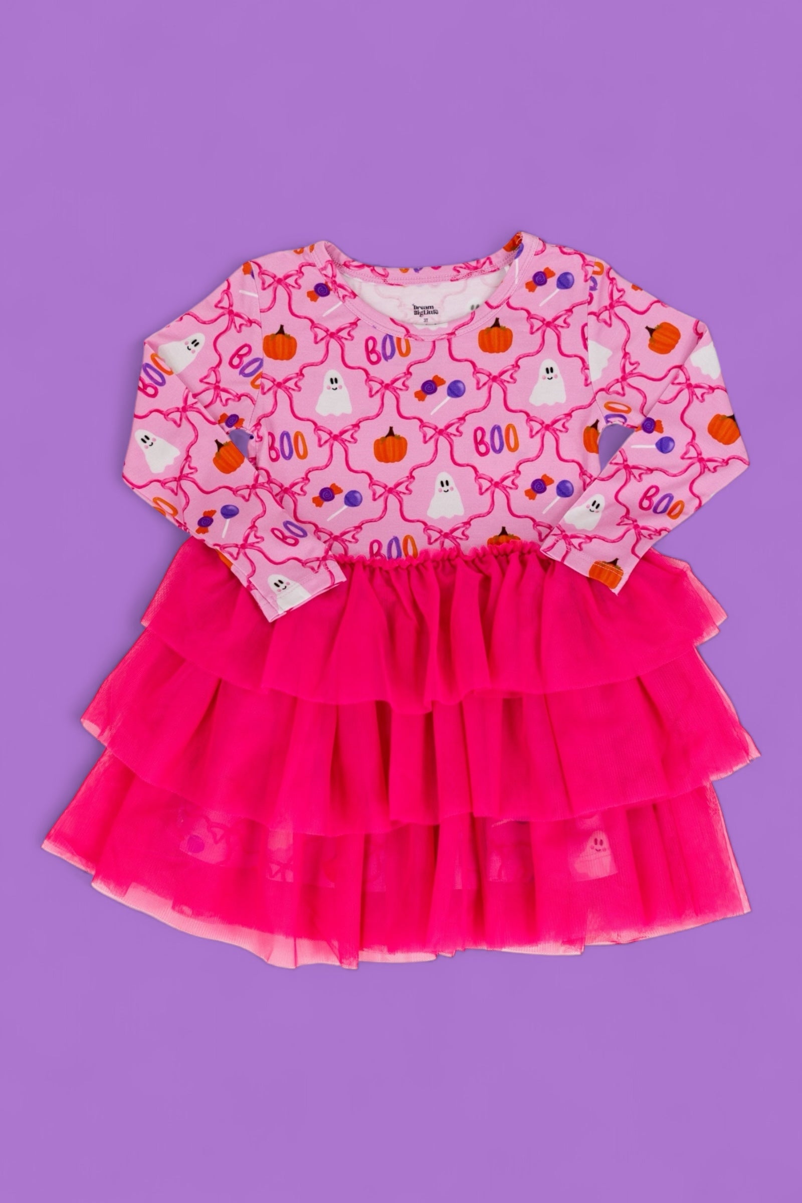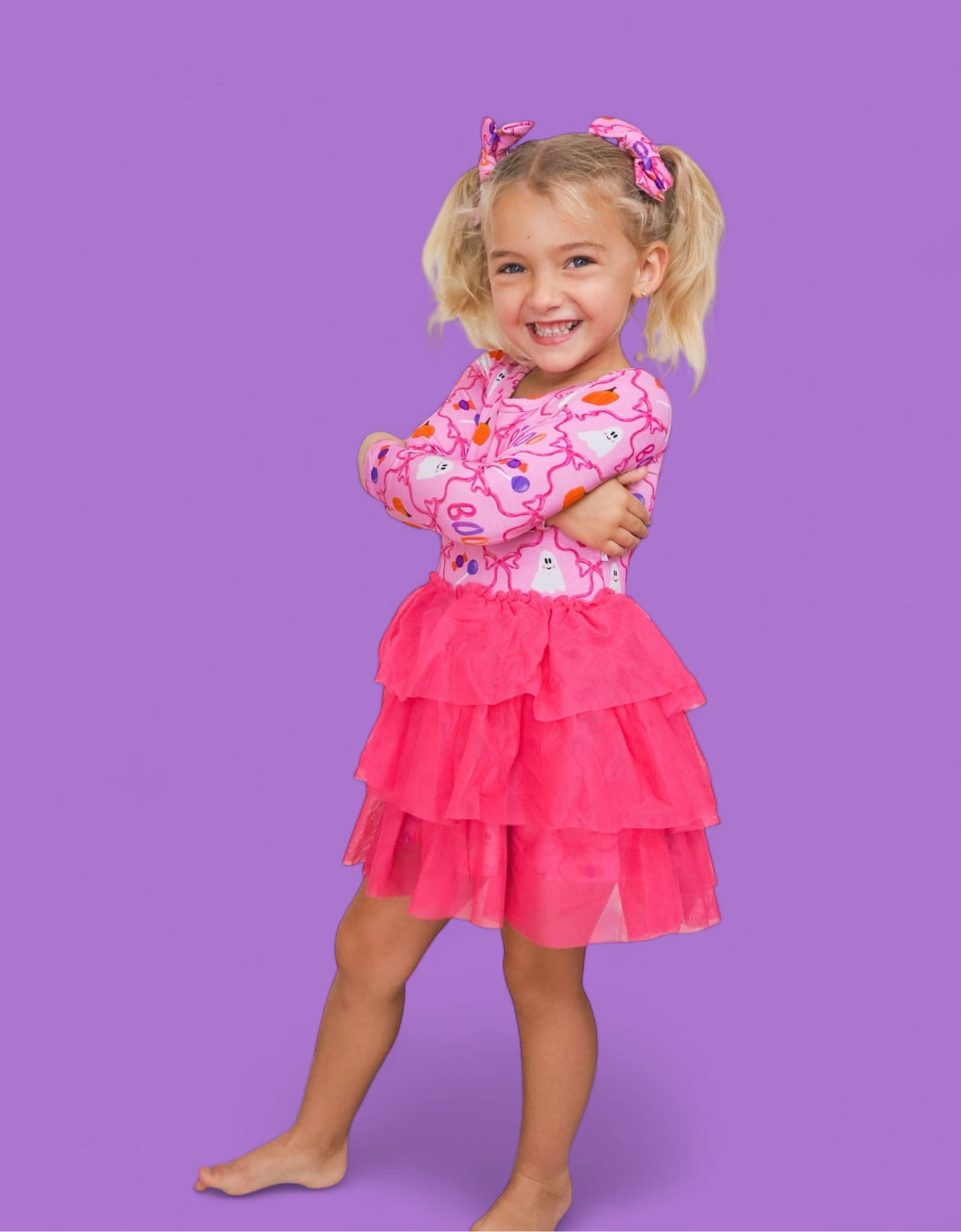 Spooky never looked so sweet! The Berry Sweet Boo Long Sleeve Dream Tutu Dress features a playful pink print filled with happy ghosts, candy, pumpkins, and pink bows—topped off with a dreamy layered tulle skirt made for twirls. With a buttery-soft bodice and cozy long sleeves, this dress is perfect for Halloween parties, trick-or-treat adventures, and boo-tiful photo ops.