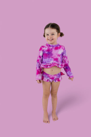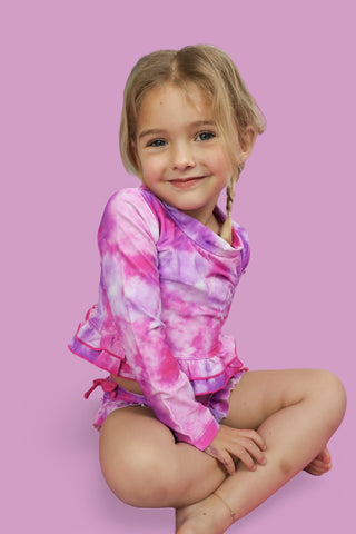 Get ready to make a splash in the Candy Clouds Dream 2-Piece Rash Guard Ruffle Swim Suit! This swimsuit is like a sweet daydream come to life, with its vibrant pinks and purples swirling in a dreamy, watercolor cloud design. The soft pastel hues are perfect for your little one to float through summer in style, whether they're building sandcastles or diving into the waves.