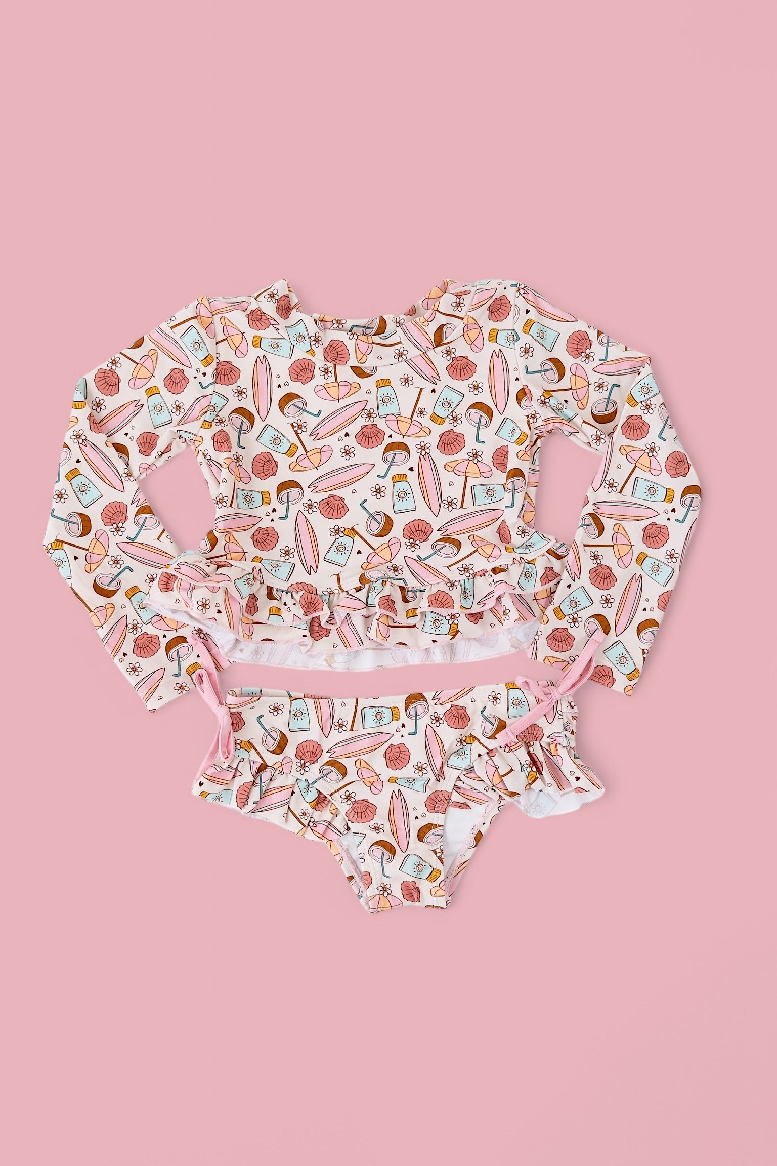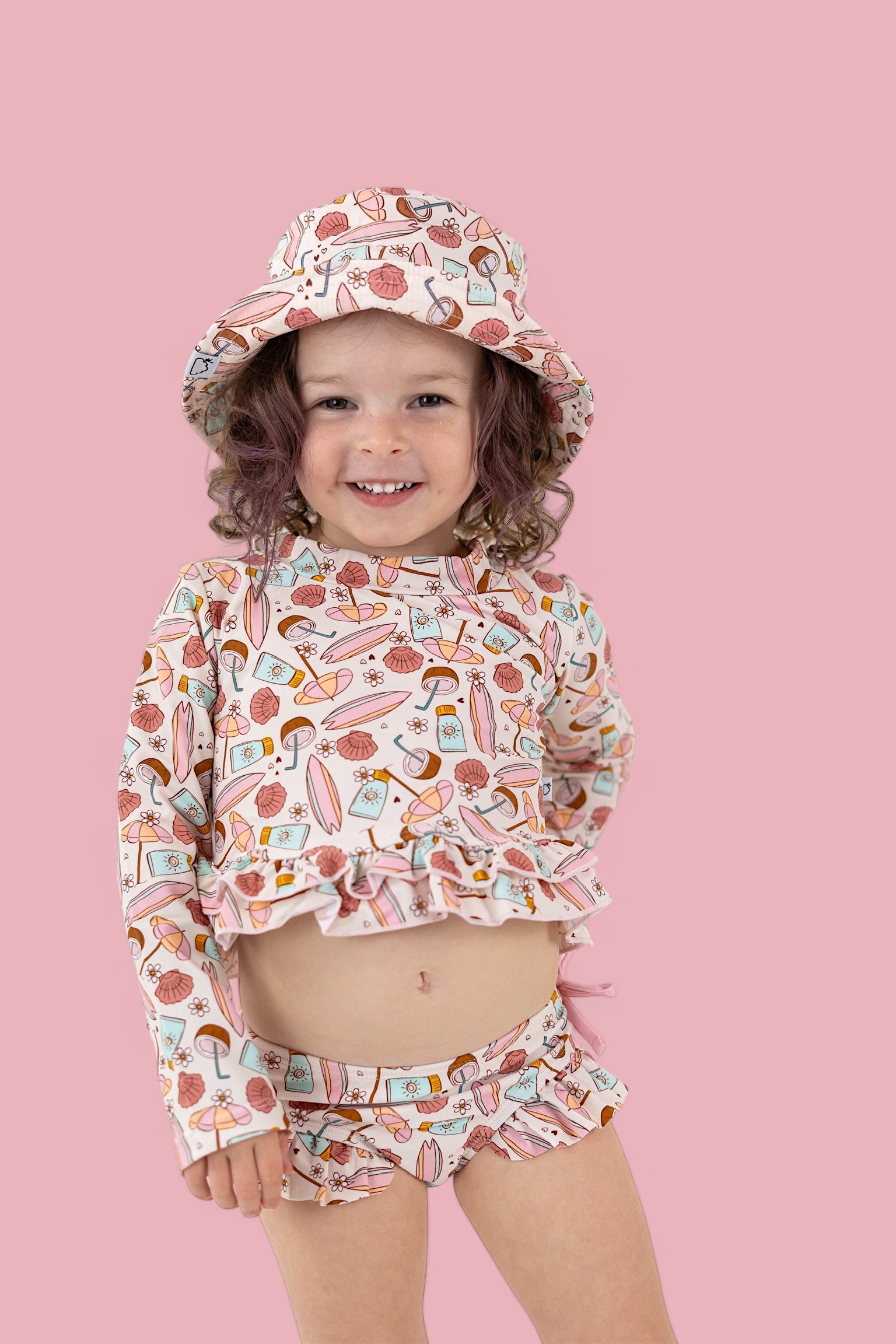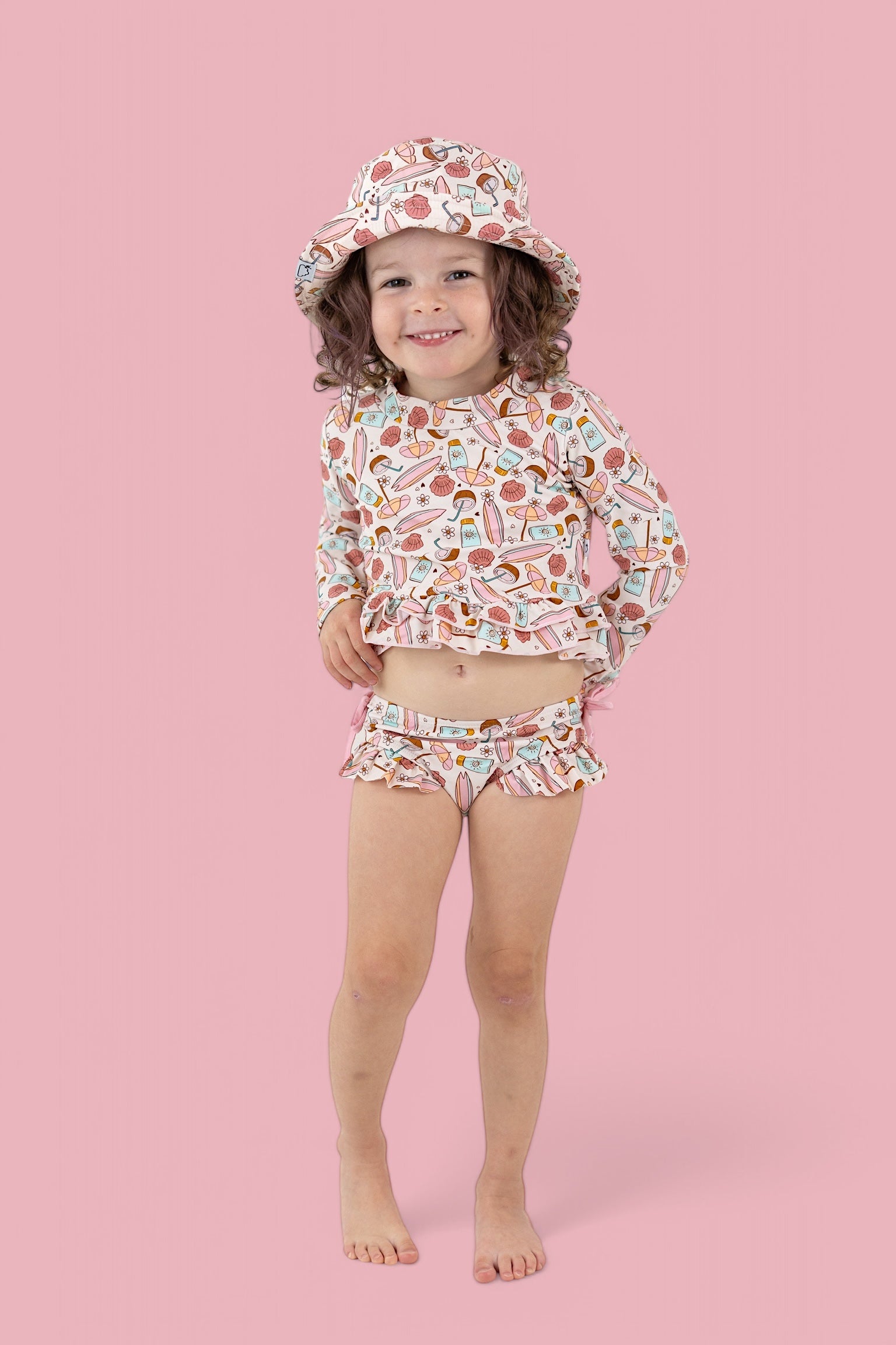 Your little fashionista is ready to shine in the Fun in the Sun Dream Rash Guard Ruffle Swim Suit! This adorable two-piece set features our soft, hand-drawn beach print with surfboards, coconuts, scallop shells, daisies, and umbrellas—dusted with hearts and flower accents in a soothing pastel palette of pinks, aqua blues, sandy browns, and creams.
