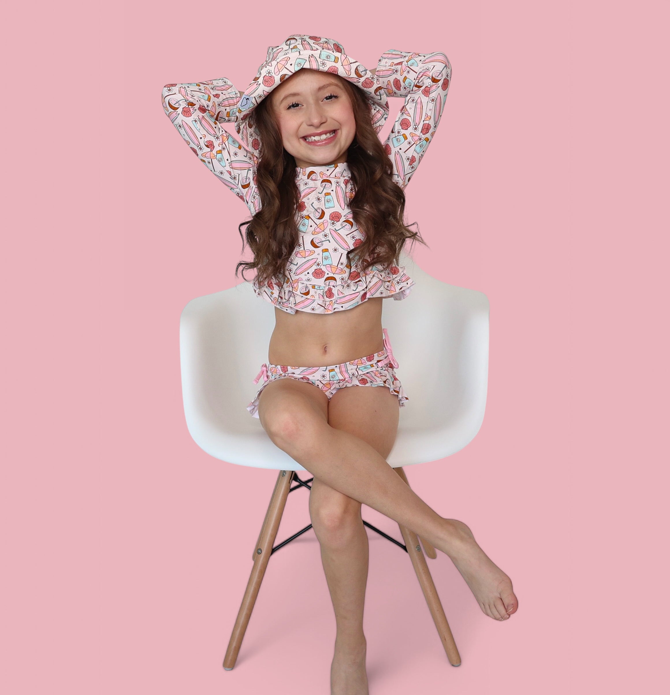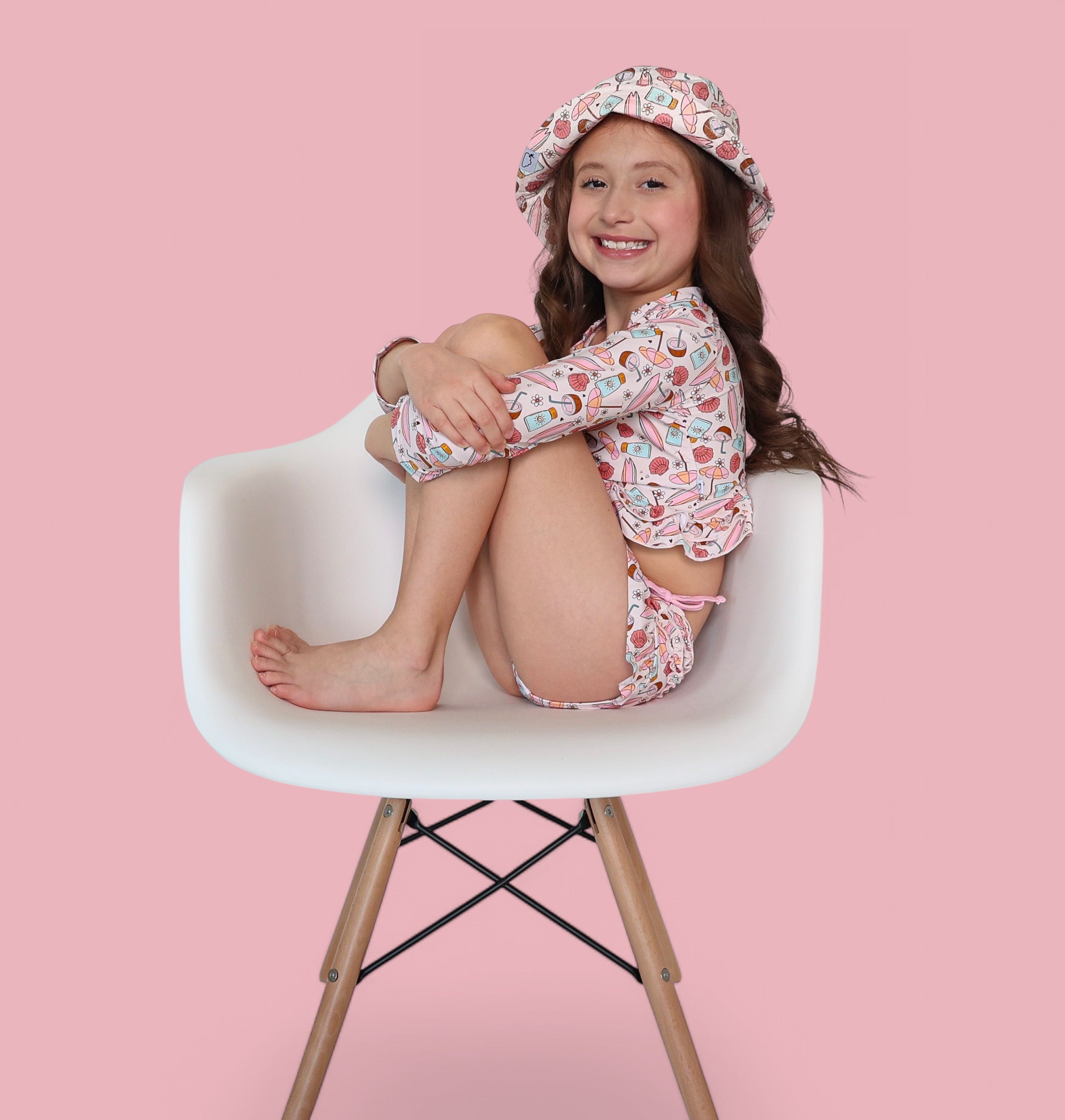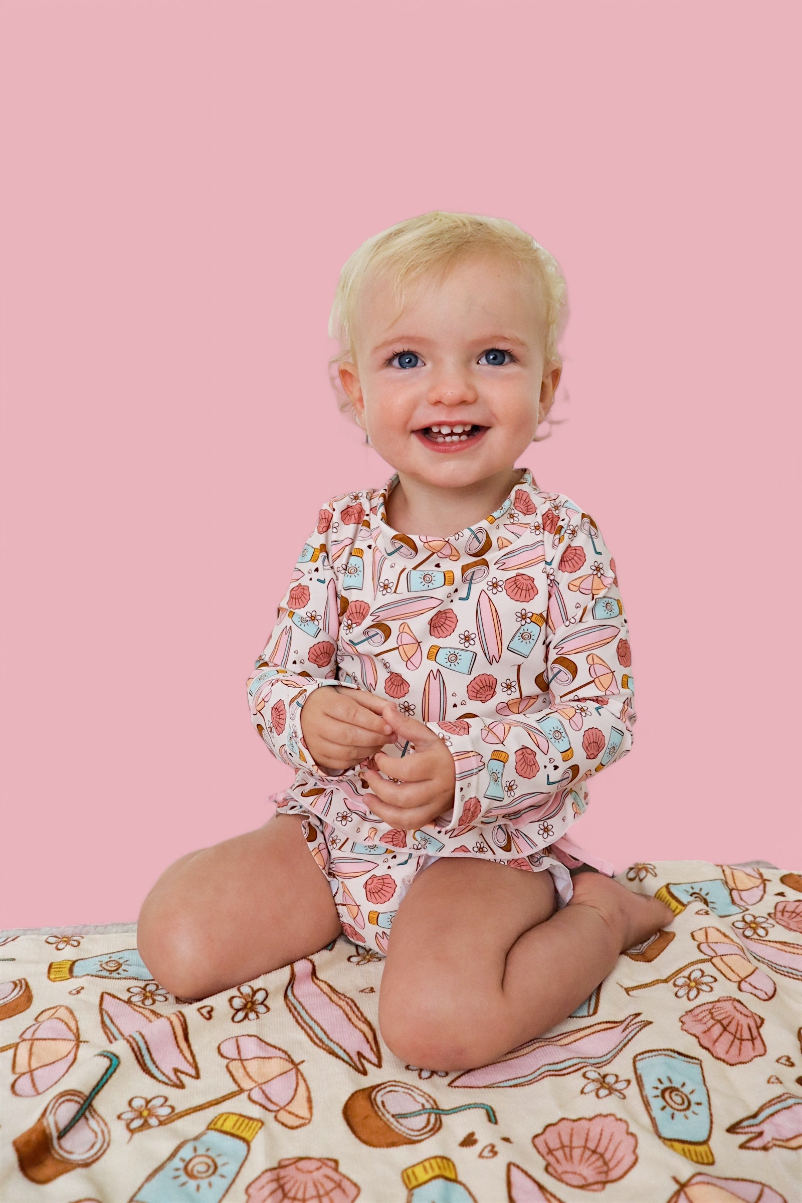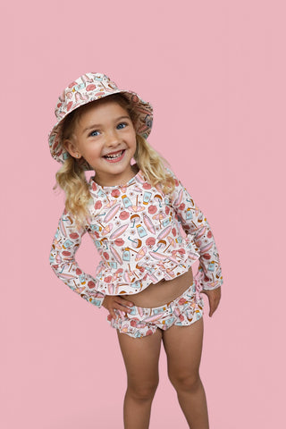 Your little fashionista is ready to shine in the Fun in the Sun Dream Rash Guard Ruffle Swim Suit! This adorable two-piece set features our soft, hand-drawn beach print with surfboards, coconuts, scallop shells, daisies, and umbrellas—dusted with hearts and flower accents in a soothing pastel palette of pinks, aqua blues, sandy browns, and creams.