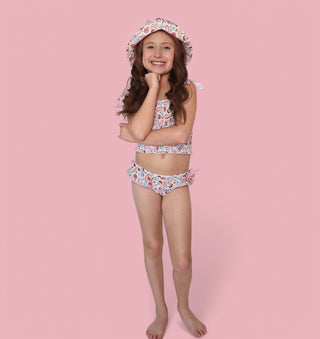 Designed for comfort and cuteness, this tankini includes a smocked top with ruffle details, pom-pom trim, and matching bottoms, all made with UPF 50+ swim fabric to help protect delicate skin under the sun.