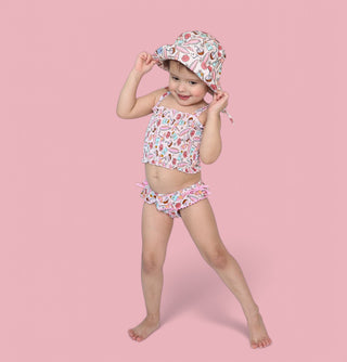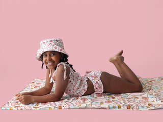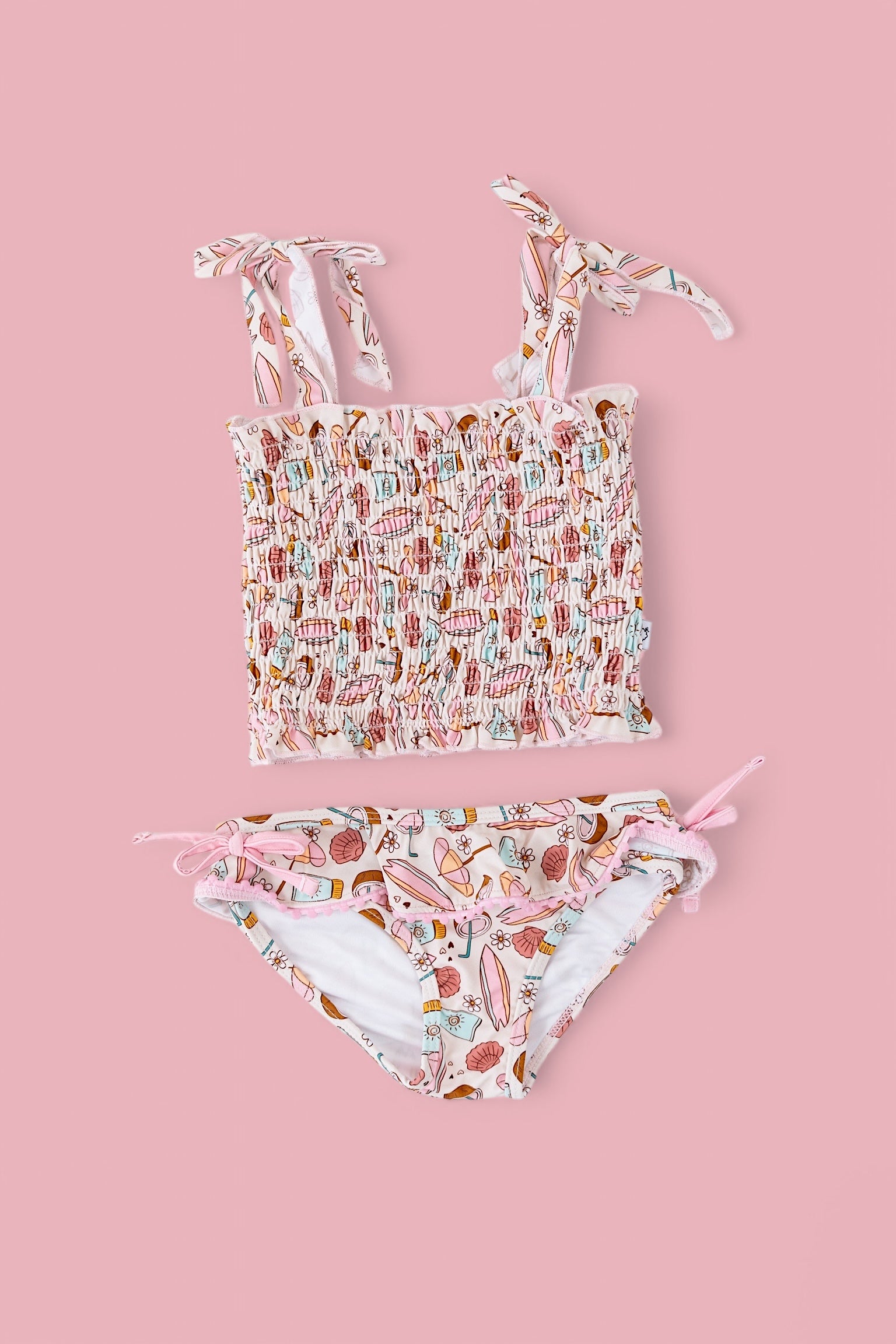 Get your little one ready to shine in the Fun in the Sun Dream Smocked Tankini! This sweet and girlie two-piece set features our playful hand-drawn print filled with surfboards, coconuts, scallop shells, beach umbrellas, and daisies—sprinkled with hearts and soft summer magic. The color palette is a dreamy mix of pale pinks, aqua blues, sandy browns, and creamy neutrals, perfect for sunny days and splashy play.