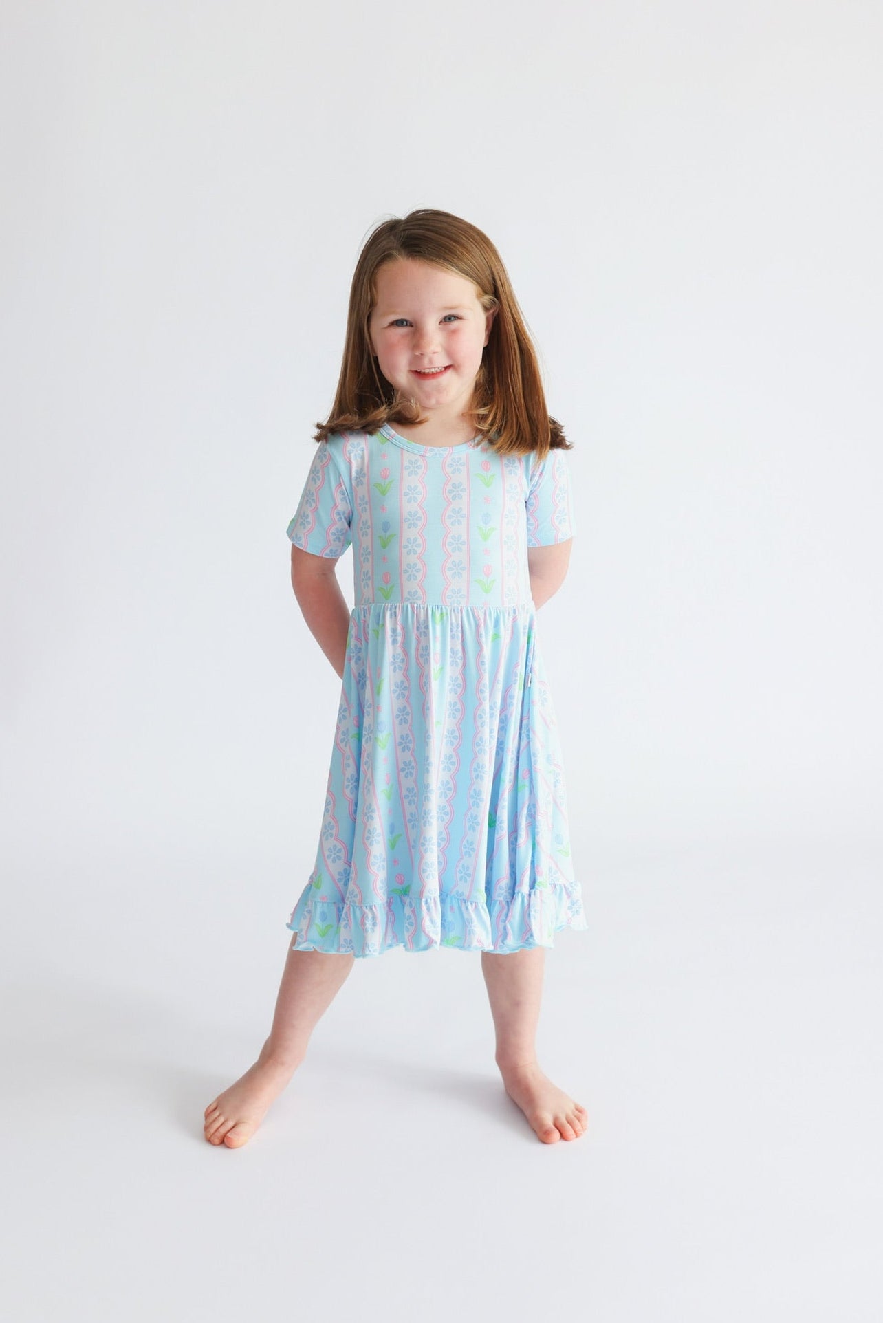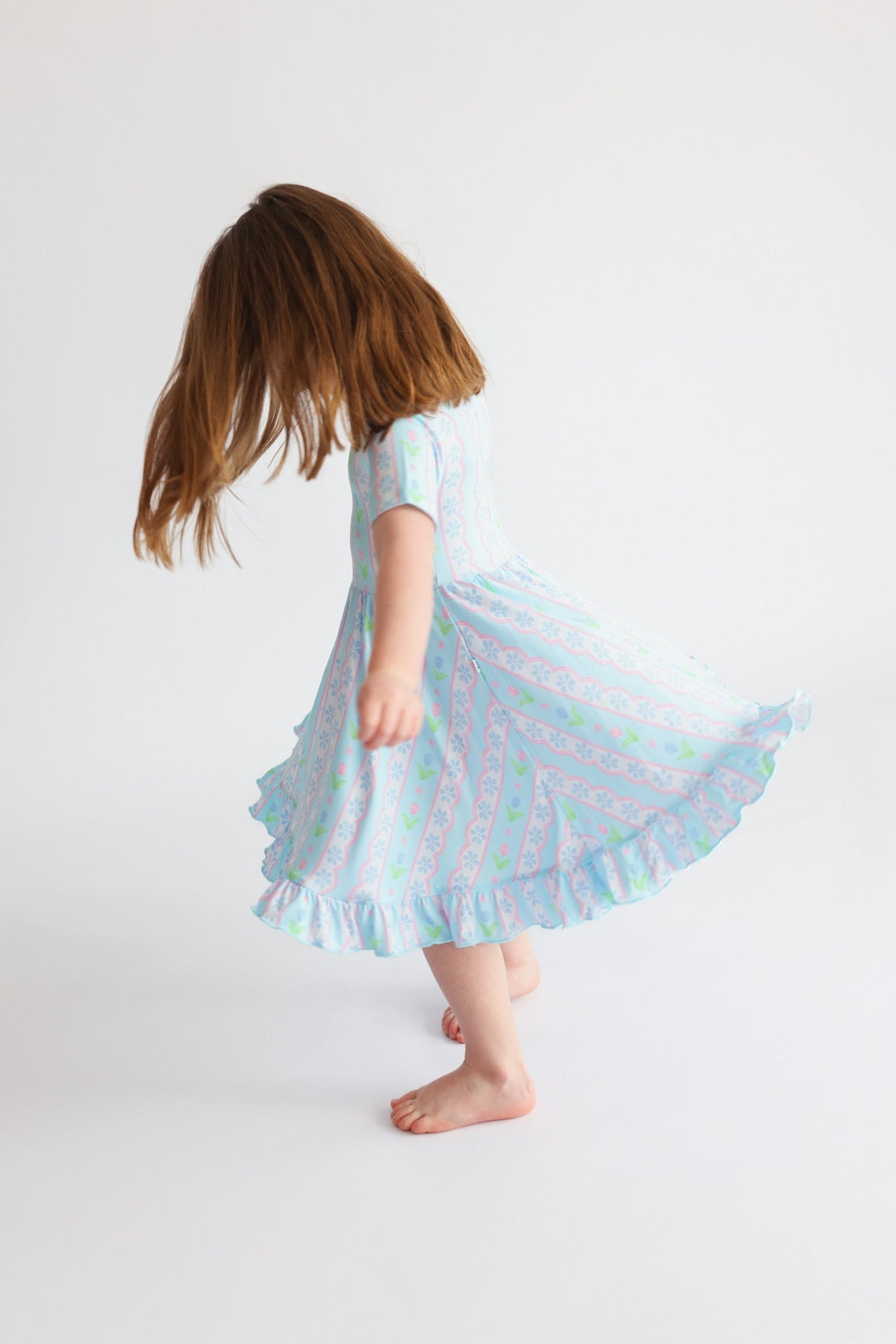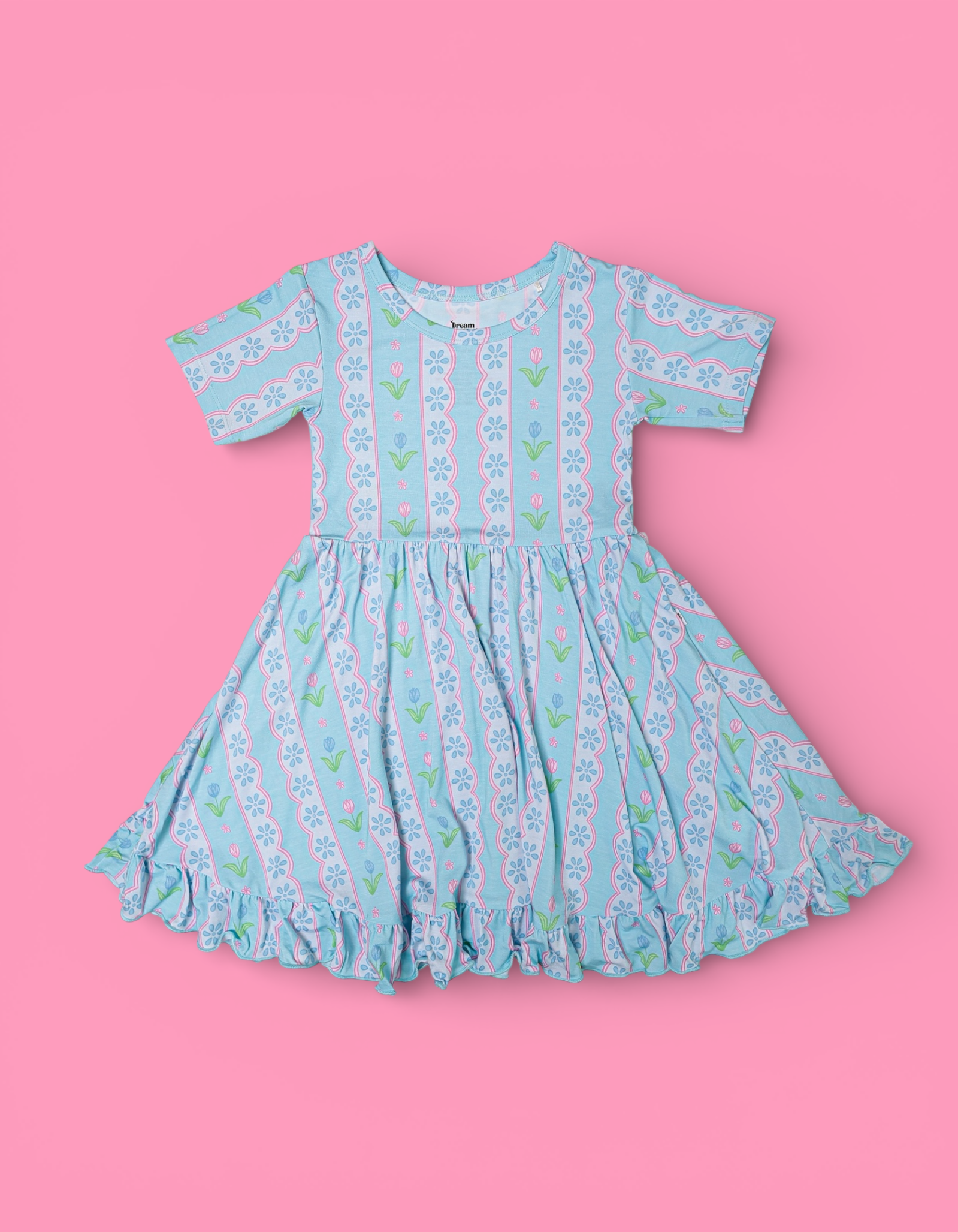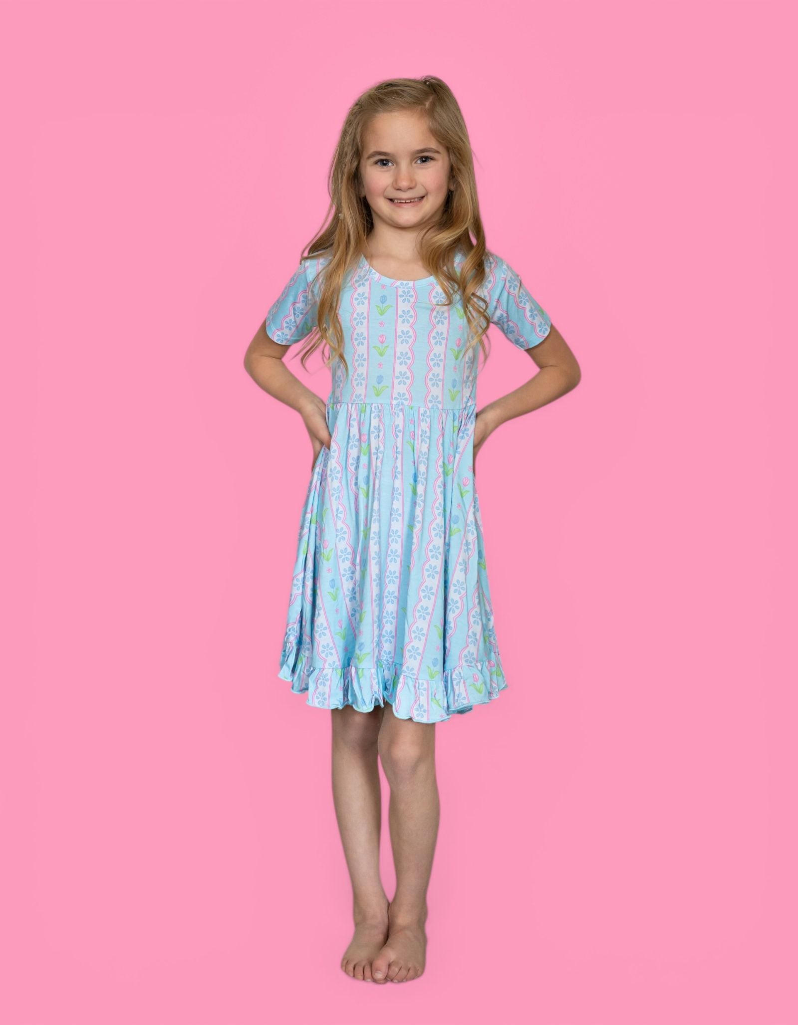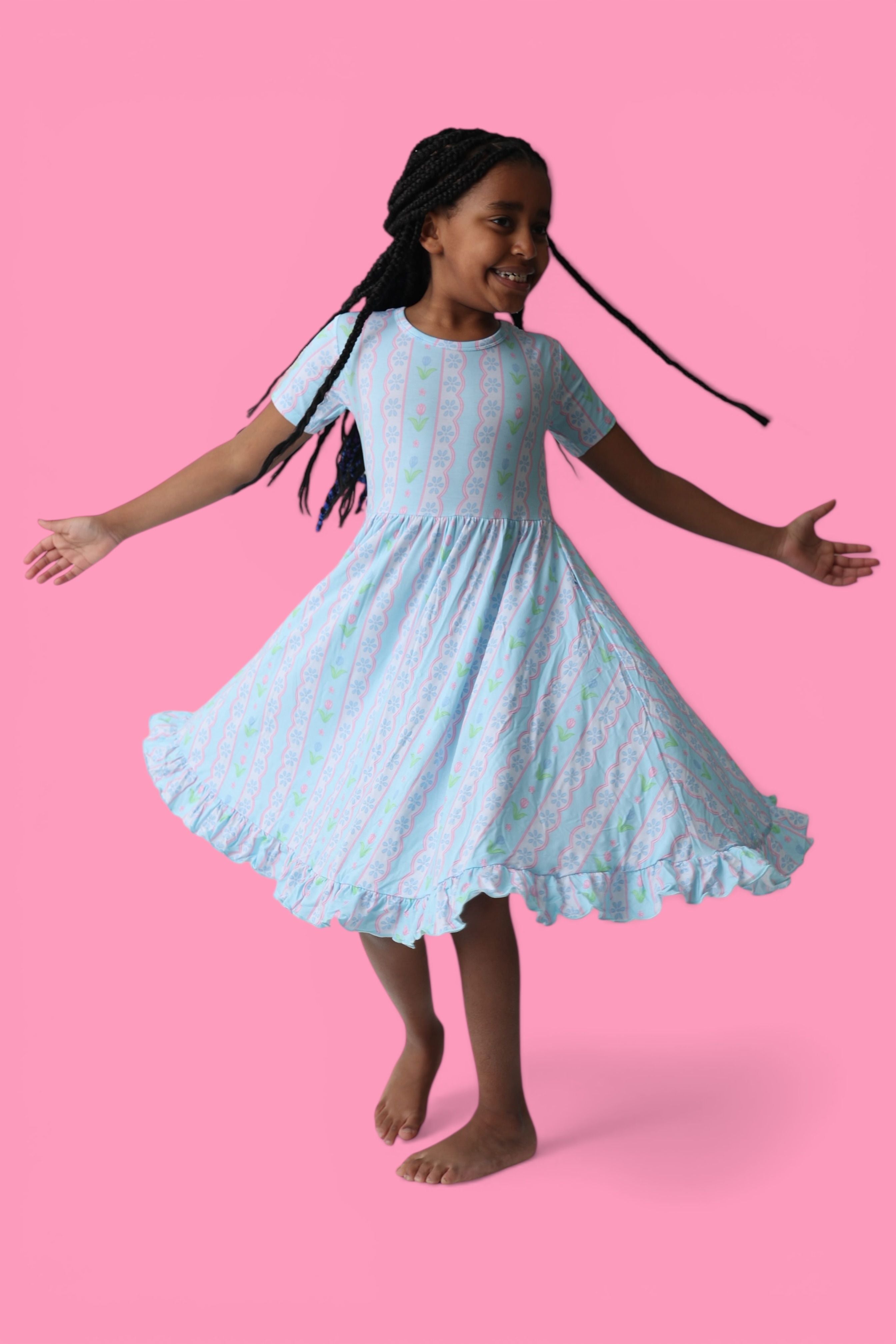 The Whimsy Tulip Dream Ruffle Dress is made for twirls, smiles, and all-day comfort. Featuring a soft tulip stripe print and charming ruffle details, this dress is crafted from our signature buttery-soft bamboo fabric for a breathable, gentle feel your little one will love.