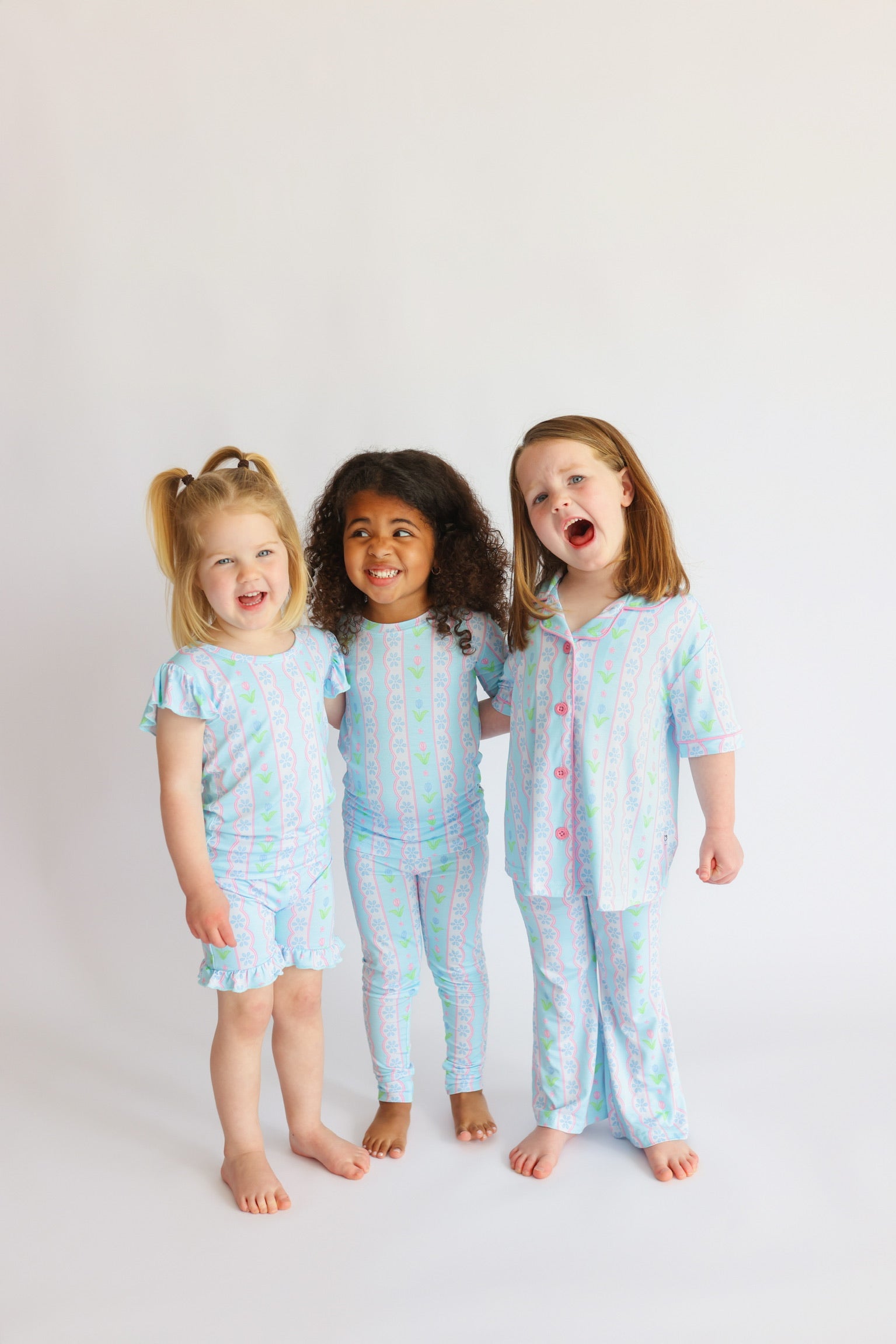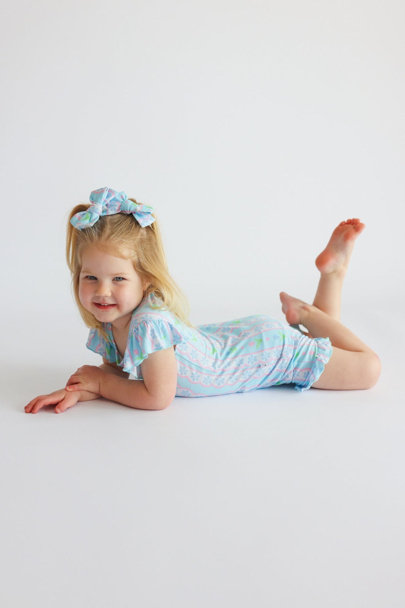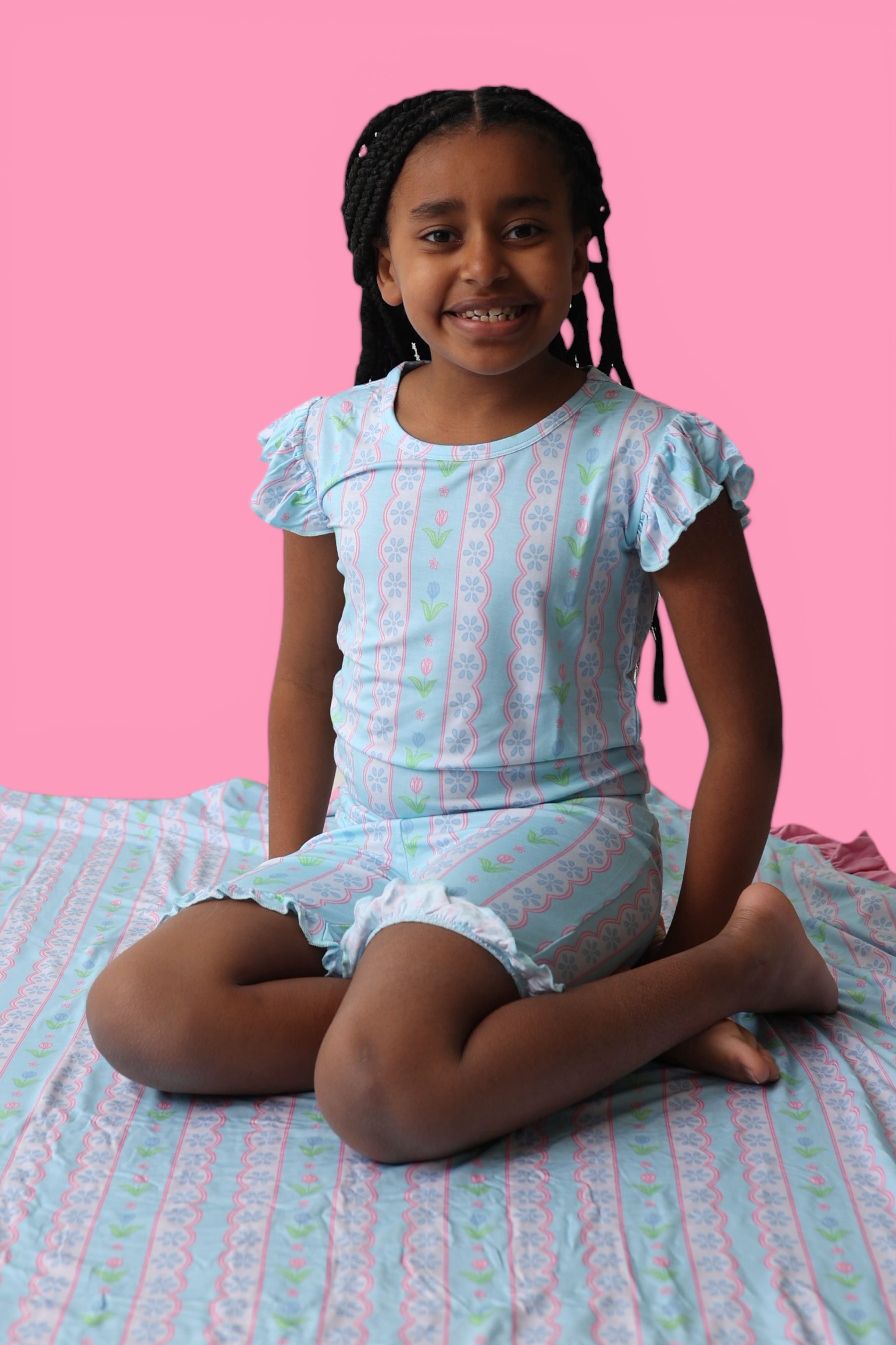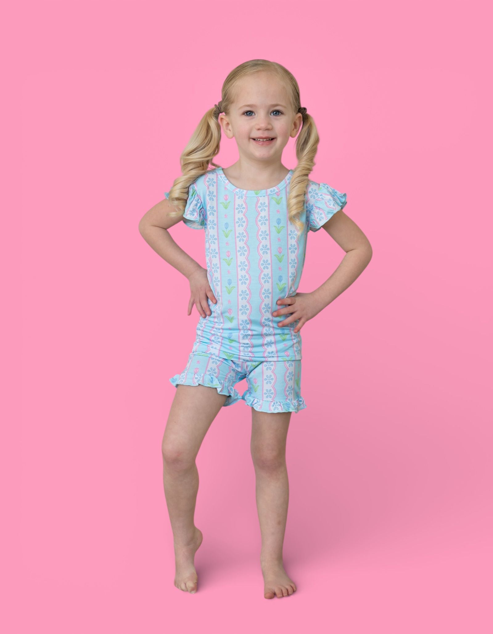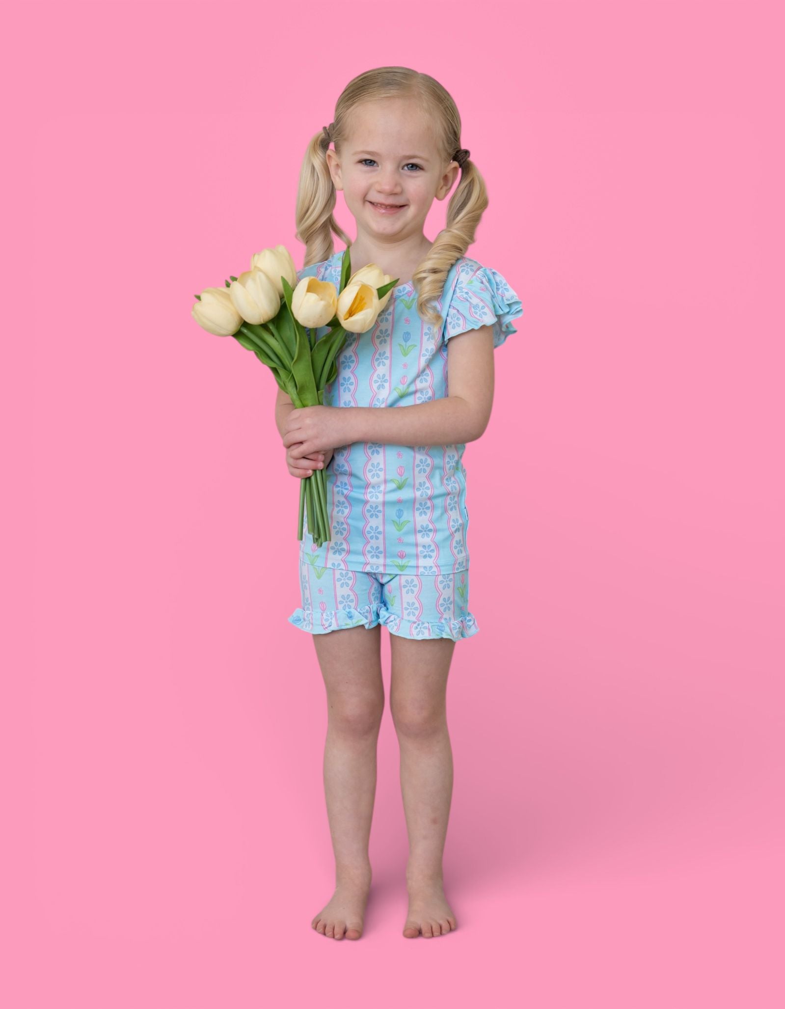 The Whimsy Tulip Dream Ruffle Short Set is made for warm-weather play with a touch of floral charm. Featuring a delicate tulip stripe print and darling ruffle details, this two-piece set is crafted from our signature buttery-soft bamboo fabric for a breathable, comfy feel all day long.