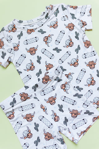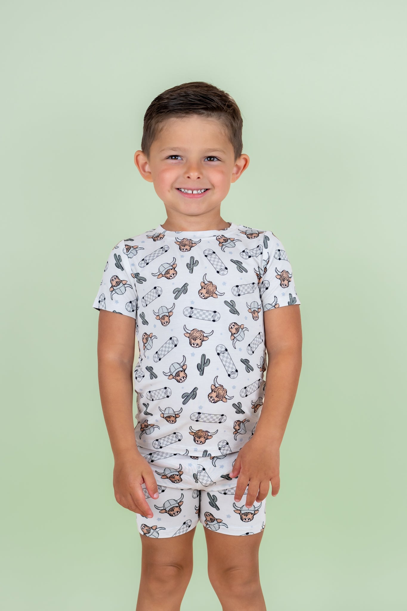 Get ready to skate into dreamland with our Exclusive Moo-ving Fast Dream Short Set! Made with bamboo material, this short set is not only comfortable, but also features an exclusive cow print and a skateboard design. Catch some zzz's in style with this playful and quirky ensemble.
