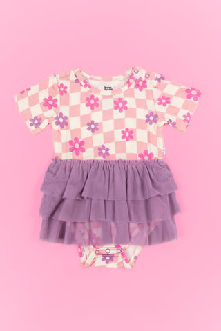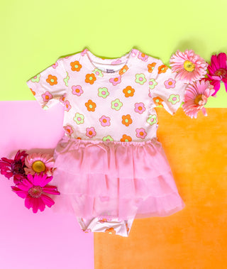 Get ready to feel flowerful in this retro print bodysuit dress! The short sleeves and comfortable fit make it perfect for all-day wear. The tutu adds a playful touch, making it a dream for any little fashionista.