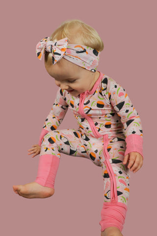 The Sweet Pea Sushi Dream Bow features a playful print full of cute sushi designs that are sure to make heads turn. It's the perfect accessory for your little sushi lover, making every day feel like a fun culinary adventure!