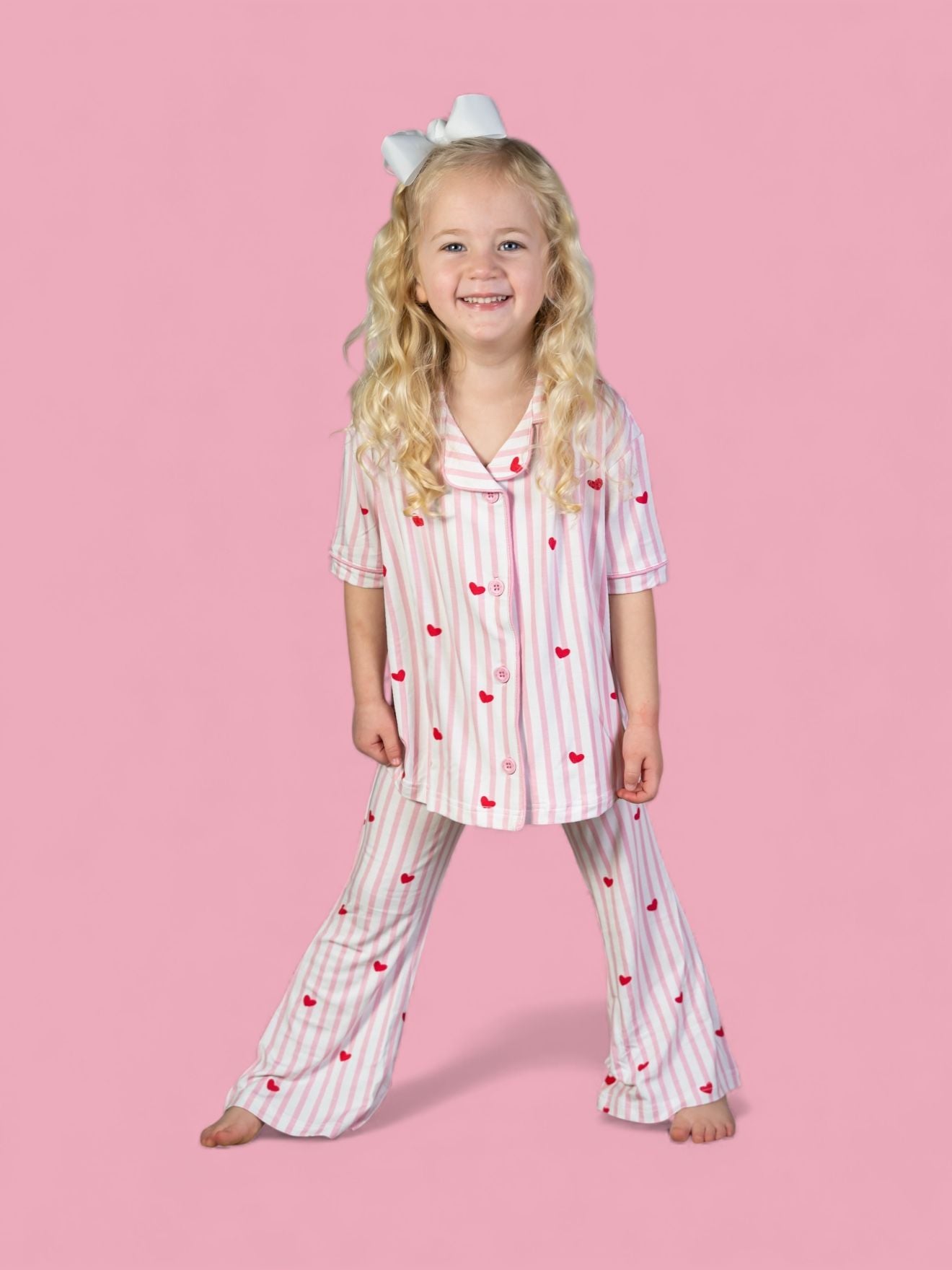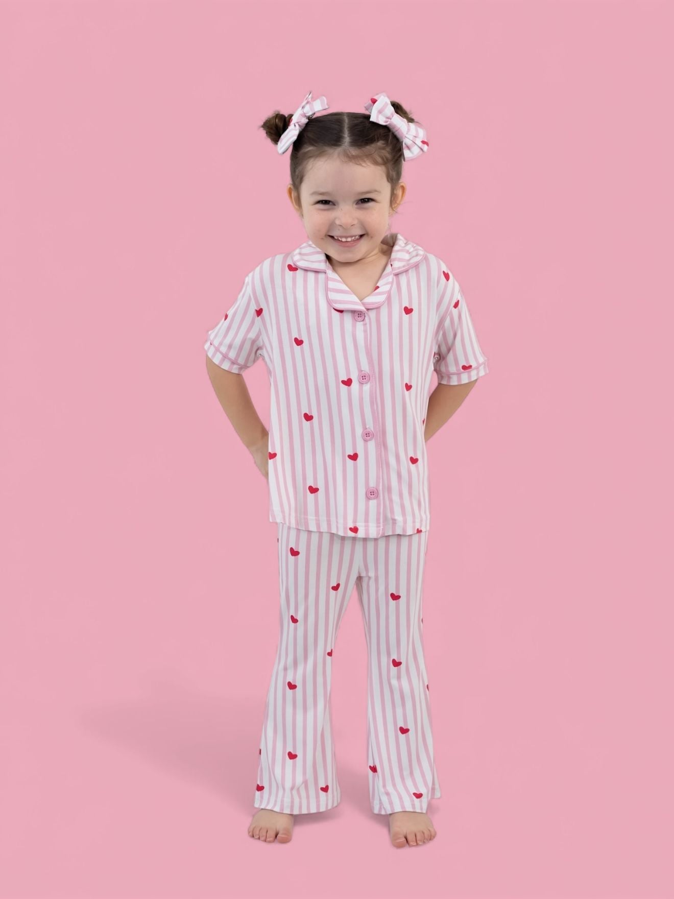 Sweet stripes, tiny hearts, and a twirl-worthy twist! The Sweetheart Stripes Dream Girl’s Flare Set features a short-sleeve button-up top and matching flare pants in playful pink-and-white stripes sprinkled with bright little hearts. Made from our signature buttery-soft bamboo fabric, this set is breathable, stretchy, and perfect for lounging, playtime, or drifting into sweet dreams.