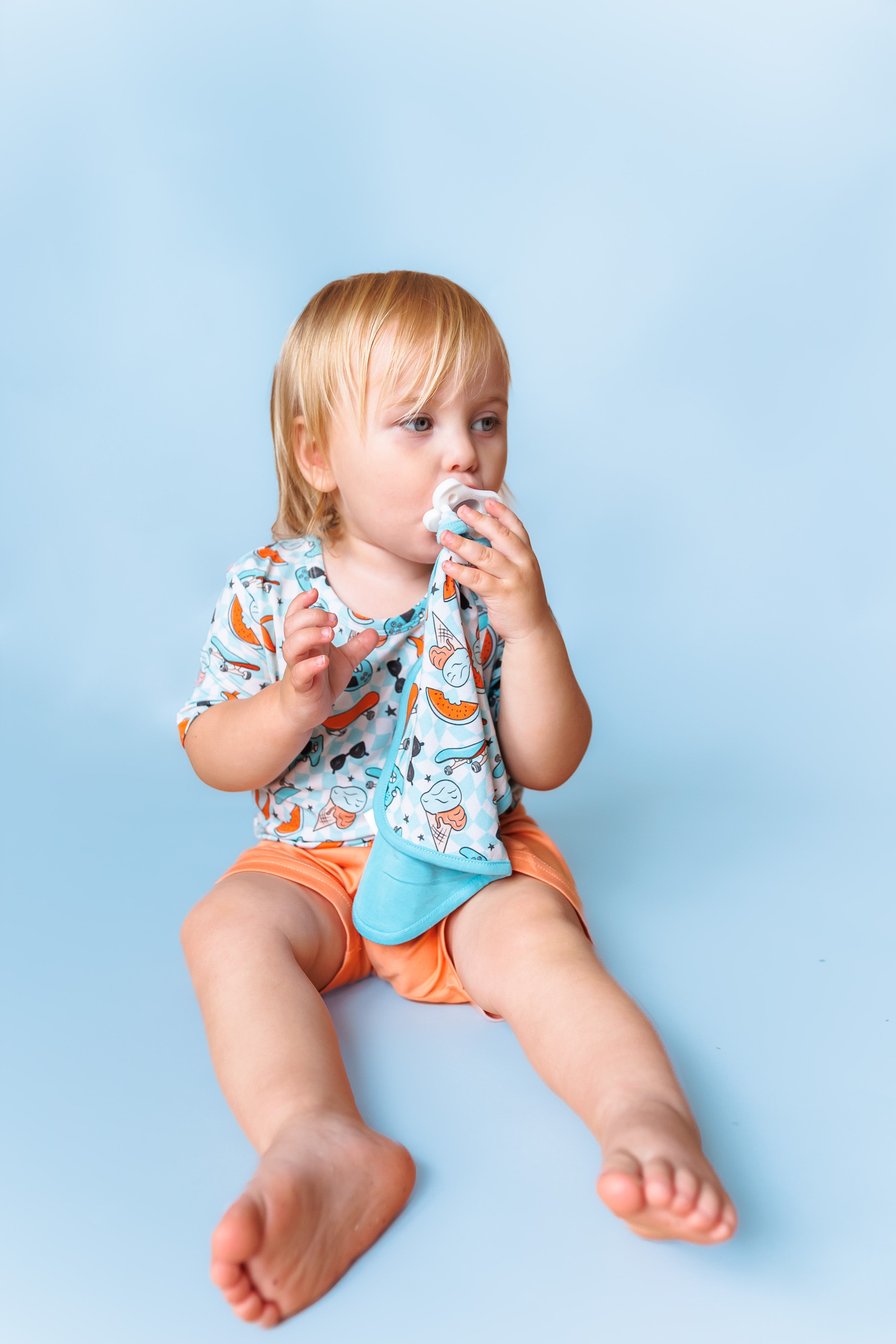 Stay effortlessly stylish this summer with the Waves + Shades Checkers Dream Lovey! This fun lovey features a playful summer print that will make your little one stand out. It doubles as a pacifier holder and is made with soft, eco-friendly bamboo material. Keep your baby happy and trendy!