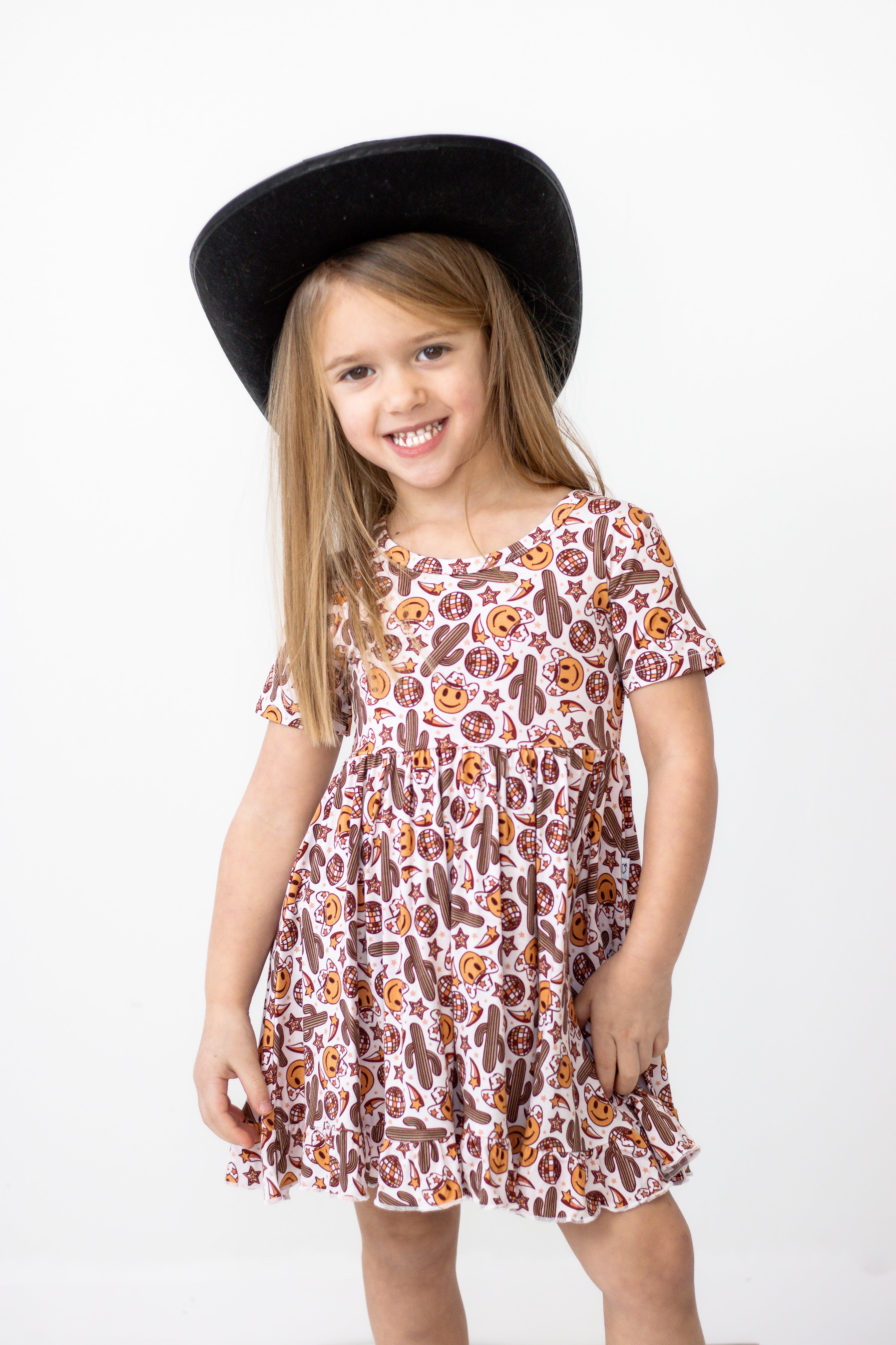 Have an absolute blast twirling in this buttery soft, bamboo material dress with short sleeves. The western disco print adds a touch of fun and playfulness to this dreamy ruffle dress. Say goodbye to stiff and uncomfortable outfits and hello to the ultimate comfort of Western Dreamzzz!