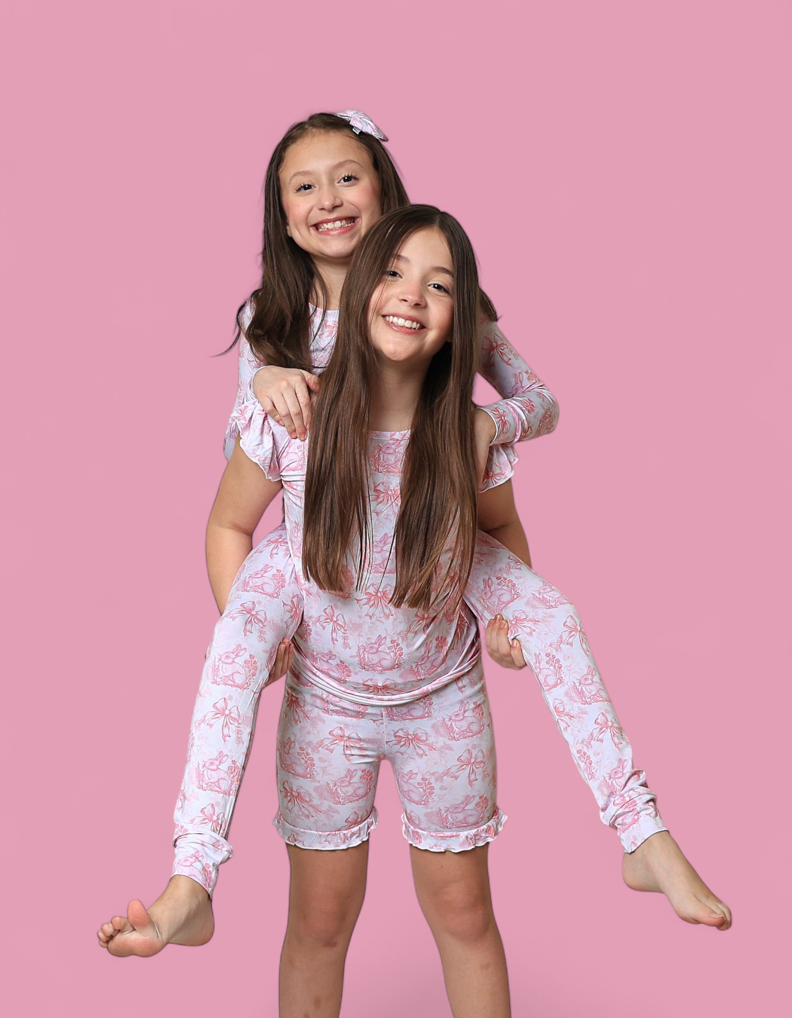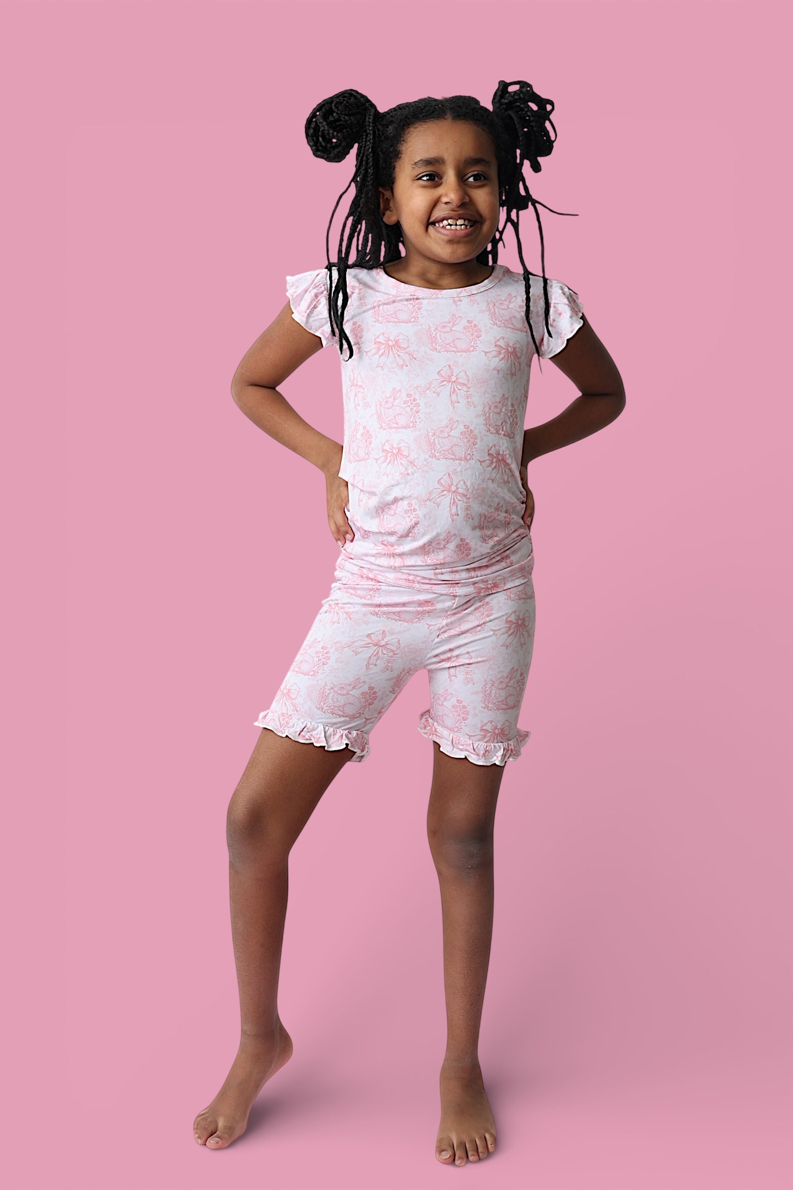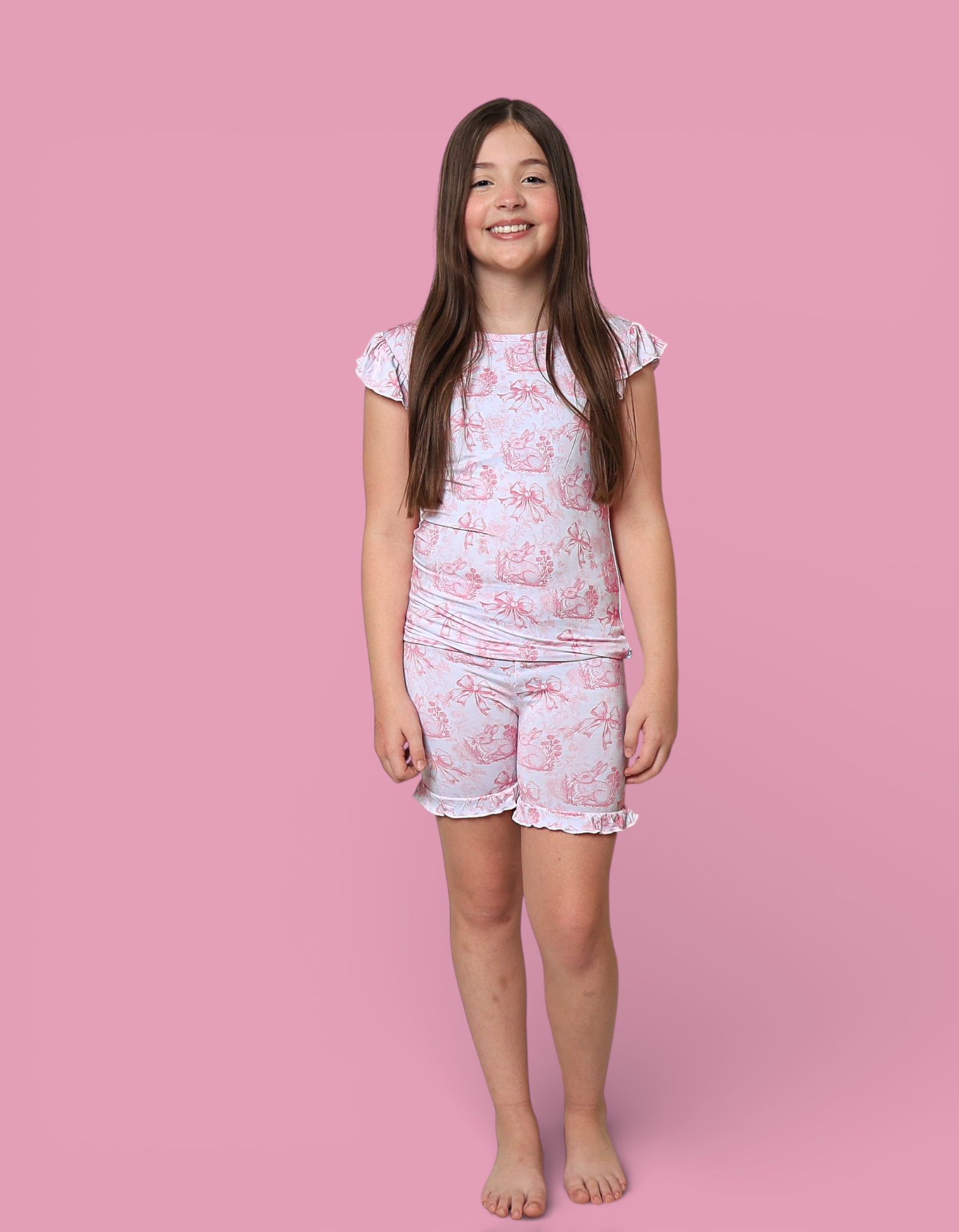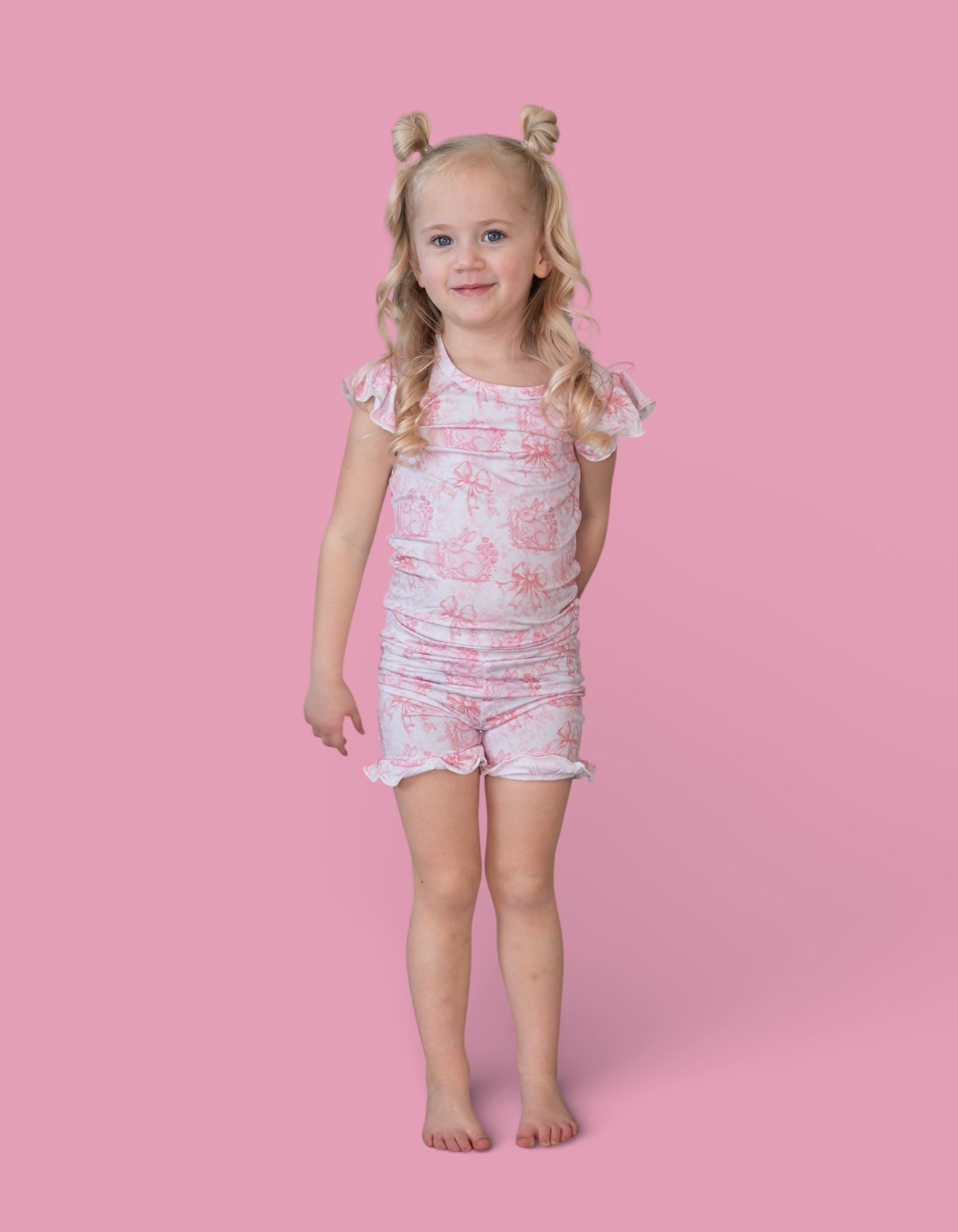 Pretty in pink and perfect for spring! Our Blush Bunny Toile Dream Ruffle Short Set features a delicate toile-style bunny and bow print in the sweetest blush tone — paired with flutter sleeves and ruffle hem shorts for an extra dose of charm. Ideal for Easter celebrations, spring adventures, and picture-perfect moments. 🌸✨