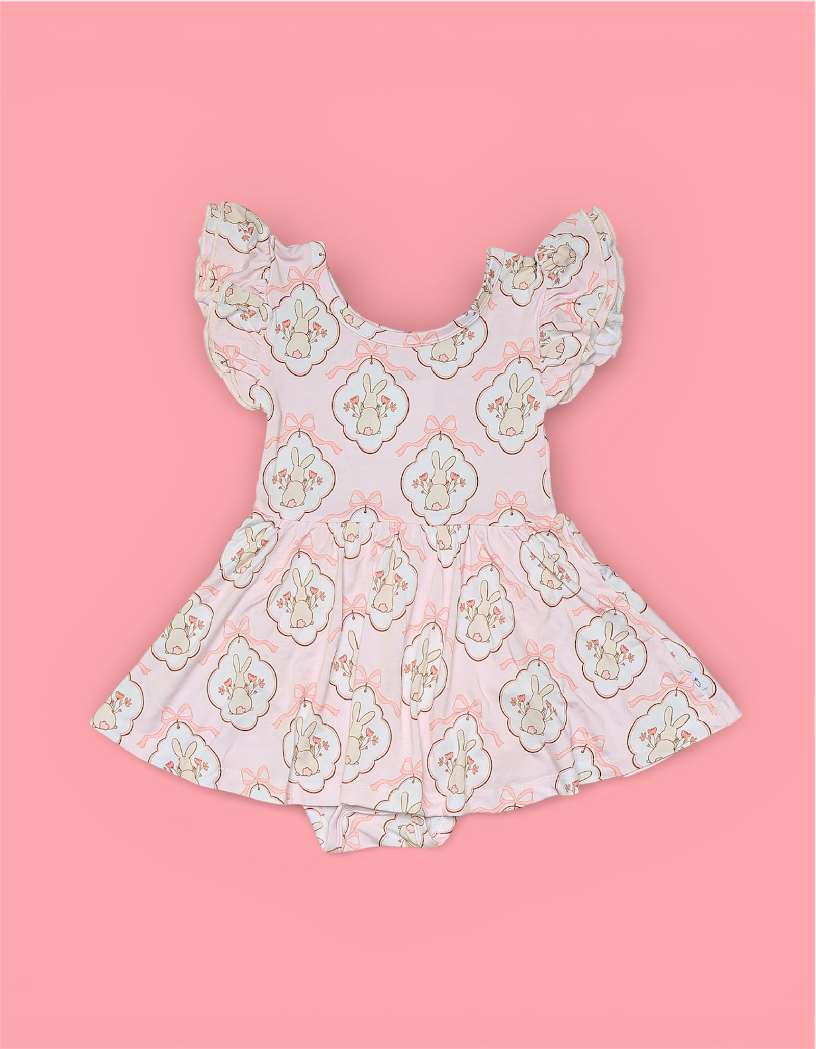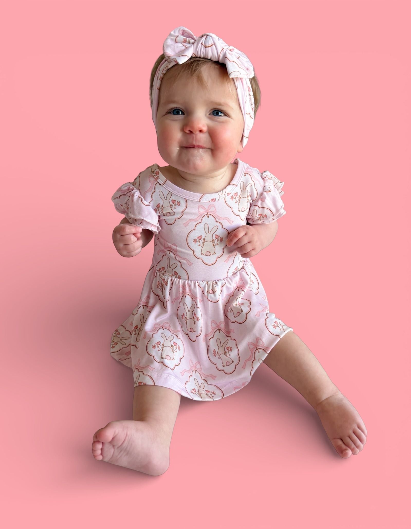 Sweet, twirly, and full of spring charm. Our Bunny Bow Blossoms Dream Bodysuit Dress features an adorable bunny-and-bow print in soft pastels — a picture-perfect design for Easter celebrations, spring photos, and everyday precious moments. Flutter sleeves and a flowy skirt give this piece a dainty, girly finish little ones will love. 🌿✨