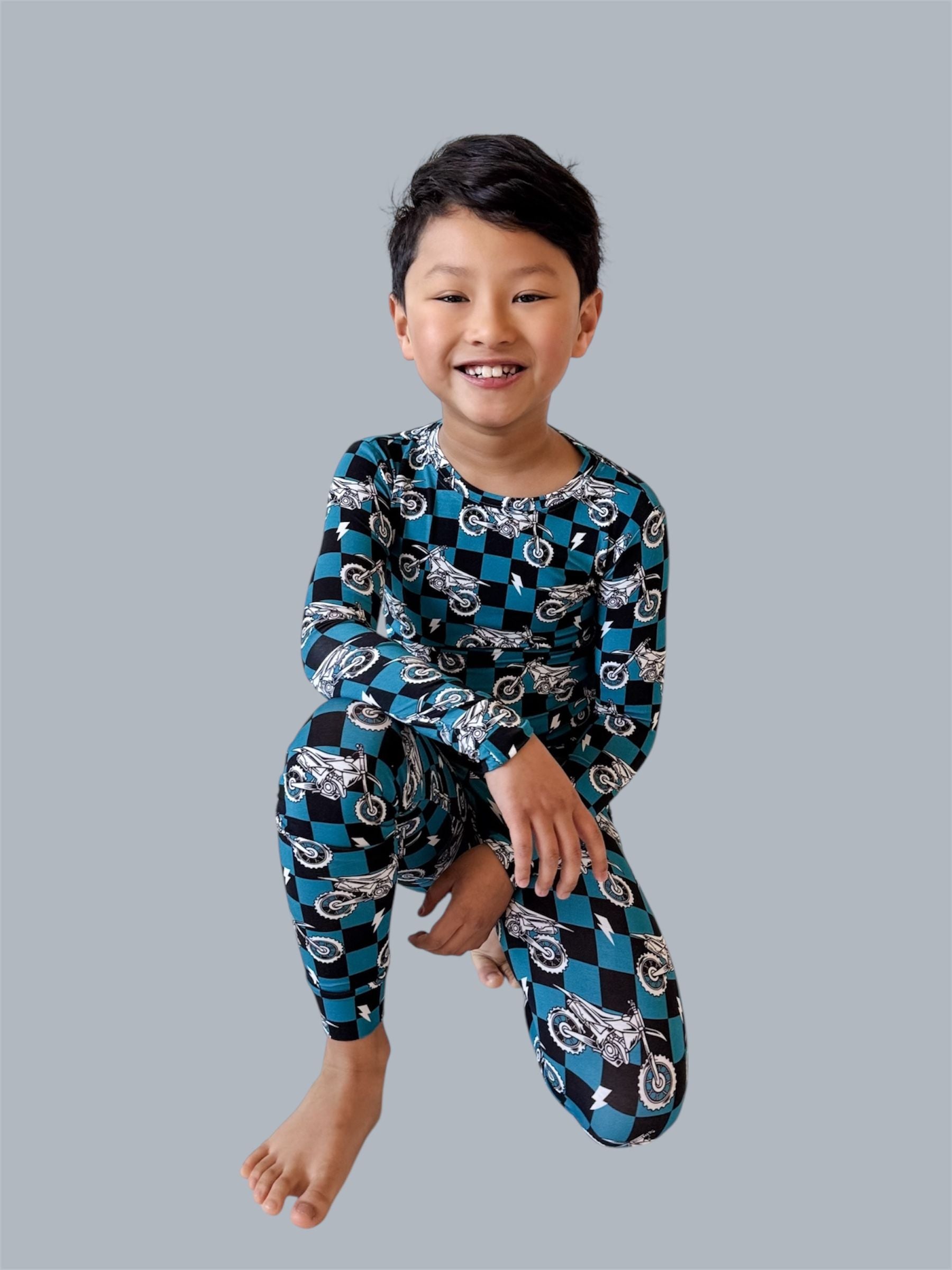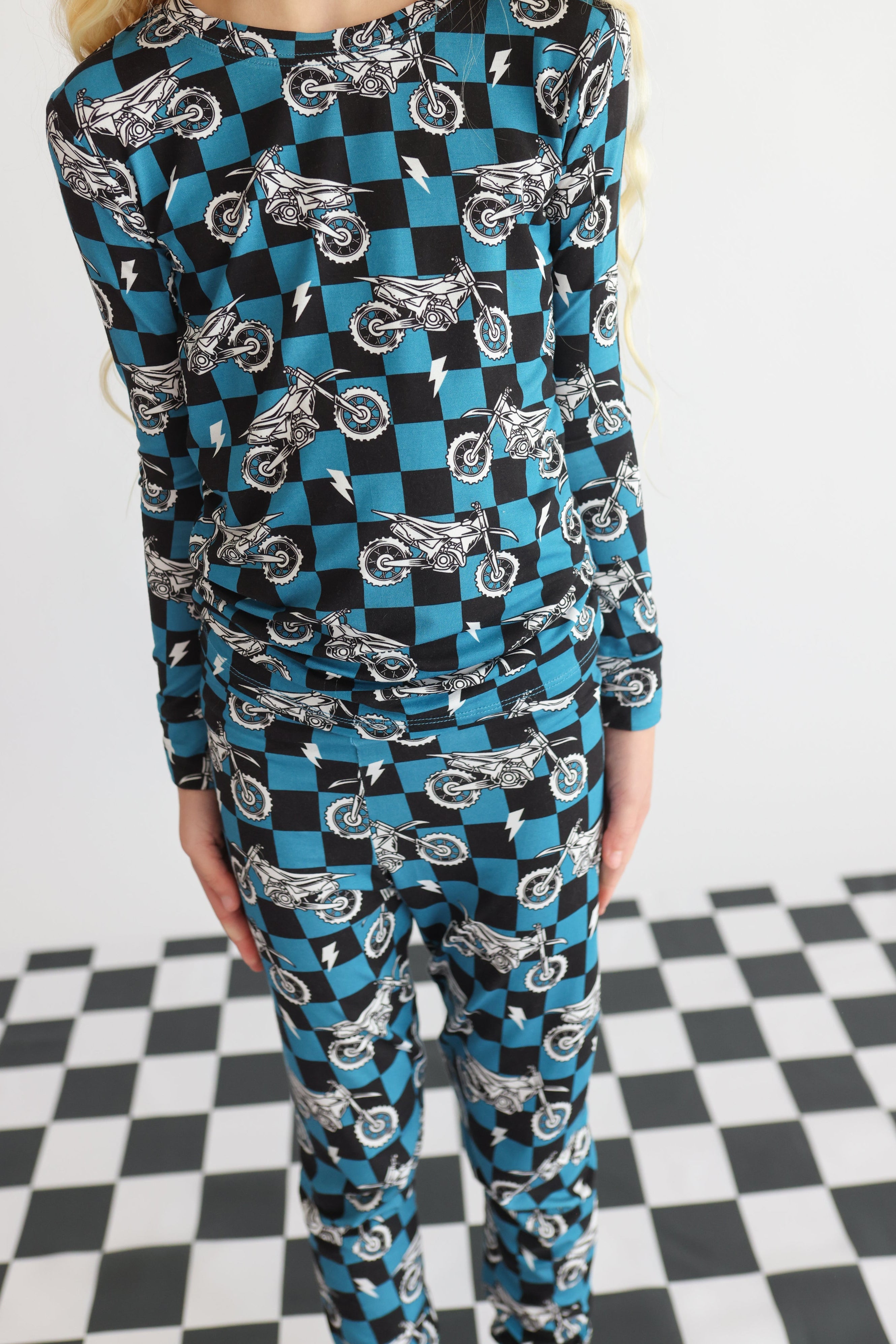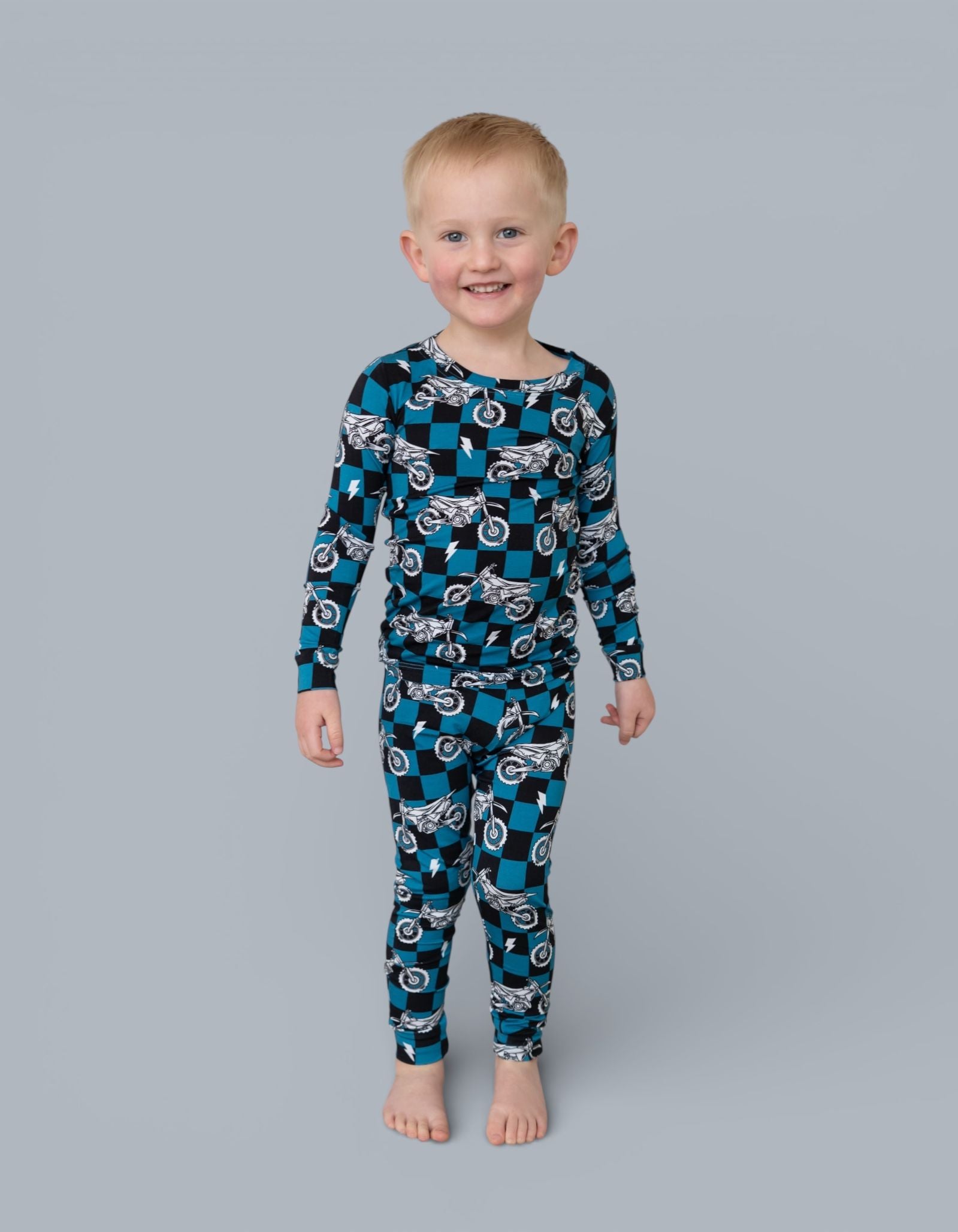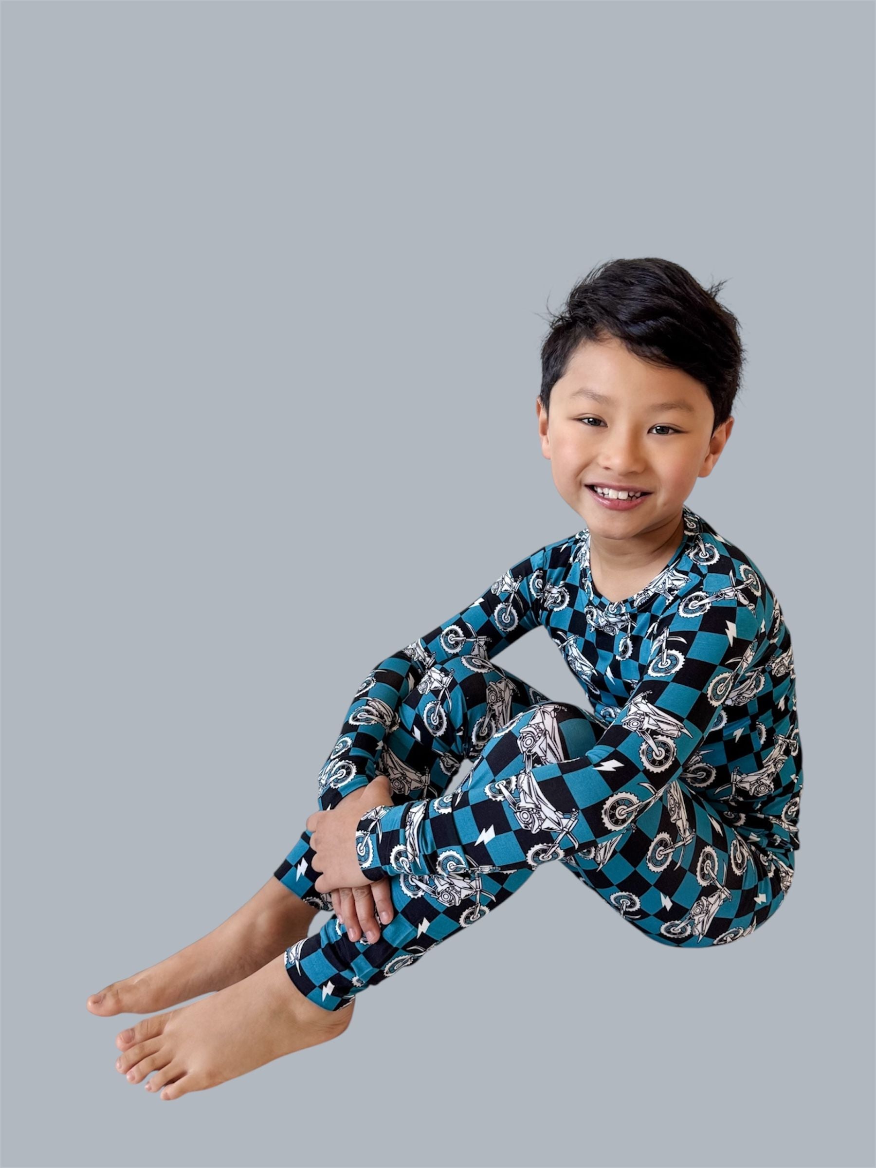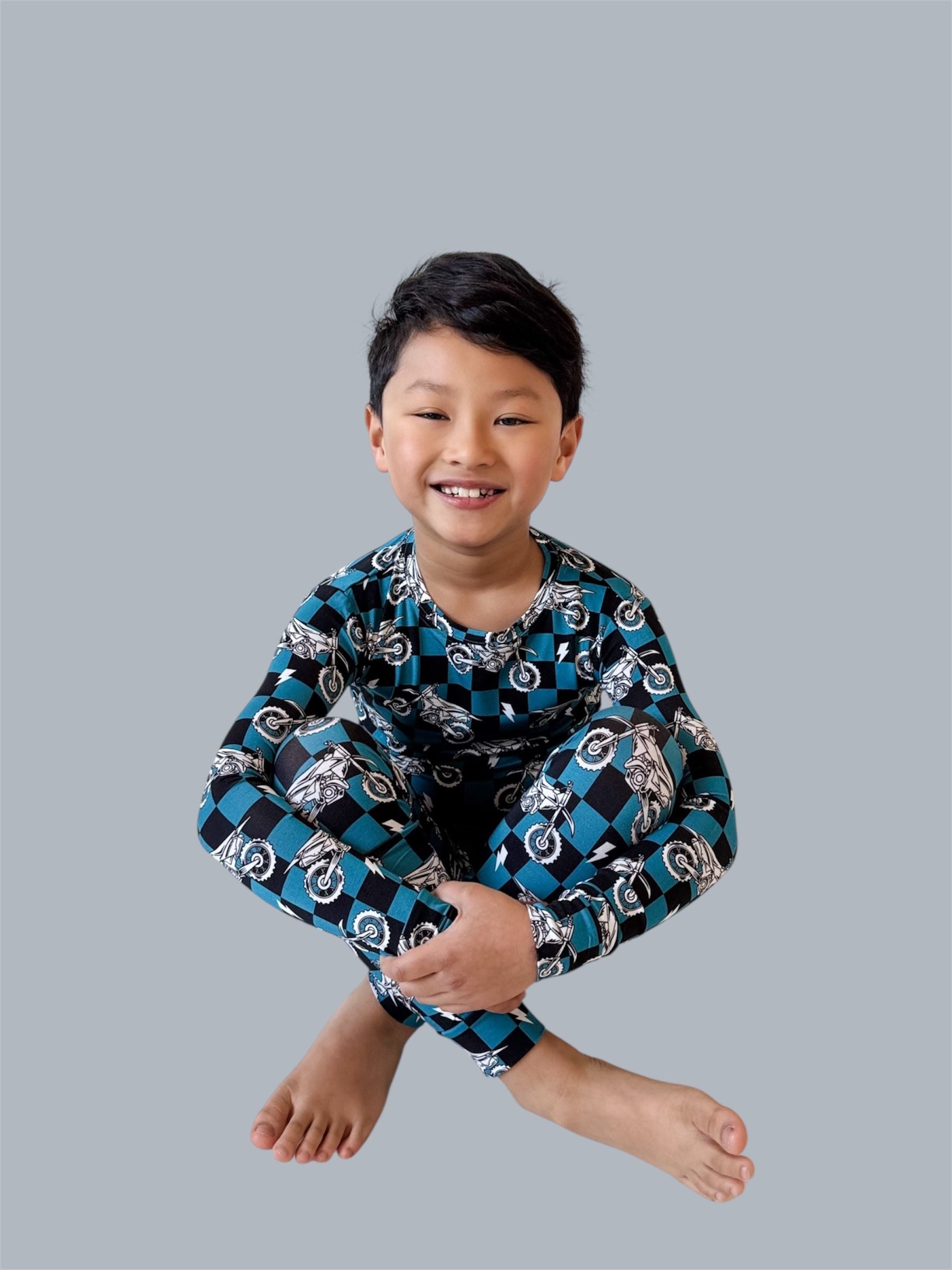 The Moto Mayhem Dream Set is perfect for little ones who love bold prints and all-day comfort. Featuring an edgy motorbike design paired with a classic checkered pattern and lightning bolt accents, this cozy two-piece set is made from our signature buttery-soft bamboo fabric for a breathable, gentle feel from playtime to bedtime.