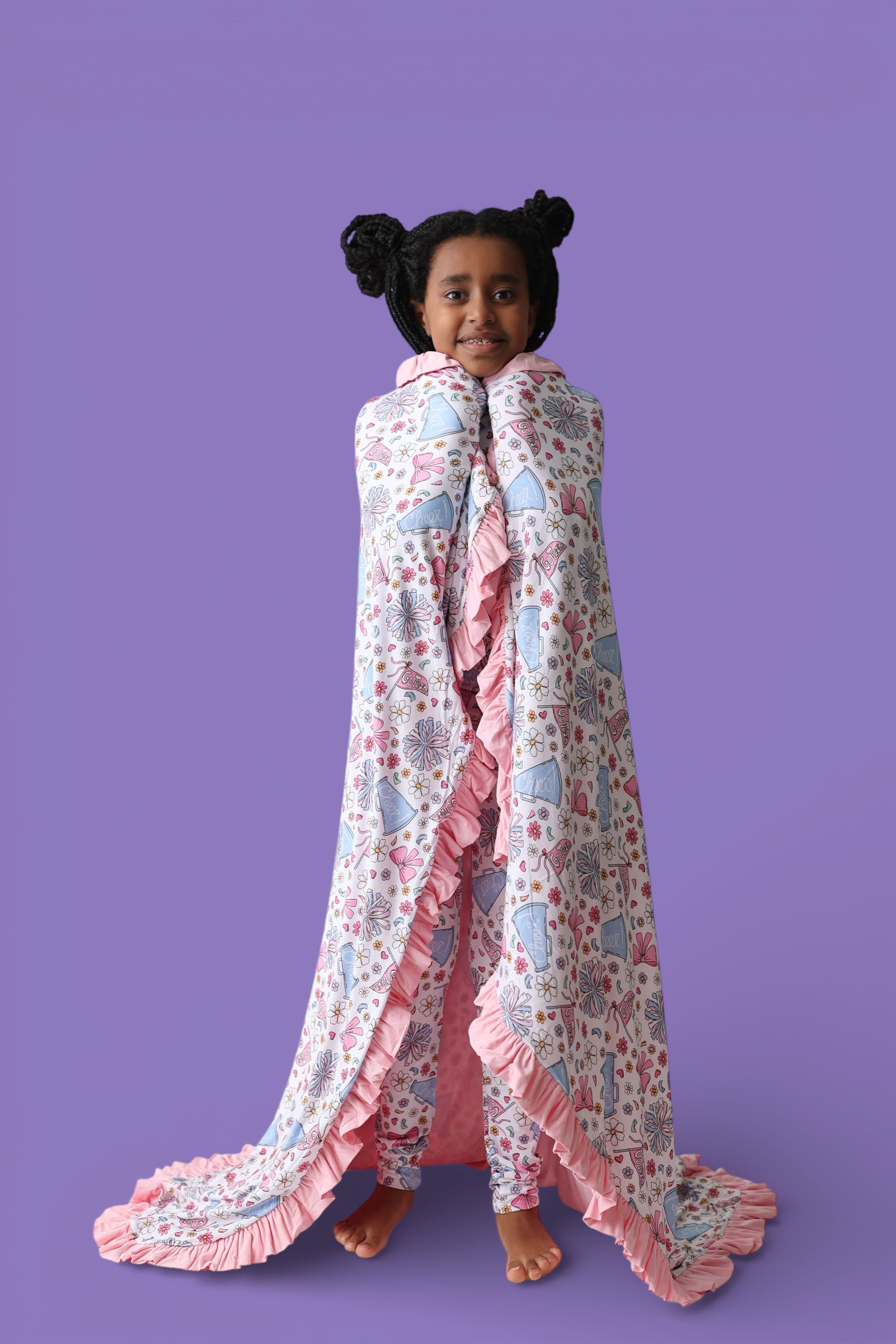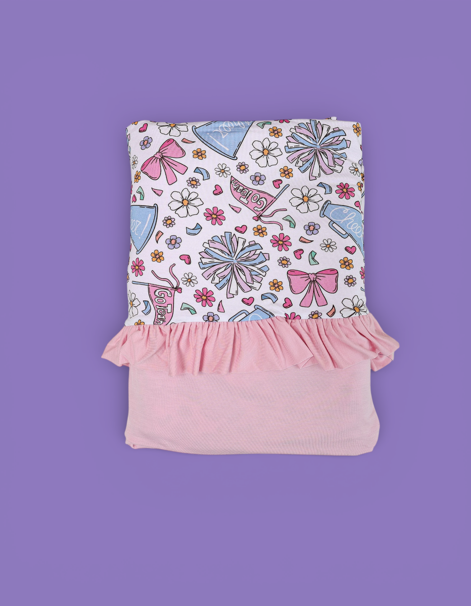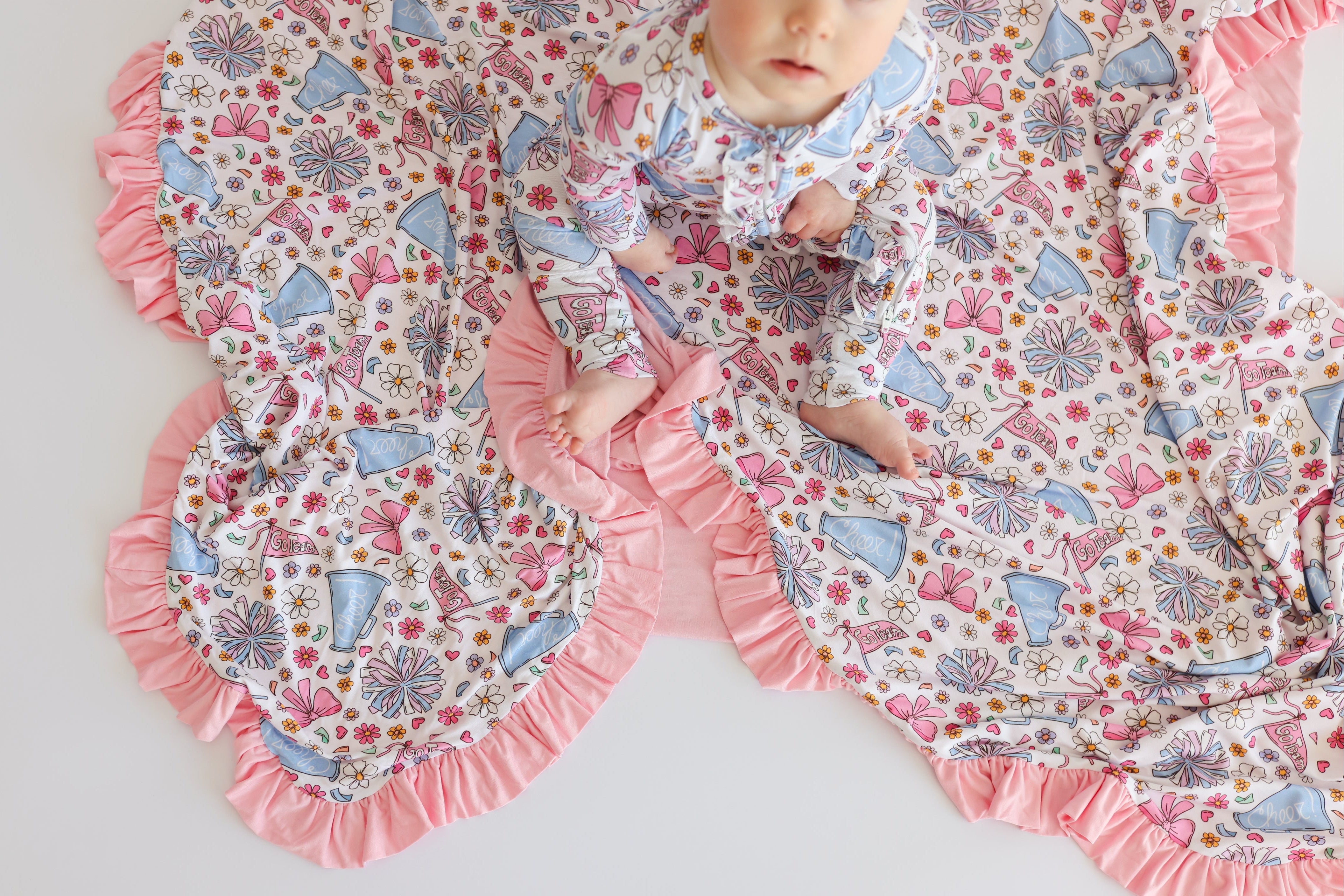 The Pom Power Dream Ruffle Blanket is made for cozy cuddles with a playful pop of fun 💖. Featuring a bright pom-pom, bow, and cheer-inspired print, this blanket is finished with darling ruffle trim for extra charm. Crafted from our signature buttery-soft bamboo fabric, it’s breathable, gentle, and perfect for everyday snuggles at home or on the go ✨.
