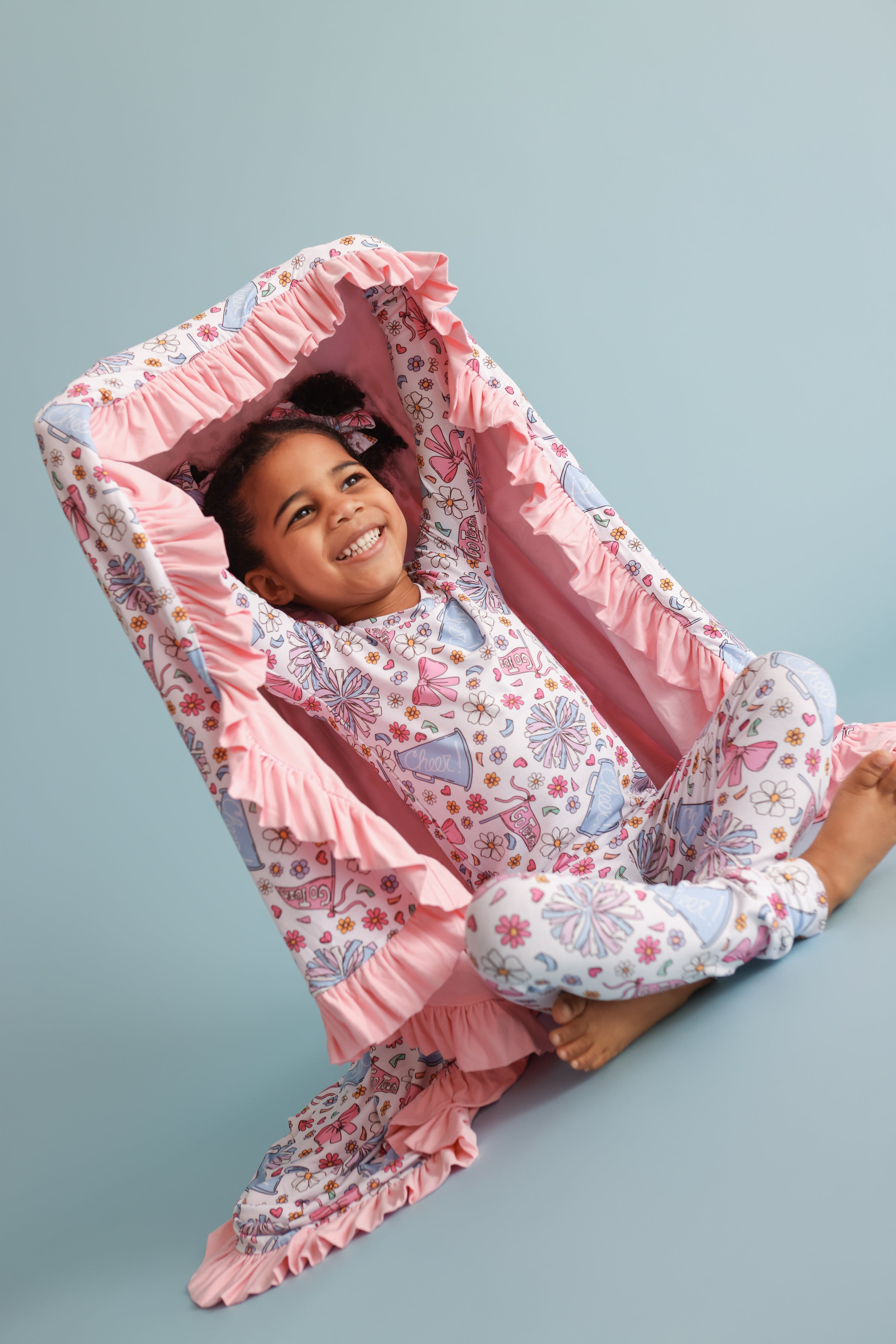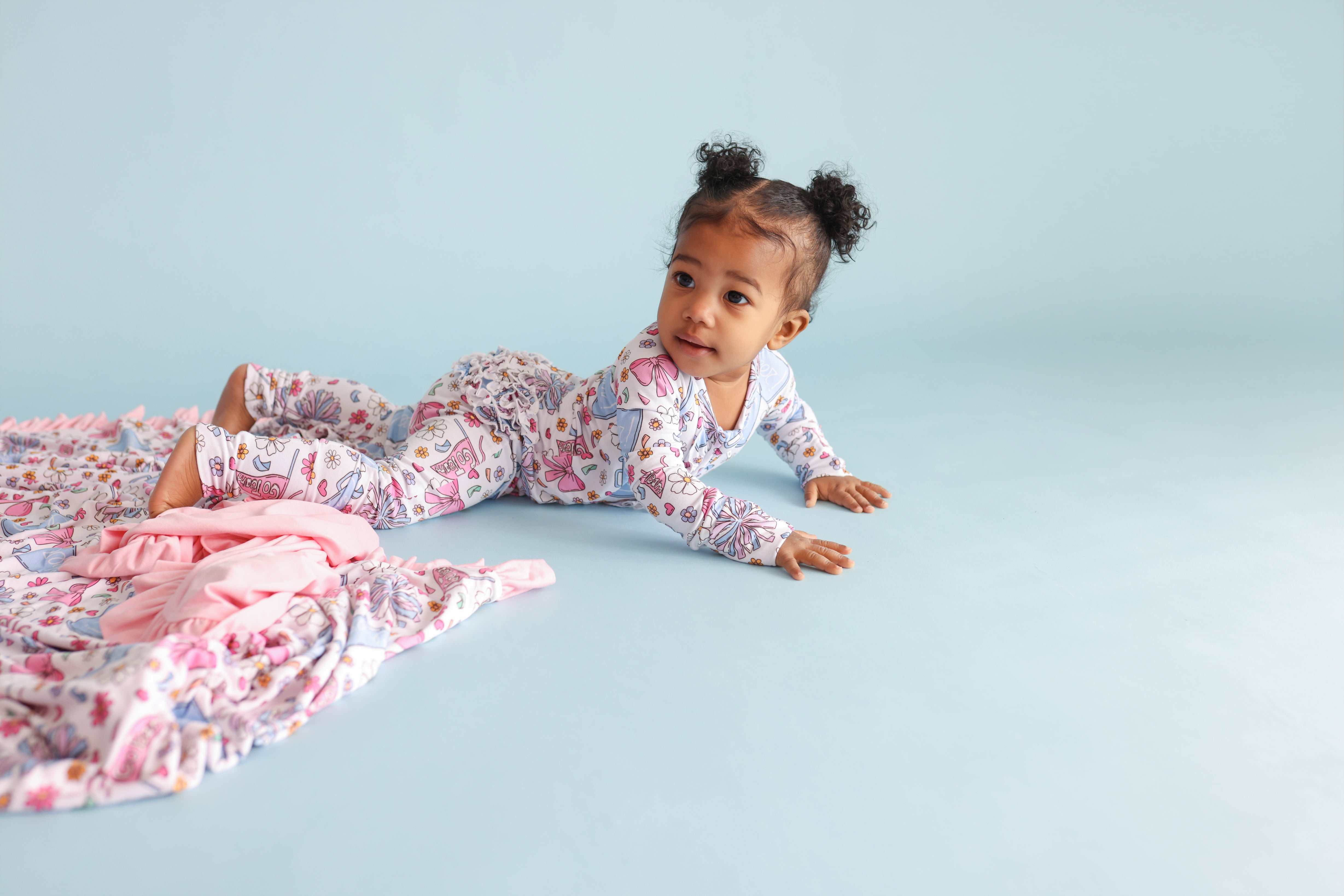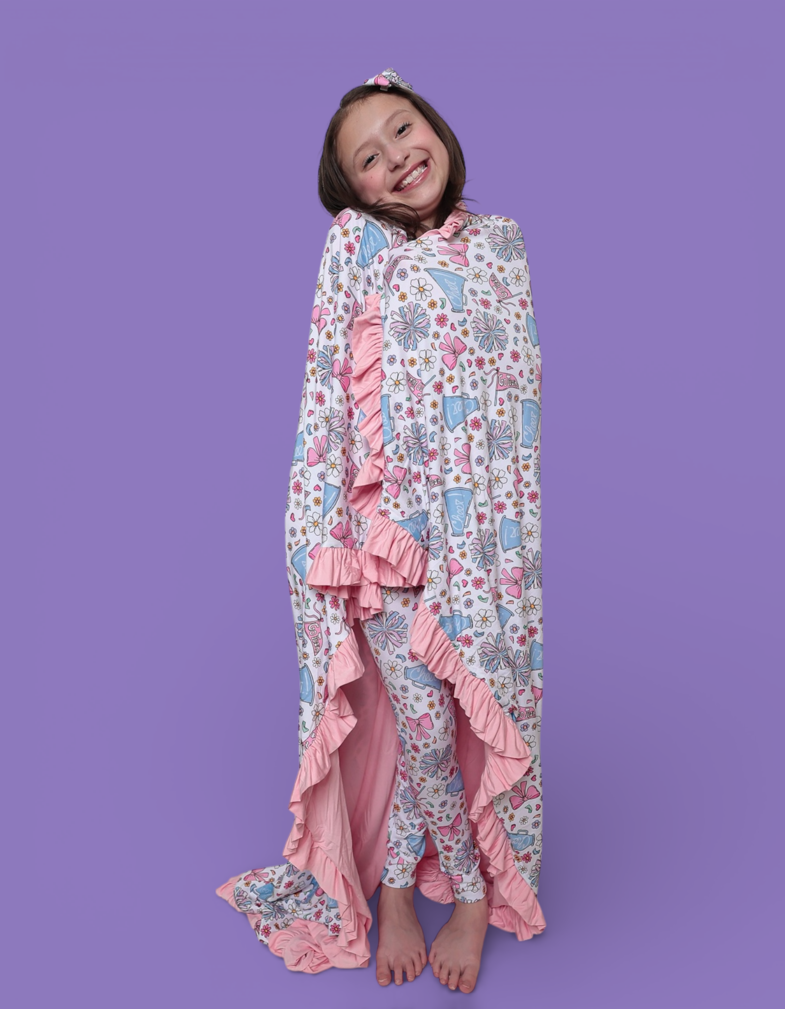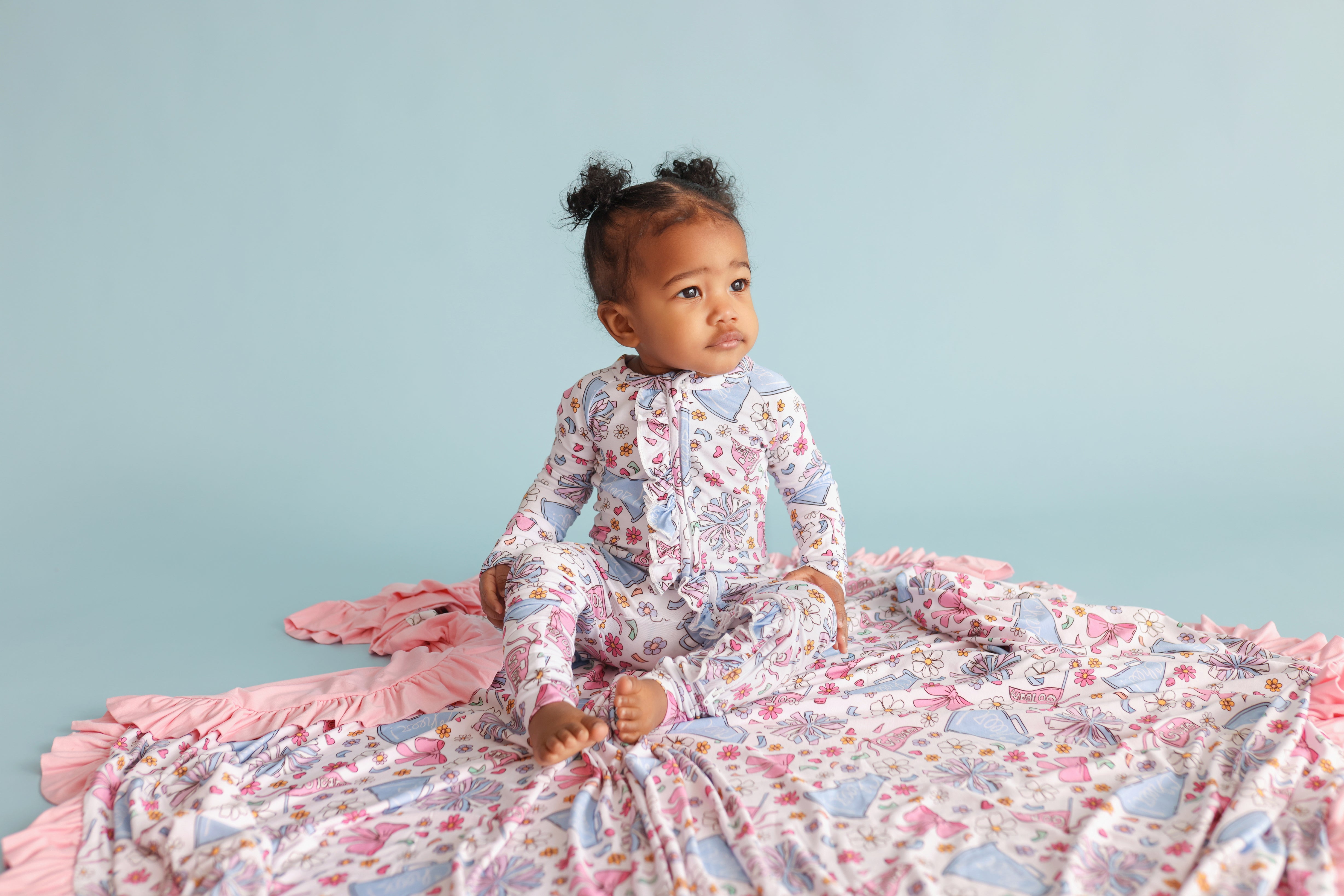The Pom Power Dream Ruffle Blanket is made for cozy cuddles with a playful pop of fun 💖. Featuring a bright pom-pom, bow, and cheer-inspired print, this blanket is finished with darling ruffle trim for extra charm. Crafted from our signature buttery-soft bamboo fabric, it’s breathable, gentle, and perfect for everyday snuggles at home or on the go ✨.