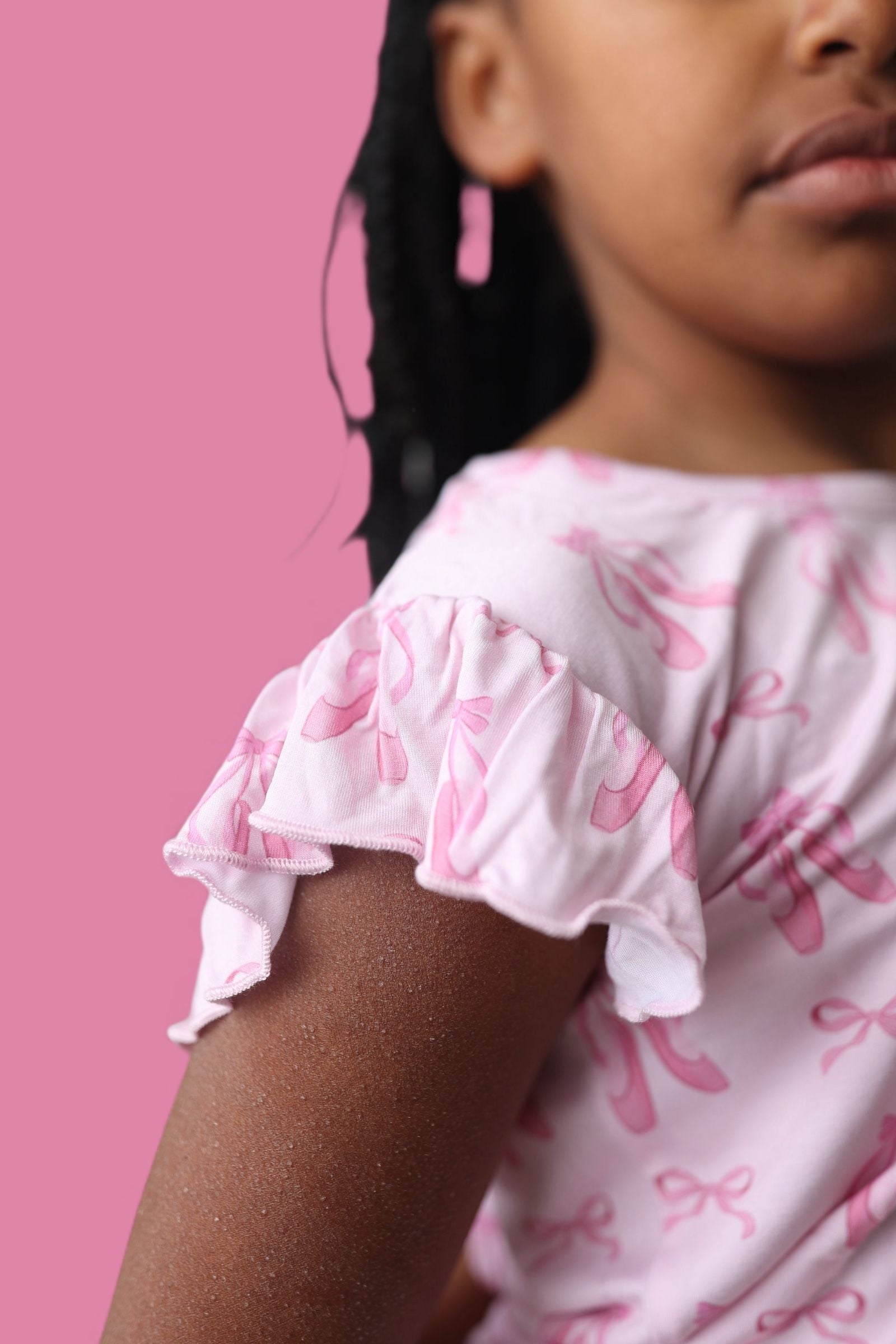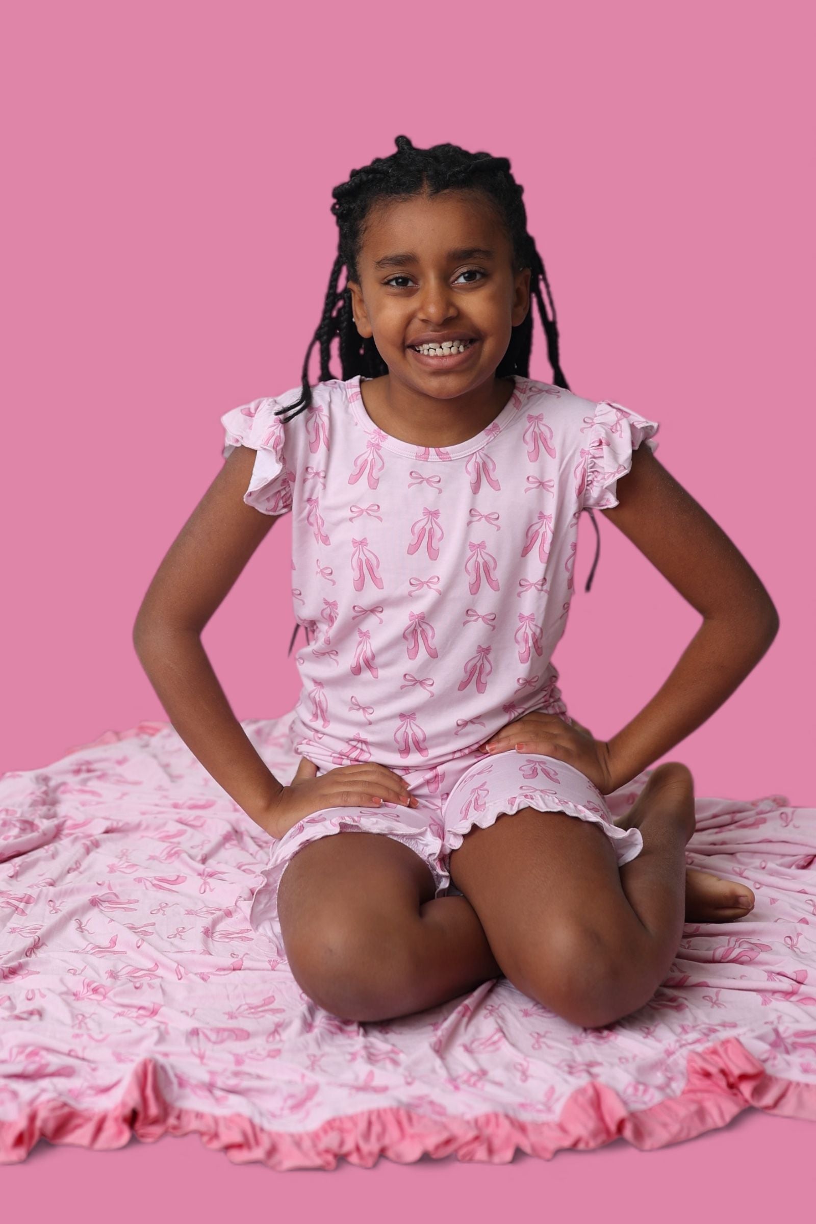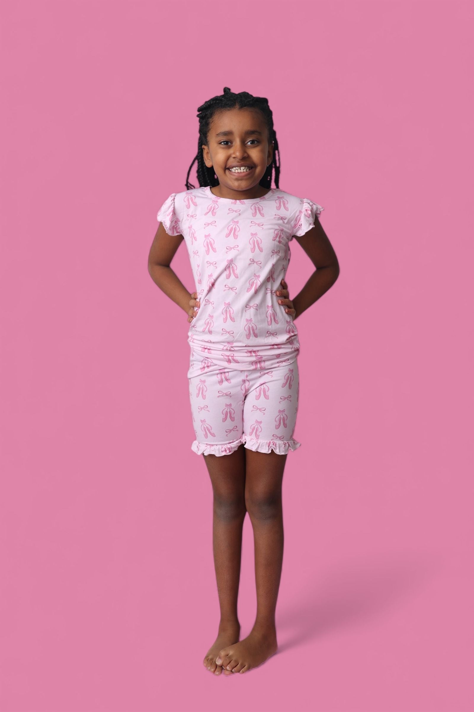 Playful, breezy, and ballerina-sweet! The Ballet Bow Bliss Dream Ruffle Short Set is the perfect outfit for sunny days and cozy nights. Featuring a ruffle-trimmed top and matching shorts in our darling ballet slipper + bow print, this set is crafted from our buttery-soft bamboo fabric for stretch, breathability, and all-day comfort.