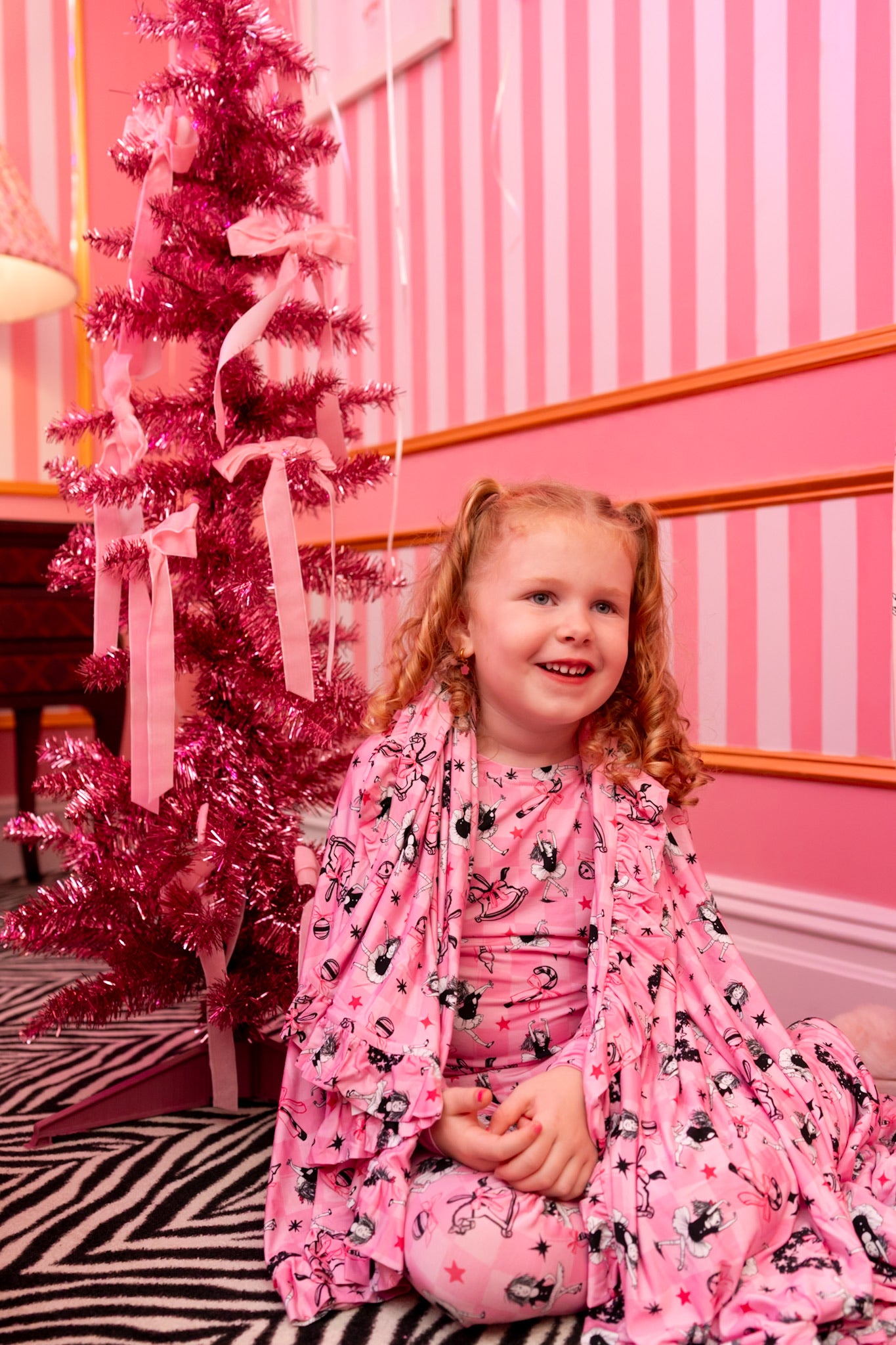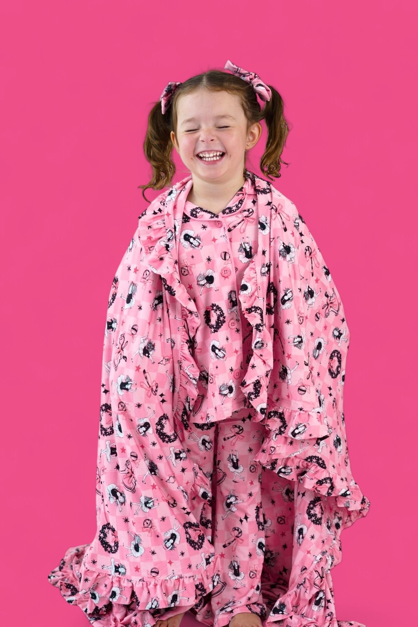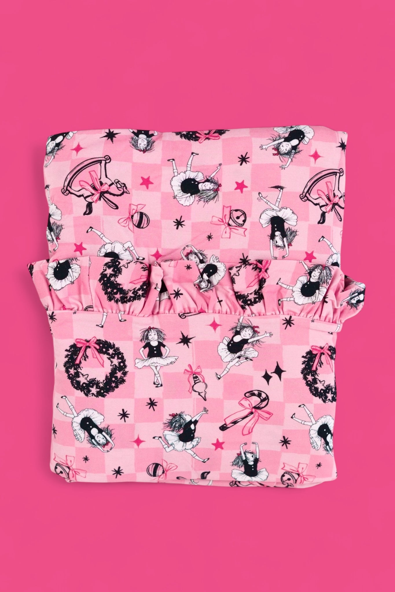 Snuggle into the magic of the season with the Eloise Holiday Ballet Dream Blanket! Featuring the iconic Eloise in her holiday ballet best—twirling across a pink checkerboard background with wreaths, ornaments, bows, and stars—this blanket brings all the festive flair. Made from our signature buttery-soft fabric, it’s perfect for movie nights, holiday naps, or gifting a little Plaza-inspired magic.