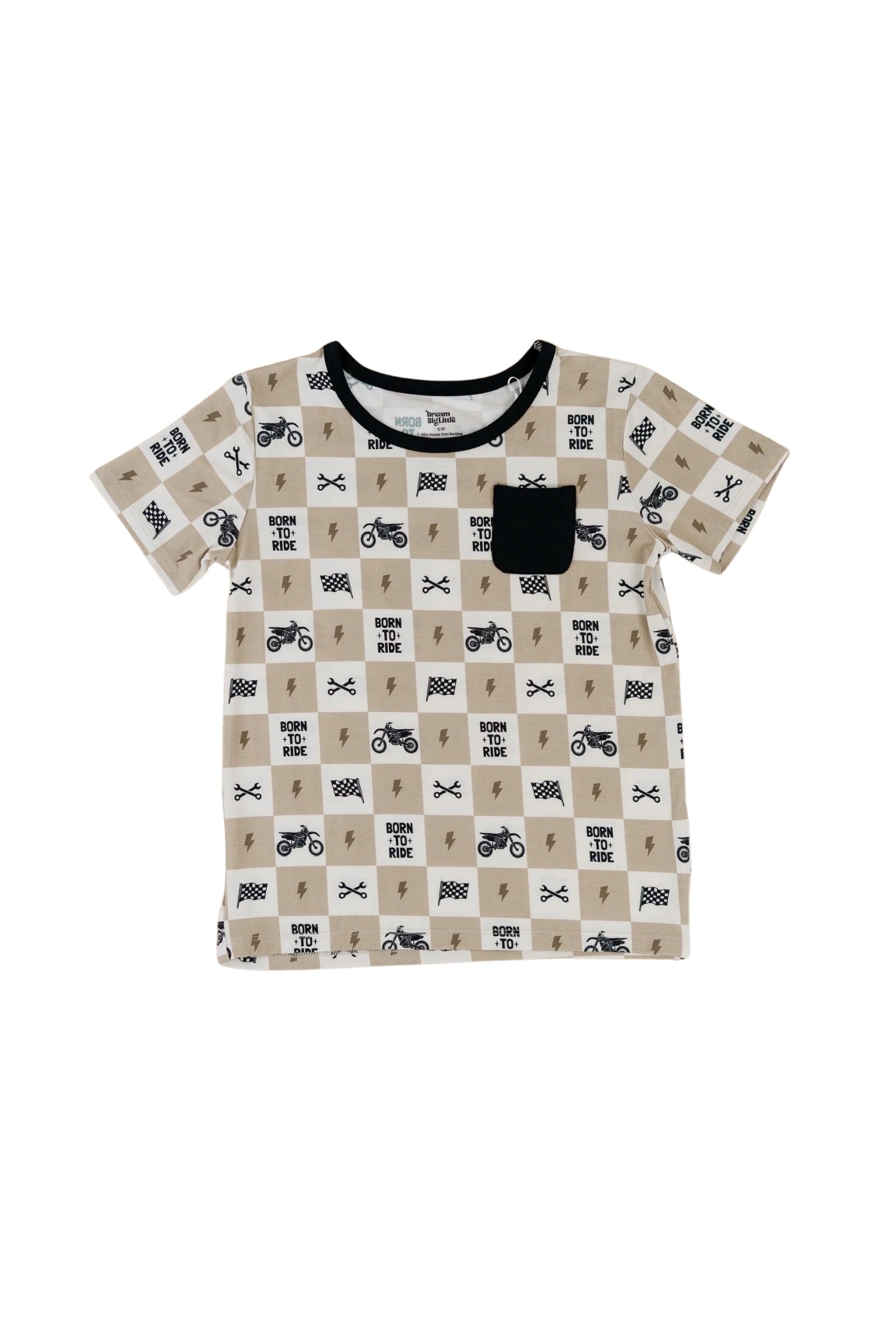 Rev up your little one’s spring wardrobe with the Born to Ride Dream Pocket Tee! This spirited design features a trendy checkerboard pattern in neutral beige and white tones, adorned with bold motorcycle-inspired details. From sleek motorcycles and iconic black-and-white racing flags to wrenches and lightning bolts, this print is packed with energy and adventure. The “Born to Ride” text adds the perfect finishing touch for budding speed enthusiasts.