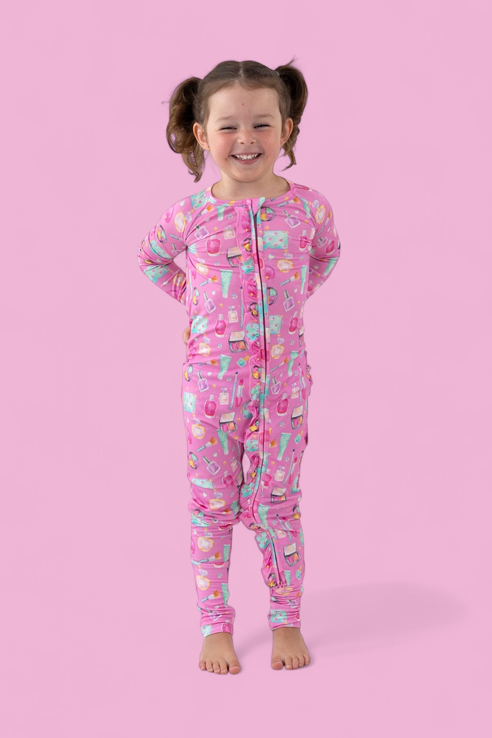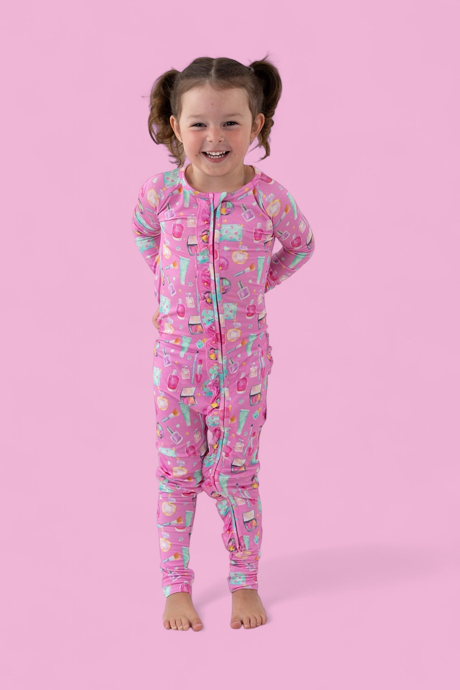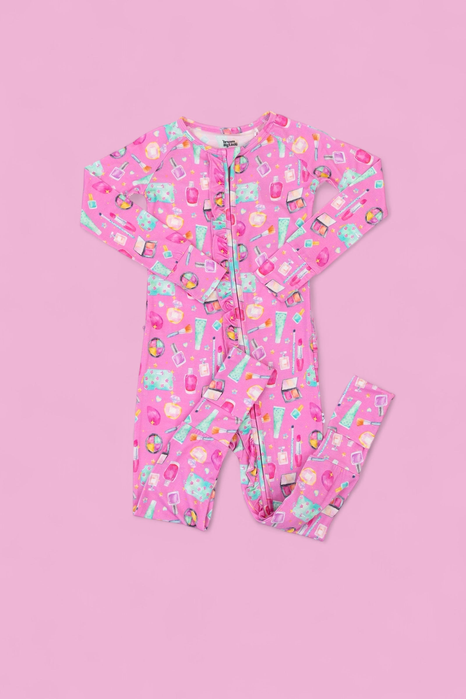 Add a touch of sparkle to your little one’s day with our Glamour Magic Dream Ruffle Romper! This one-piece wonder combines adorable ruffle details with the softest bamboo fabric for a look that’s as comfy as it is cute. Covered in our playful pink “Glamour Magic” print—complete with makeup, perfume, and beauty icons—this romper is perfect for naps, playdates, or dressing up just for fun.