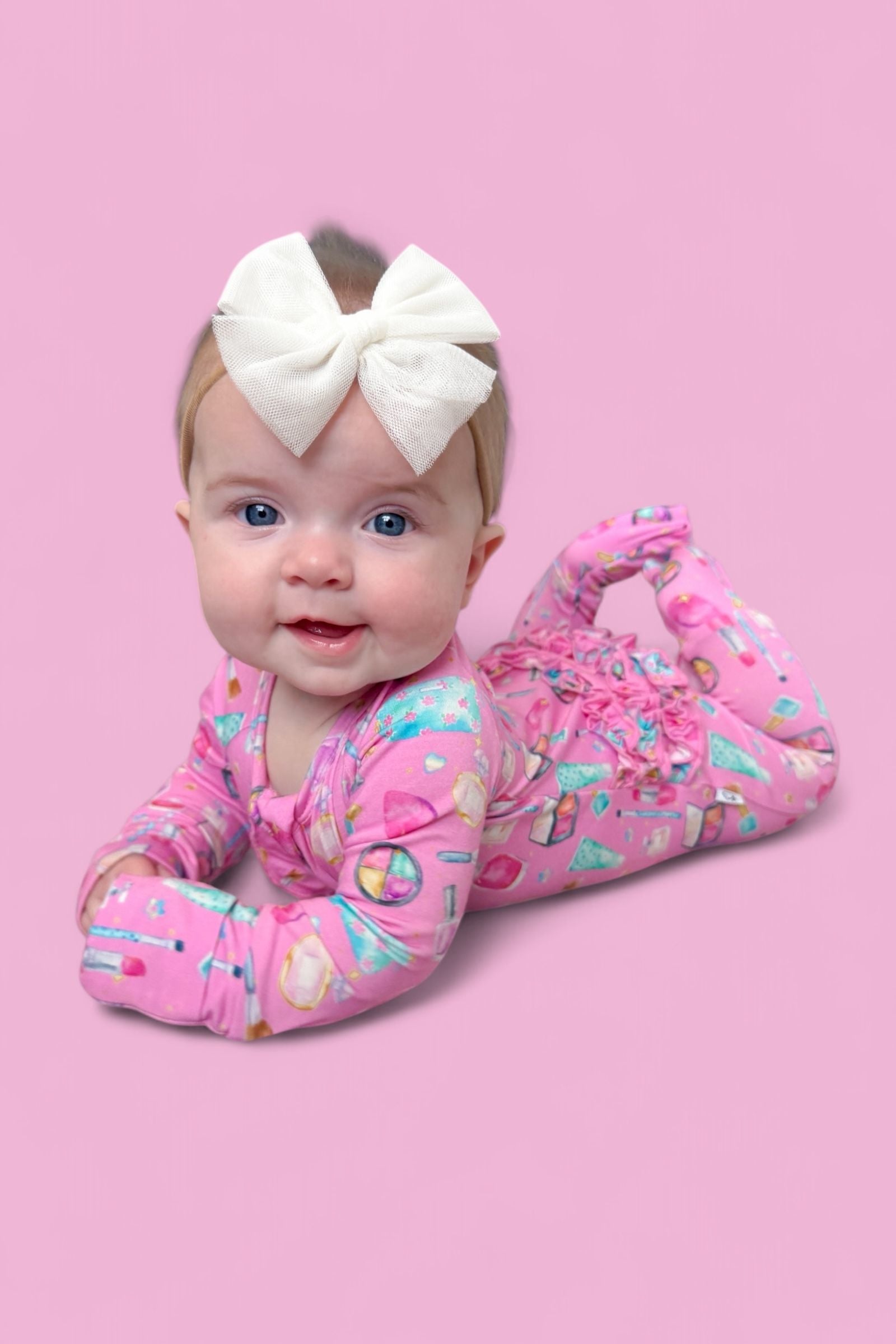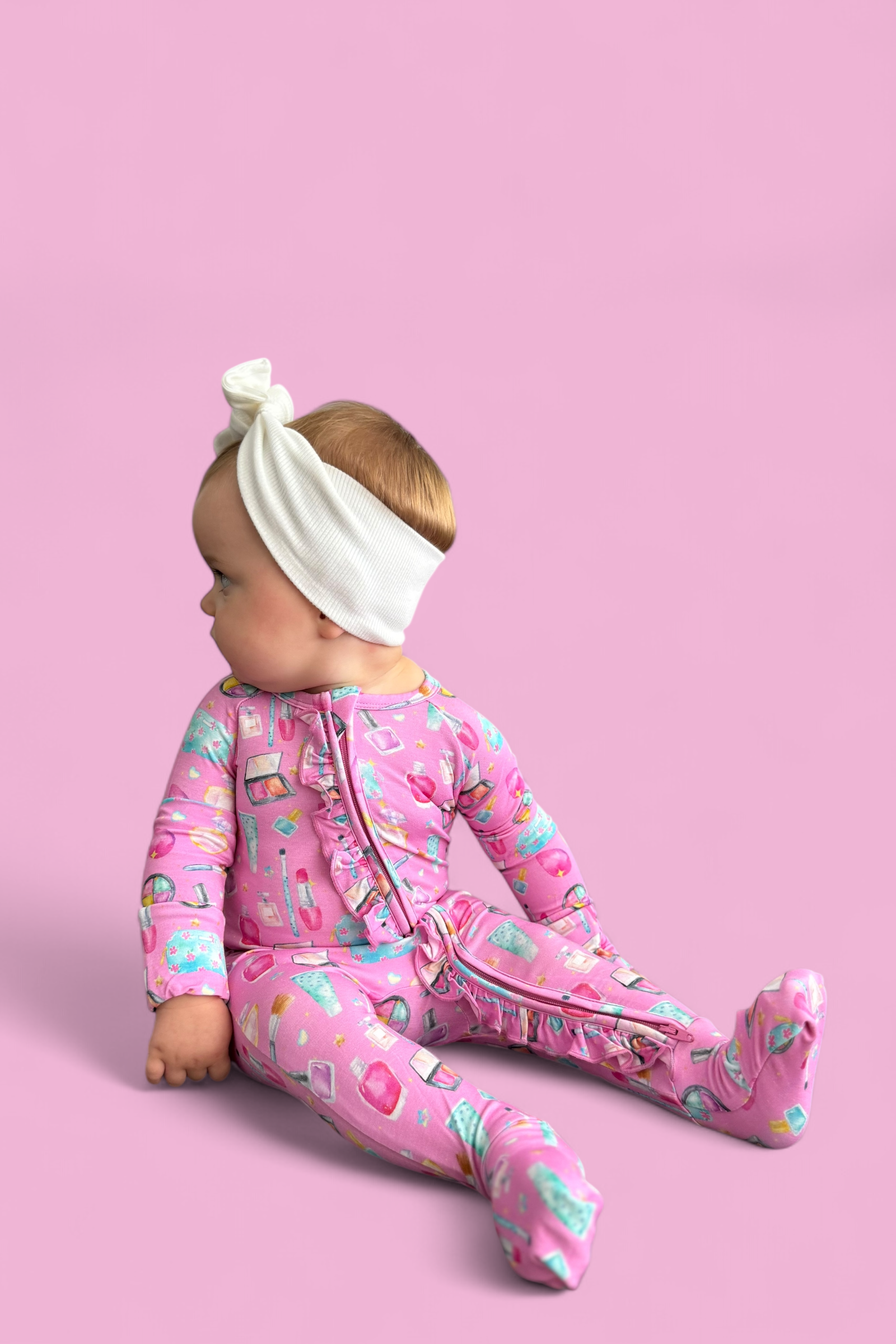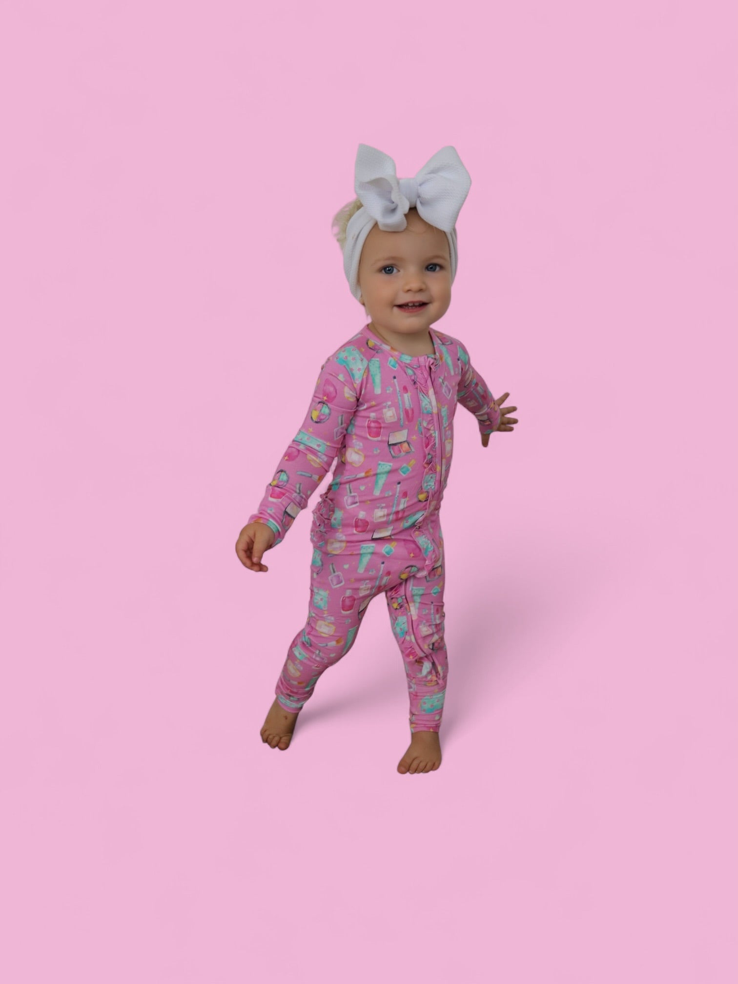 Add a touch of sparkle to your little one’s day with our Glamour Magic Dream Ruffle Romper! This one-piece wonder combines adorable ruffle details with the softest bamboo fabric for a look that’s as comfy as it is cute. Covered in our playful pink “Glamour Magic” print—complete with makeup, perfume, and beauty icons—this romper is perfect for naps, playdates, or dressing up just for fun.
