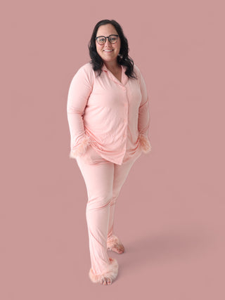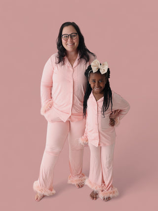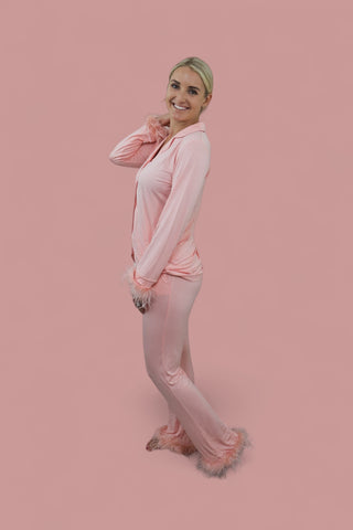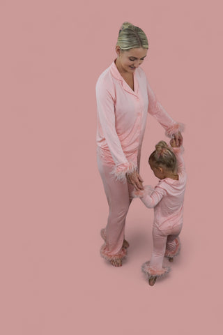 Our top not only has a relaxed feel with button down but also has removable feathers! Our Dream flare pants also feature functional pockets. Relax, sleep and cozy up with the family with our zero irritation tag-less DreamyZzz.