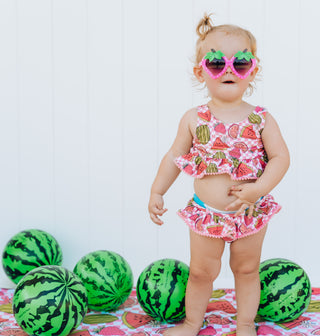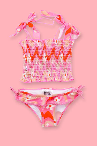All new and girlie Dream Tankini Two Piece Swim Suit! Made with comfort and stretch in mind, this eye-catching suit features a pom-pom trim and ruffled top and bottom for maximum style and beach-loving vibes. Our UPF 50+ swim fabric will keep your little ones covered under the sunny rays.