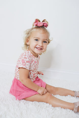 Make all her dancing dreams come true with Dancing Dreamz Dream Tutu Bodysuit dresses! These beautiful and fun tutu bodysuit dresses feature a ballet theme, and are made from soft and comfortable bamboo material. Perfect for hopping, twirling, and spinning, these little short sleeve dresses are sure to bring a smile to her face! She'll be the star of the show!