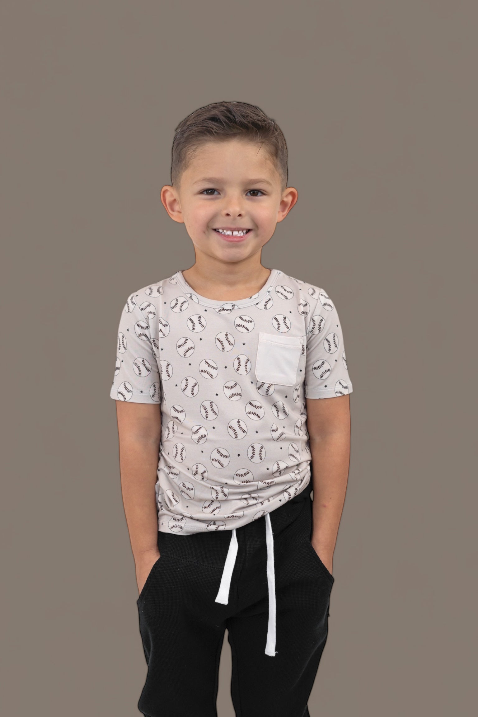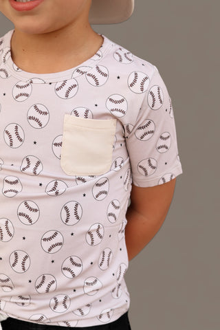 Let your child swing for the stars in this fun, baseball-themed pocket tee!