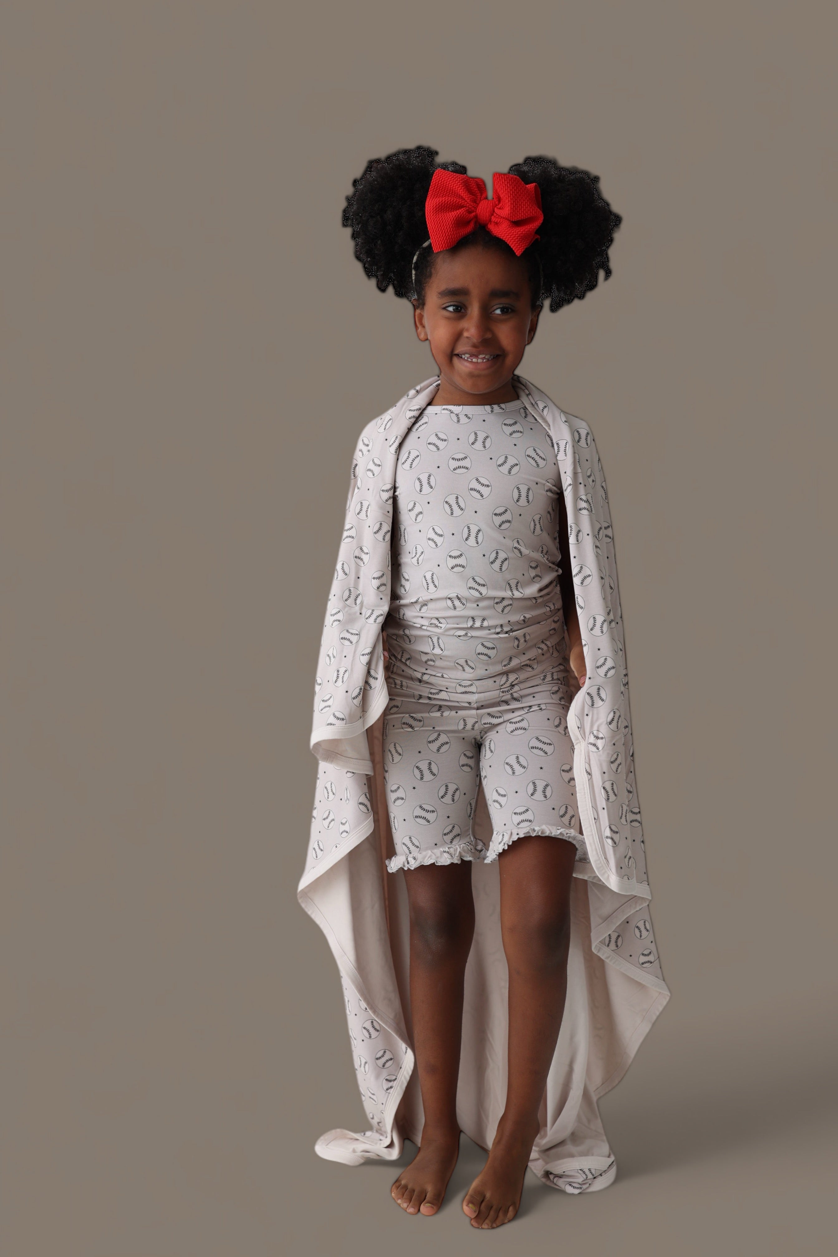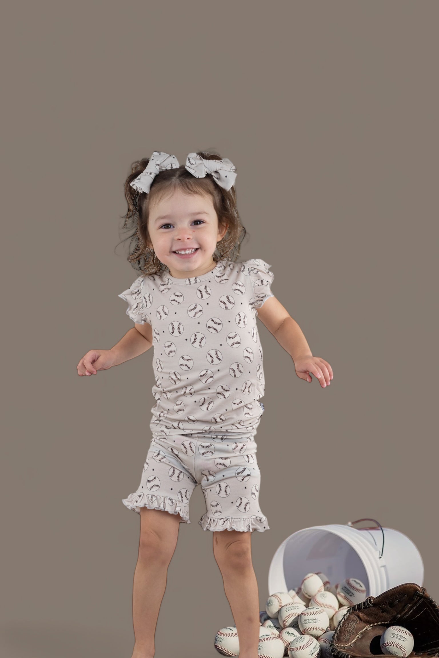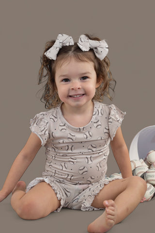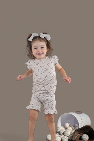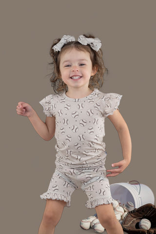 Introducing the Swing for the Stars Dream Ruffle Short Set—the ultimate girly outfit with a sporty twist! Featuring a playful light grey design with baseballs and navy stars, this ruffle short set is perfect for your little one to stay cute and comfy, whether she’s playing or napping. The adorable ruffle detailing makes this set a show-stopper, and we guarantee that people will ask where you found the cutest outfit!
