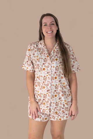Introducing the Flowers and Boots Women’s Dream Short Set, the perfect blend of comfort and style with a delightful cute military design! Crafted from the softest and most breathable seasonal bamboo viscose material, this set ensures you’ll feel amazing whether you’re lounging at home or enjoying a cozy night in. The relaxed button-down short sleeve top offers an effortlessly chic look, while the matching shorts feature a functional drawstring and pockets for added convenience.