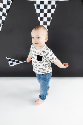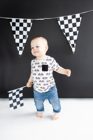 Take your style to the finish line with our Race Day Dream Pocket Tee. Made with comfortable bamboo material, this short sleeve top features a fun race print that will surely turn heads. Get ready to dream big and race in style.