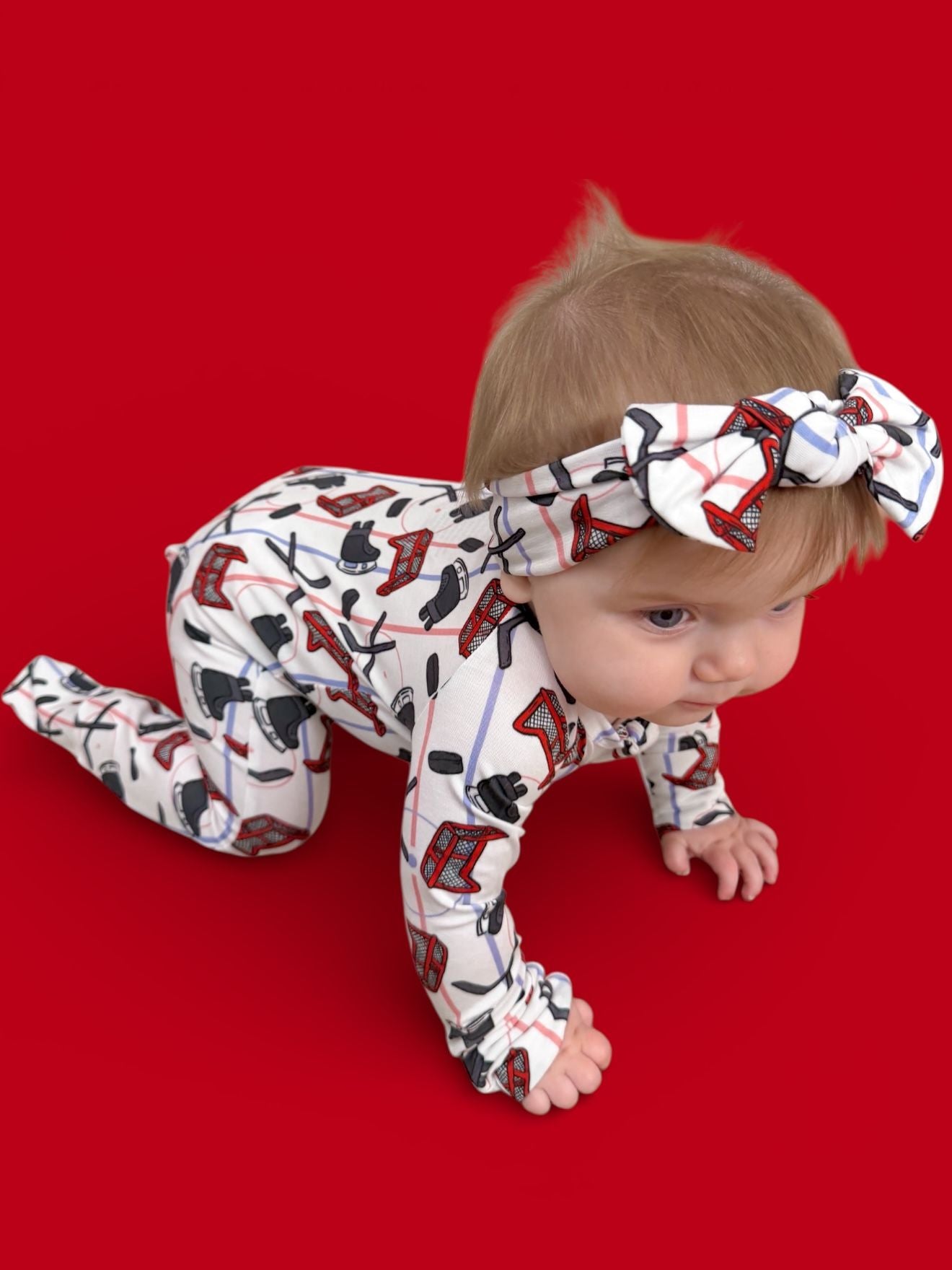 The perfect finishing touch for your little rink star! This adorable bow features our hockey-inspired print—skates, sticks, pucks & nets—on our super soft, stretchy fabric. Cute, comfy, and game-day ready! 🎀🥅