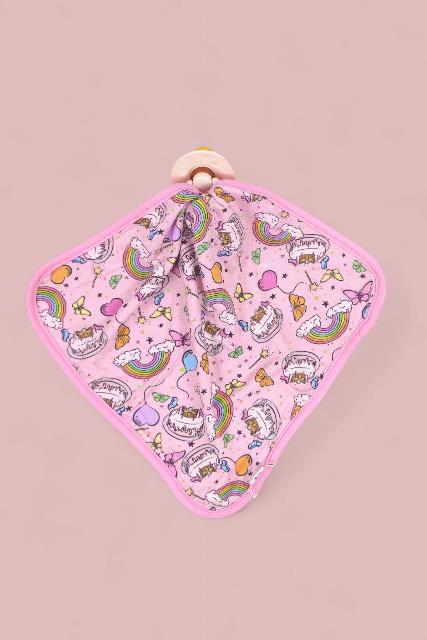 Add a touch of charm and comfort to your little one's special day with the Once Upon a Birthday Dream Lovey! Thoughtfully designed with love and attention to detail, this adorable accessory is the perfect addition to any outfit. Not only does it provide a secure attachment for your baby’s pacifier, but it also adds a stylish and functional touch to keep pacifiers close at hand.