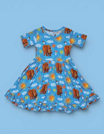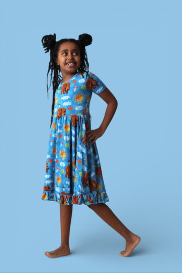 The Bear-y Blue Skies Dream Ruffle Dress is made for carefree days and storybook adventures. Part of the DBLC x The World of Eric Carle collaboration, this cheerful print features friendly bears, sunny skies, fluffy clouds, mushrooms, and leafy details for a bright, outdoorsy look. Crafted from our signature buttery-soft bamboo fabric with sweet ruffle details, it’s as comfy as it is cute.