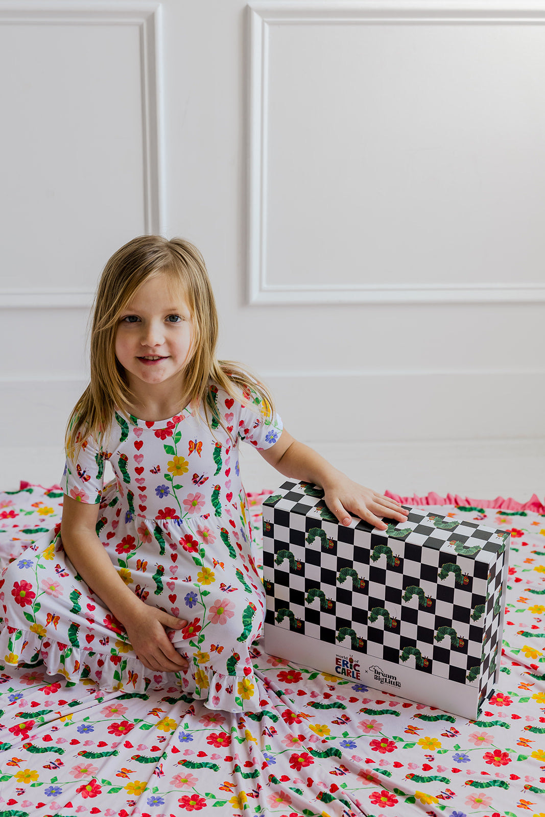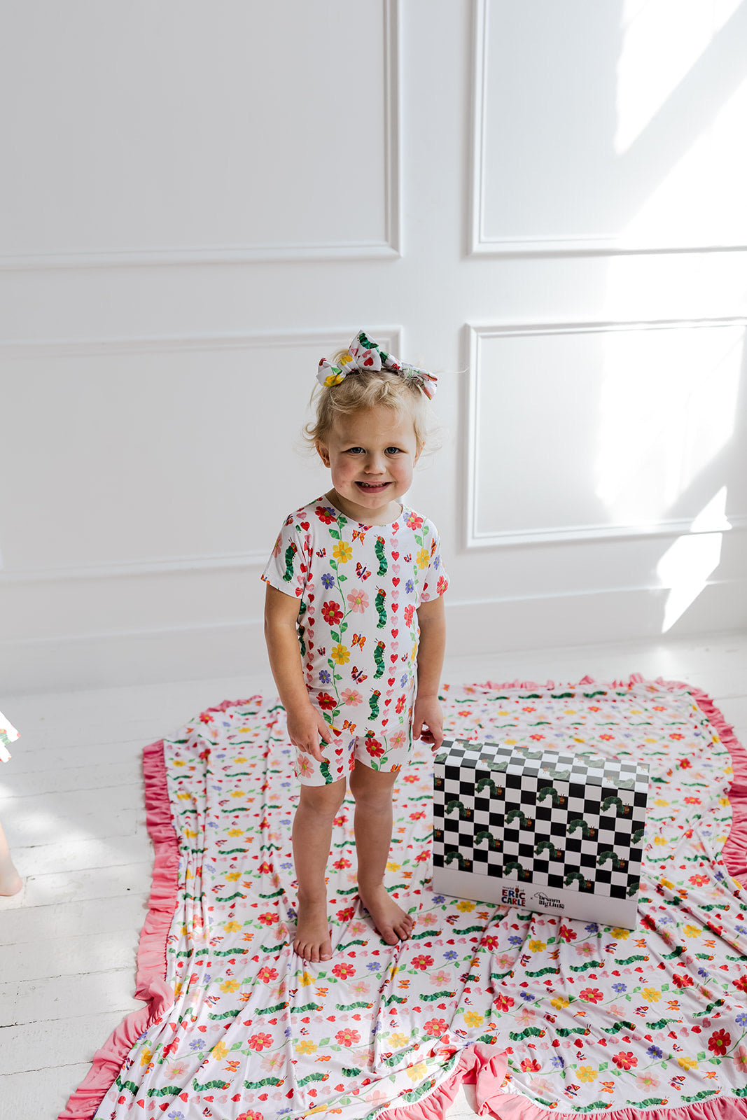 Wrap your little one in cozy comfort with the Lovebug Blooms Dream Ruffle Blanket. Part of the DBLC x The World of Eric Carle collaboration, this whimsical print features blooming florals, hearts, fluttering butterflies, and the beloved hungry caterpillar for a cheerful, storybook-inspired touch. Crafted from our signature buttery-soft bamboo fabric with sweet ruffle trim, it’s perfect for snuggles, naps, and everyday moments.
