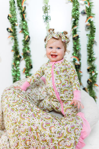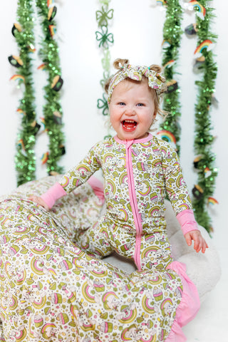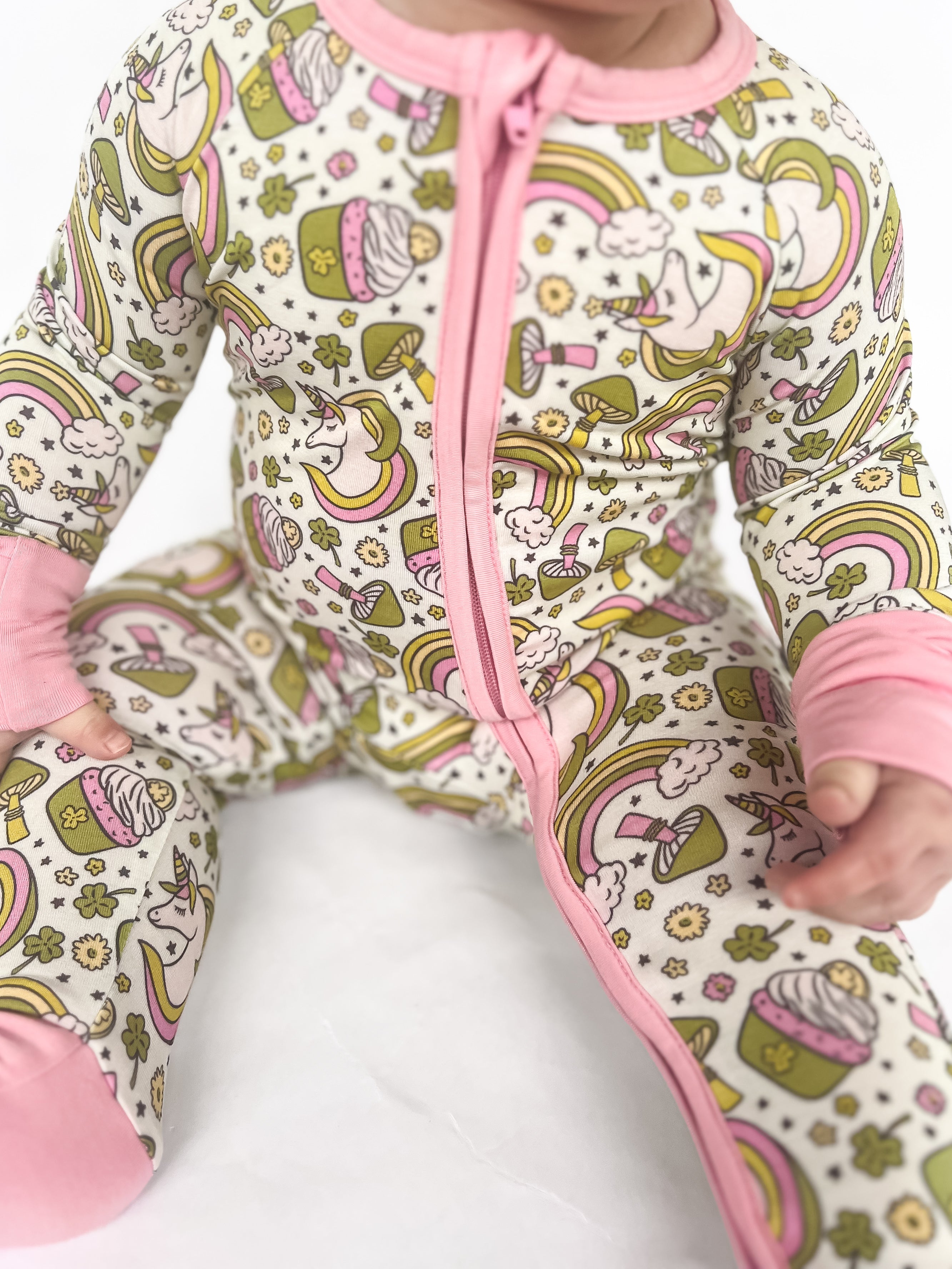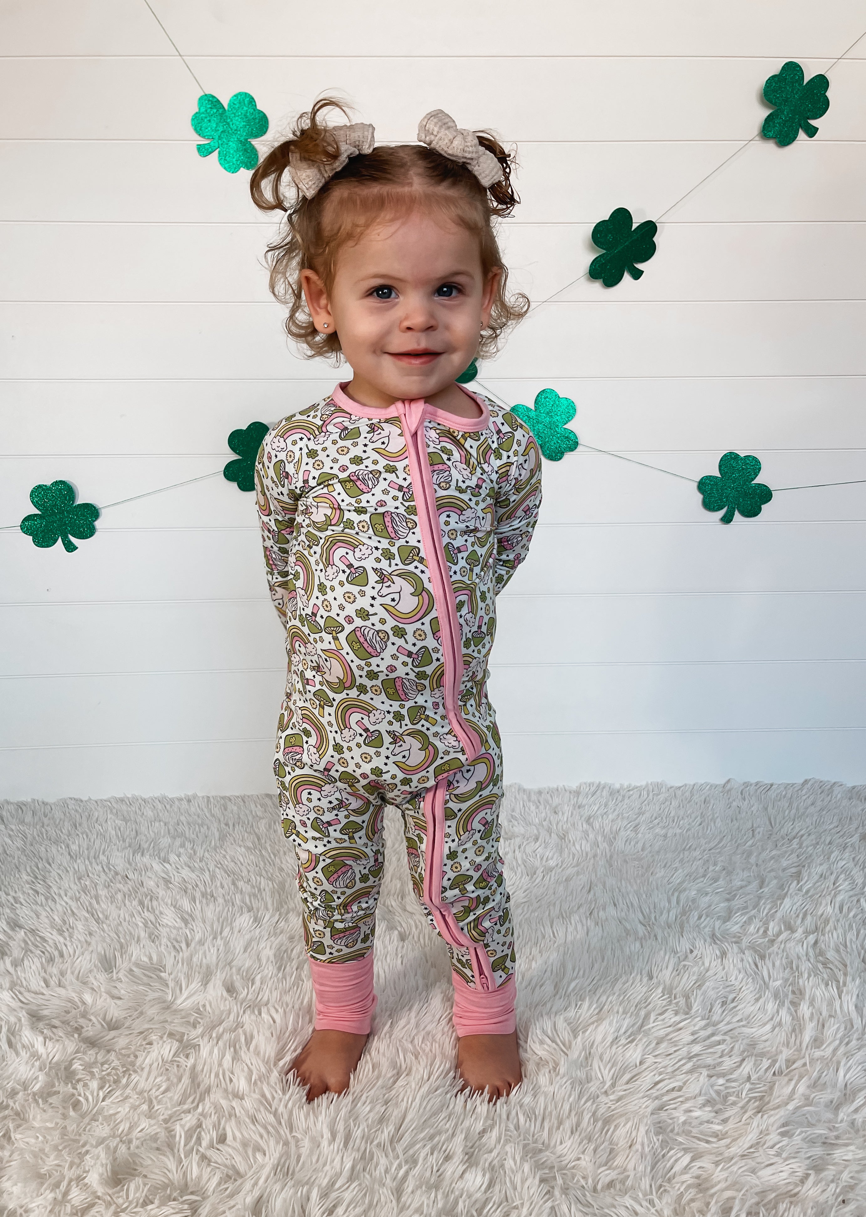 Get lucky with our Luck Of The Unicorn Dream Romper! Made from buttery soft bamboo material, this long sleeve bodysuit features a fun St. Patrick's design with mushrooms, unicorns, and rainbows. Perfect for your little one's magical adventures.