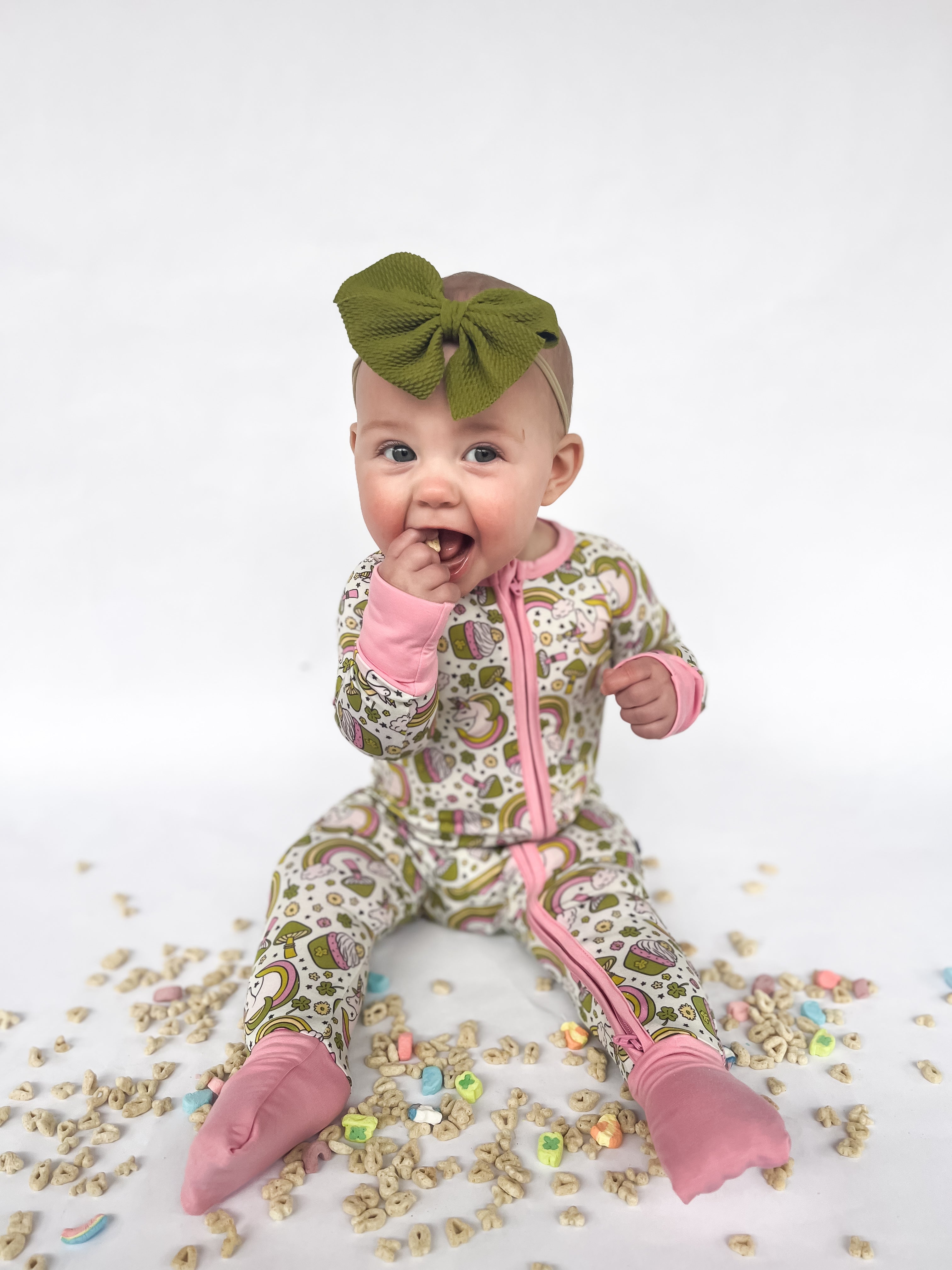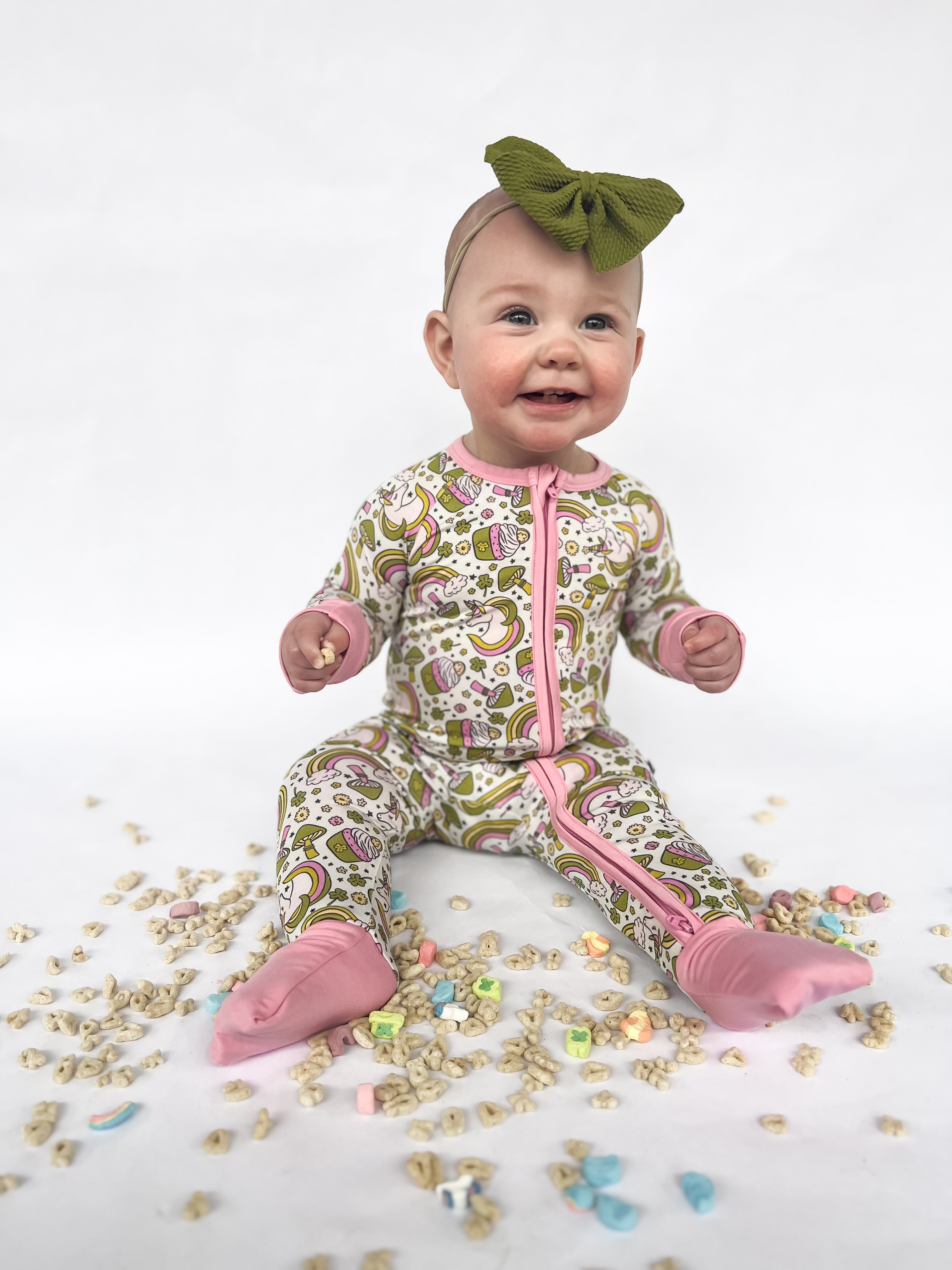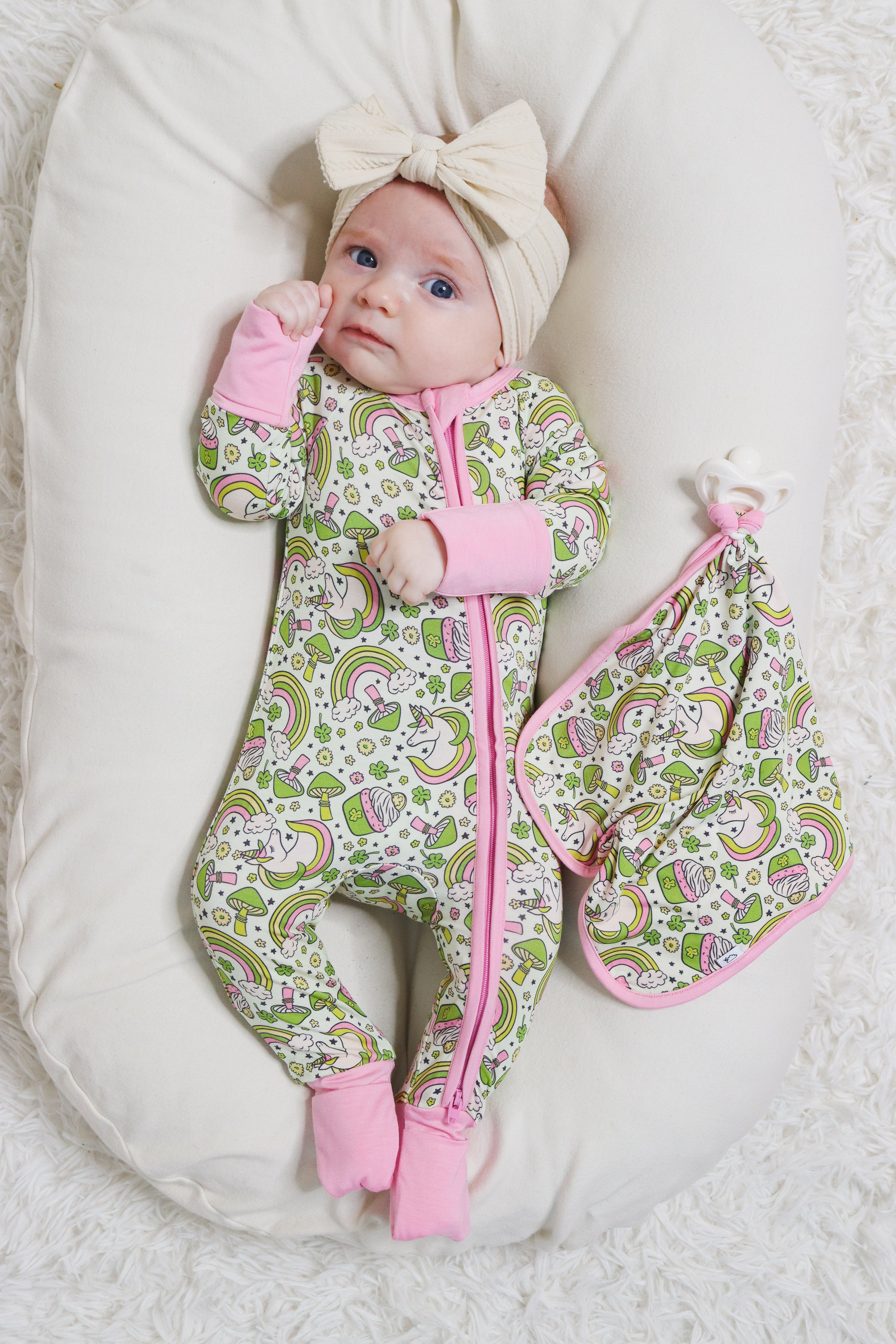 Get lucky with our Luck Of The Unicorn Dream Romper! Made from buttery soft bamboo material, this long sleeve bodysuit features a fun St. Patrick's design with mushrooms, unicorns, and rainbows. Perfect for your little one's magical adventures.